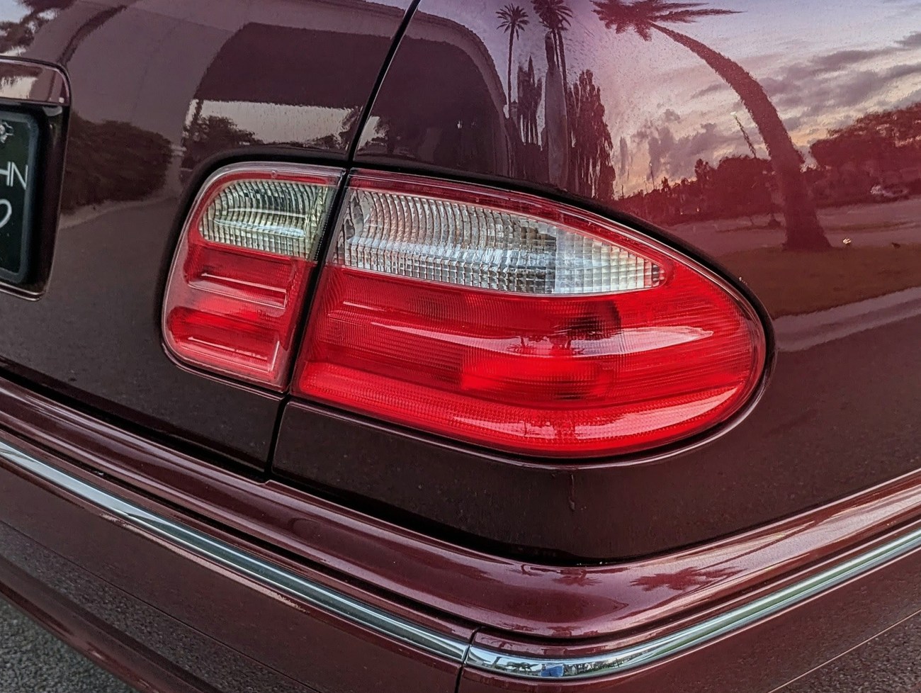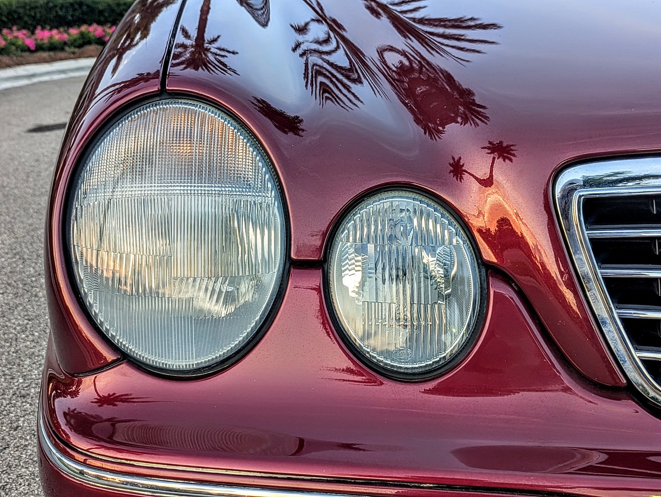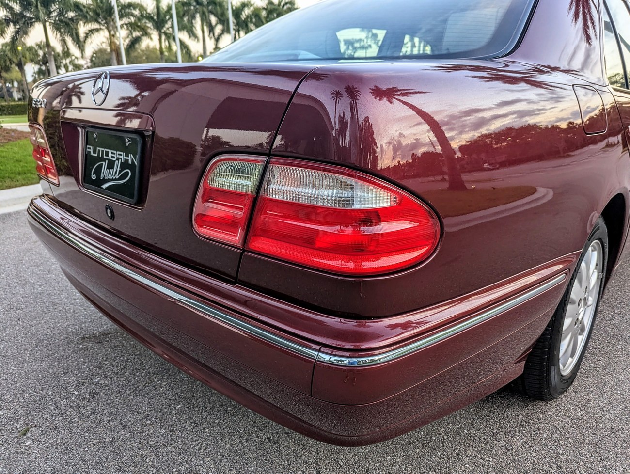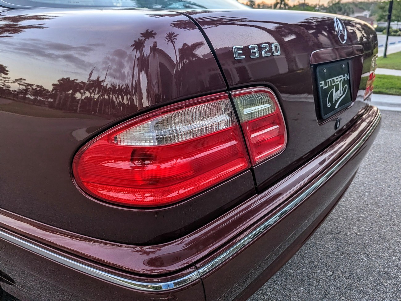 This E320 is finished in Bordeaux Red Metallic (567) and features halogen headlights, fog lights, a glass sunroof with tilt function, rain-sensing windshield mono-wiper, and exit lights for the driver's door. The seller notes only a couple of minor rock chip imperfections on the body which have been detailed in the gallery. The seller states there is no rust on any body panel and the car is believed to wear all original paint.