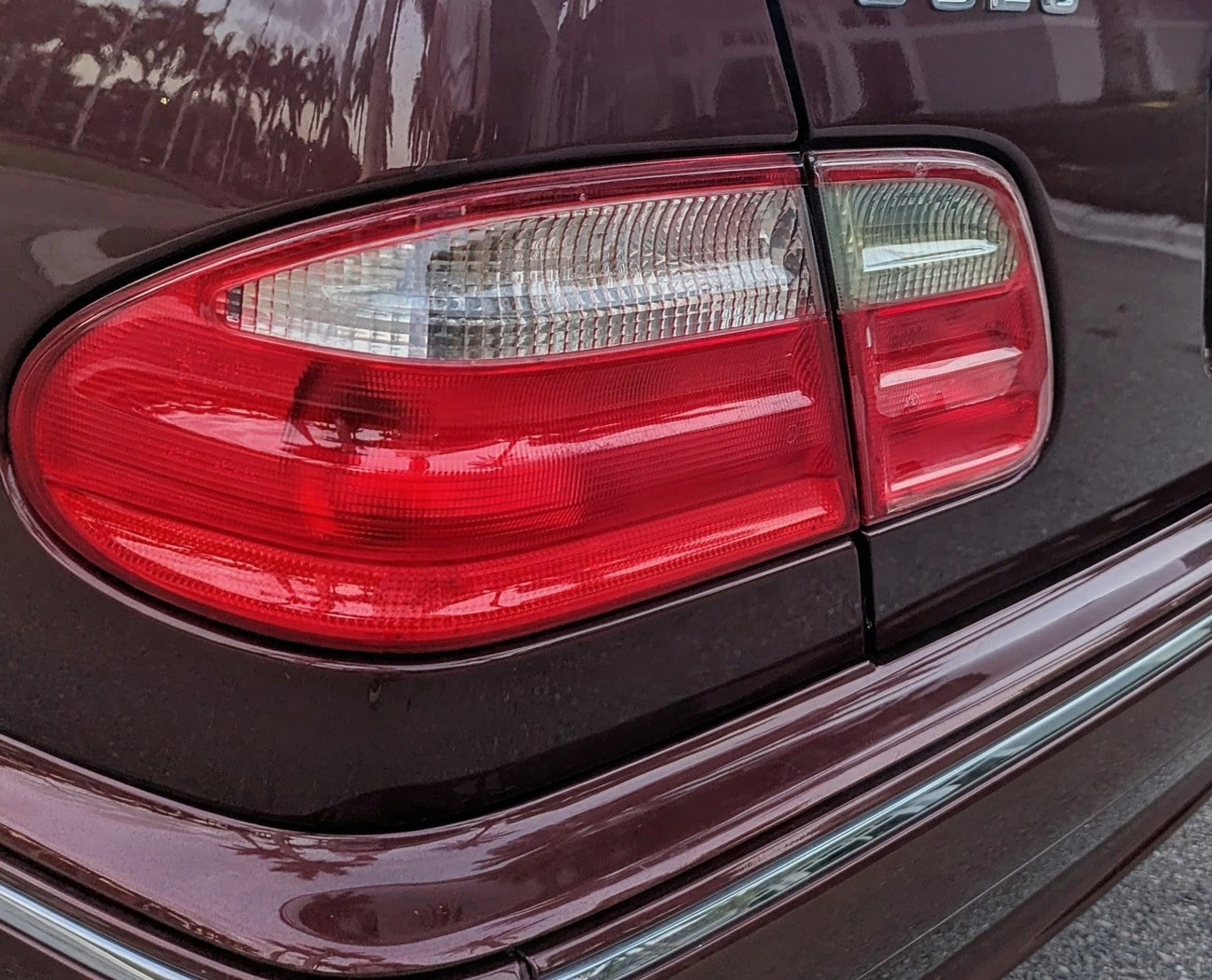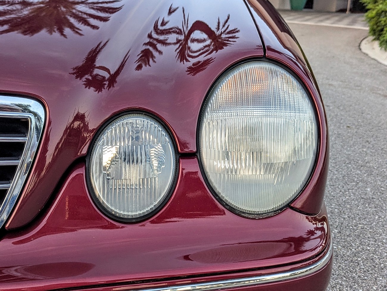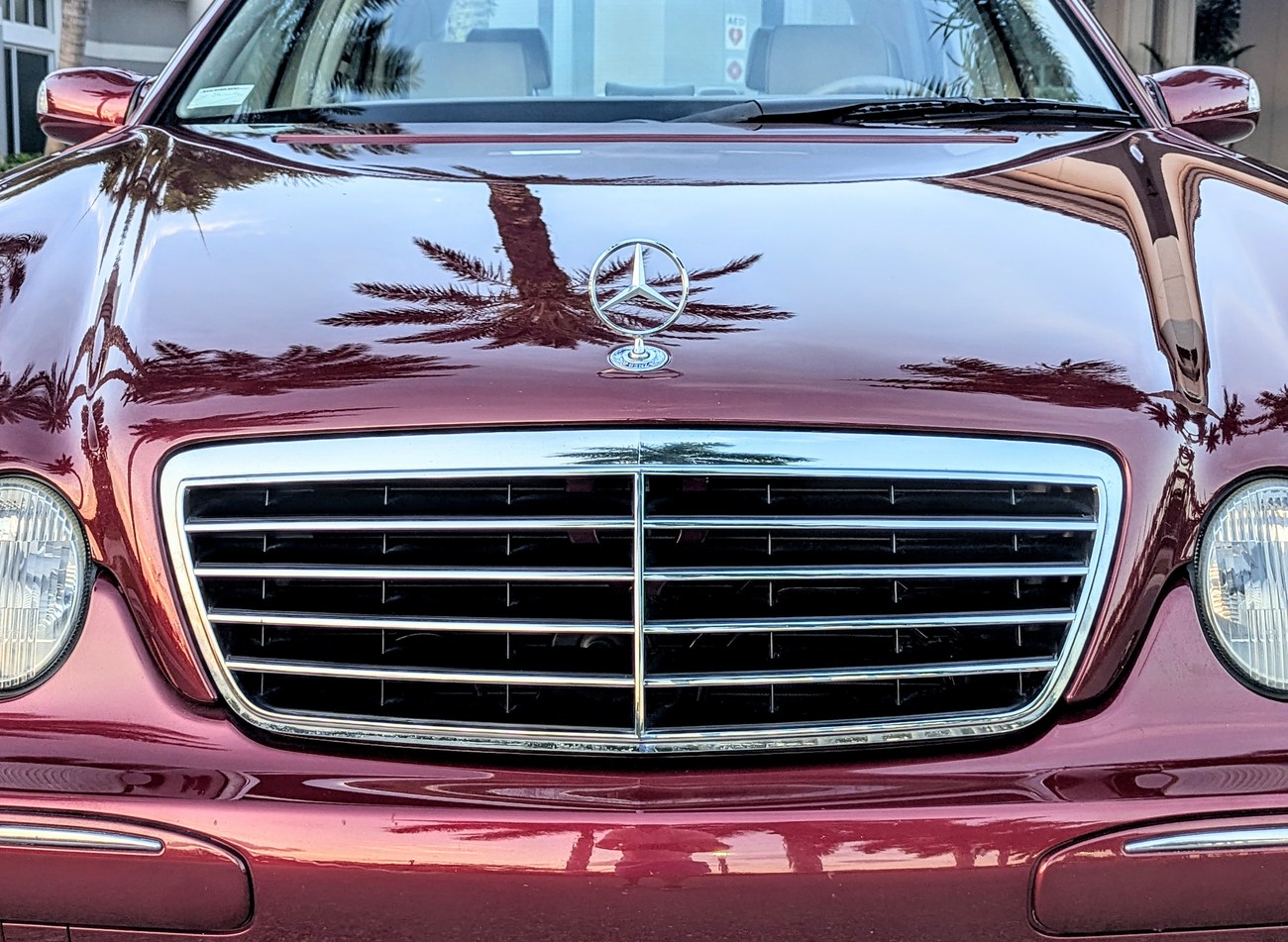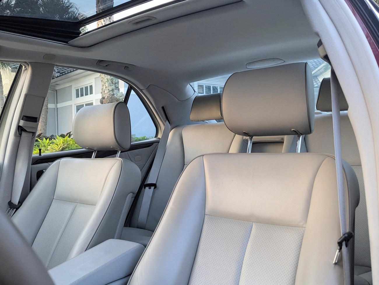 This E320 is finished in Bordeaux Red Metallic (567) and features halogen headlights, fog lights, a glass sunroof with tilt function, rain-sensing windshield mono-wiper, and exit lights for the driver's door. The seller notes only a couple of minor rock chip imperfections on the body which have been detailed in the gallery. The seller states there is no rust on any body panel and the car is believed to wear all original paint.