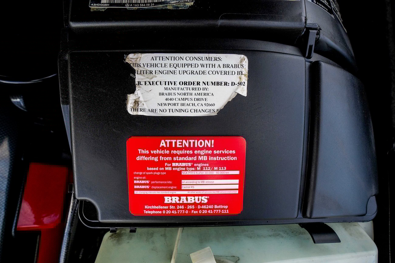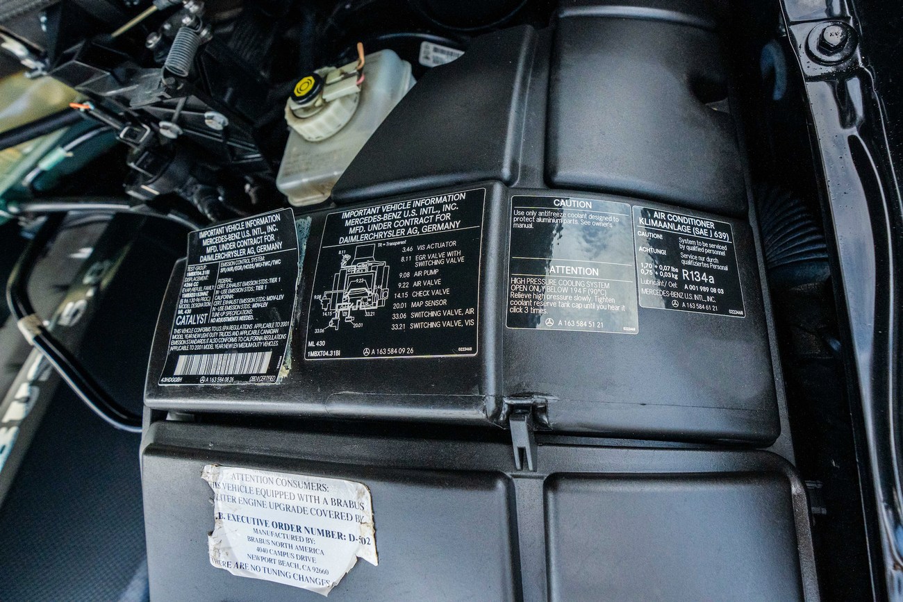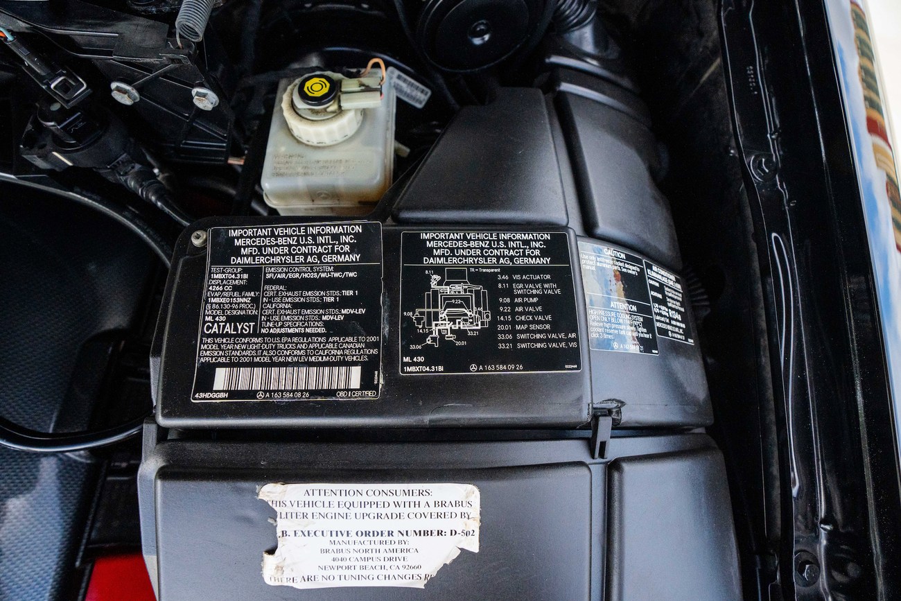 This ML is powered by a 5.8-liter M113 V8 which is reported to produce 400 horsepower and 427 lb-ft of torque. BRABUS reworked the engine with a custom crankshaft, pistons, and connecting rods. Additional engine modifications are said to include ported and polished cylinder heads with revised camshafts and larger valves as well as a full exhaust system and custom tune. Power is sent to all four wheels through a 5-speed automatic transmission which can be shifted manually. A major service less than 500 miles ago in 2019 totalled over $8k and included a flushing of the brake fluid, differential, transfer case, transmission fluid, and an oil change along with new front brake pads and rotors, lower ball joints, serpentine belt, valve cover gaskets, and engine air filter. In preparation for the sale, the seller performed a fresh oil service, installed new shifter bushings, and performed an AC service.