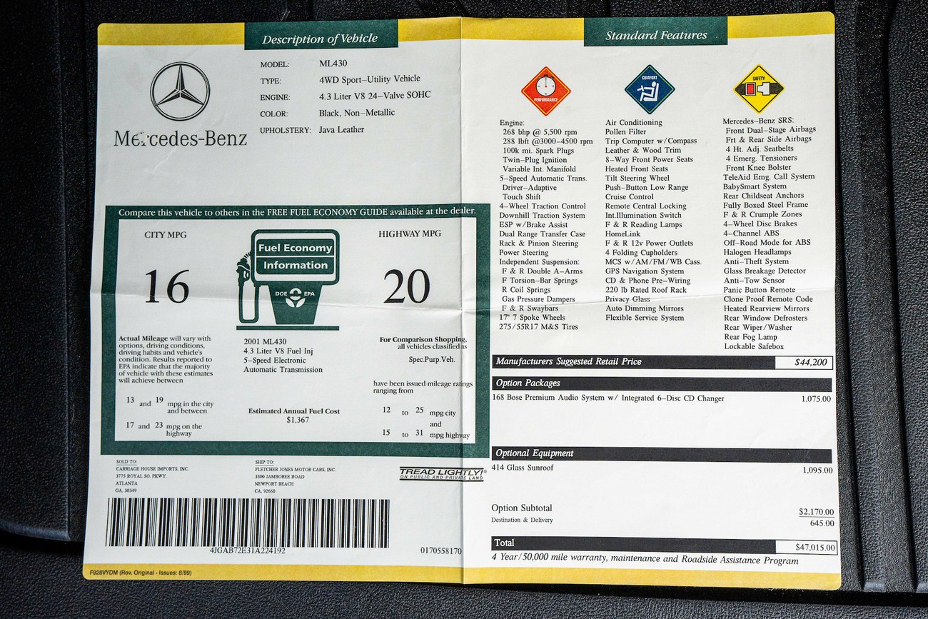 This 2001 Mercedes-Benz ML58 BRABUS began life as a ML430 and underwent modification by BRABUS North America from 2001-2003. Finished in Black (040) over Saffron Leather (264), power is provided by a bored and stroked 5.8-liter V8 paired with a five-speed automatic transmission which sends power to all four wheels through a two-speed transfer case. Other BRABUS modifications include body and trim accents, lighting, 20" wheels, exhaust, interior, and more. In preparation for the sale, this ML received new shifter bushings, an AC service, and an oil and filter change. This ML58 now has just under 78k miles and is offered out of a private collection with partial service records, a window sticker, books and manuals, a clean Carfax report, and a Minnesota title.