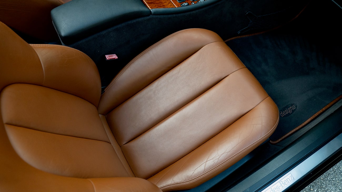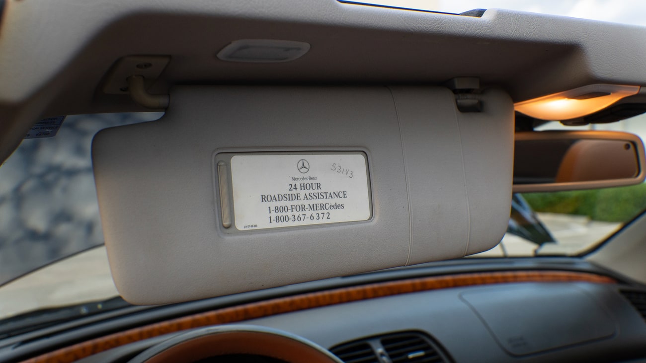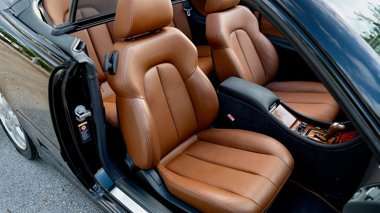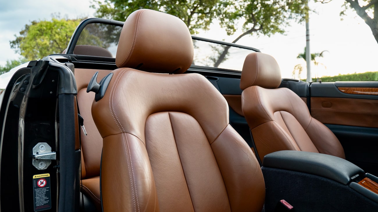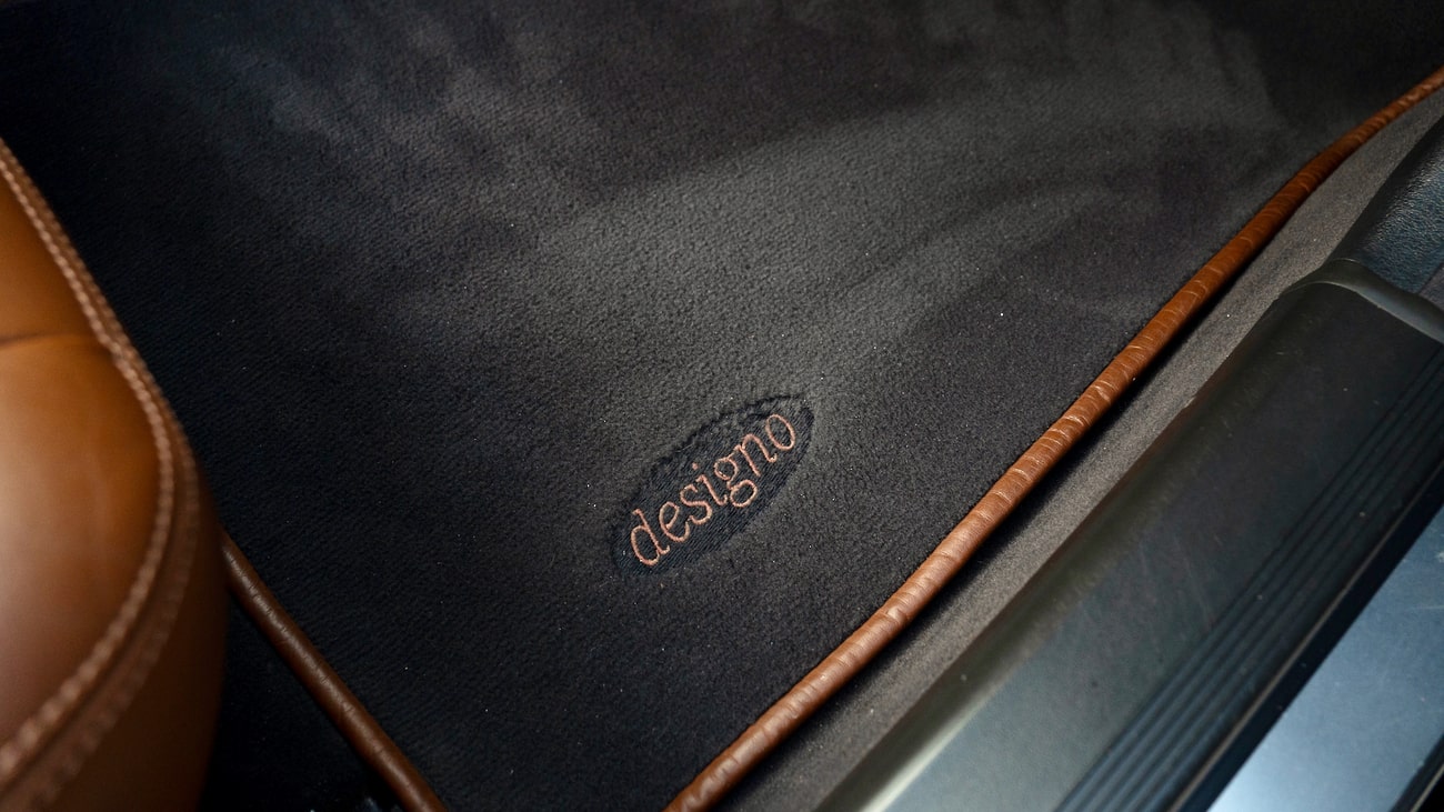 The seats are finished in designo Light Brown Nappa (X35) Leather with matching door card inserts, steering wheel, and shift knob. Original designo Curled Maple wood trim lines the center console, dash, and doors. Interior features include power windows, automatic climate control, electrically adjustable and heated front seats with position memory, cruise control, Bose audio, and a 6-disc CD changer. Matching designo leather-trimmed floor mats are shown in the footwells and the soft top headliner remains in good condition. All leather surfaces feature a double-stitched seam and the shift knob features the designo insignia. An OEM draft deflector is included and pictured currently installed behind the front seats.