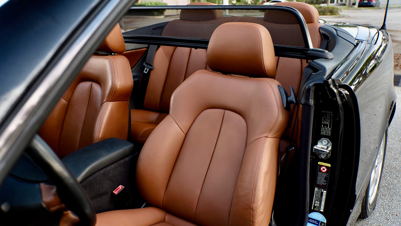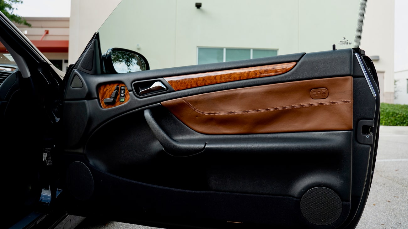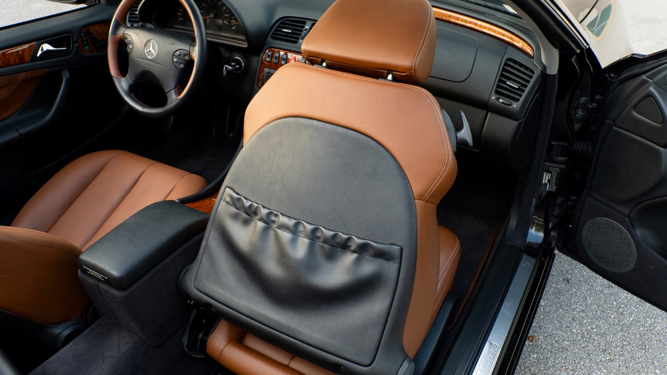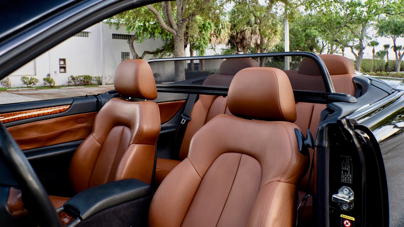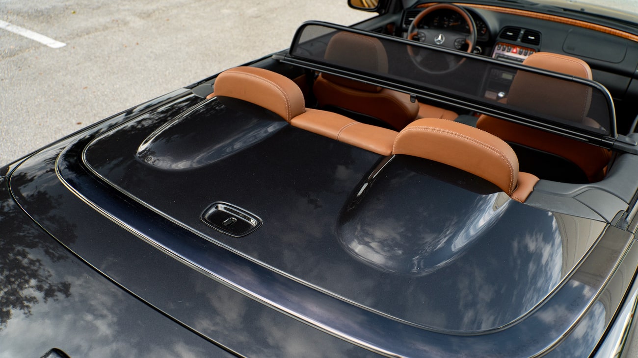 The seats are finished in designo Light Brown Nappa (X35) Leather with matching door card inserts, steering wheel, and shift knob. Original designo Curled Maple wood trim lines the center console, dash, and doors. Interior features include power windows, automatic climate control, electrically adjustable and heated front seats with position memory, cruise control, Bose audio, and a 6-disc CD changer. Matching designo leather-trimmed floor mats are shown in the footwells and the soft top headliner remains in good condition. All leather surfaces feature a double-stitched seam and the shift knob features the designo insignia. An OEM draft deflector is included and pictured currently installed behind the front seats.