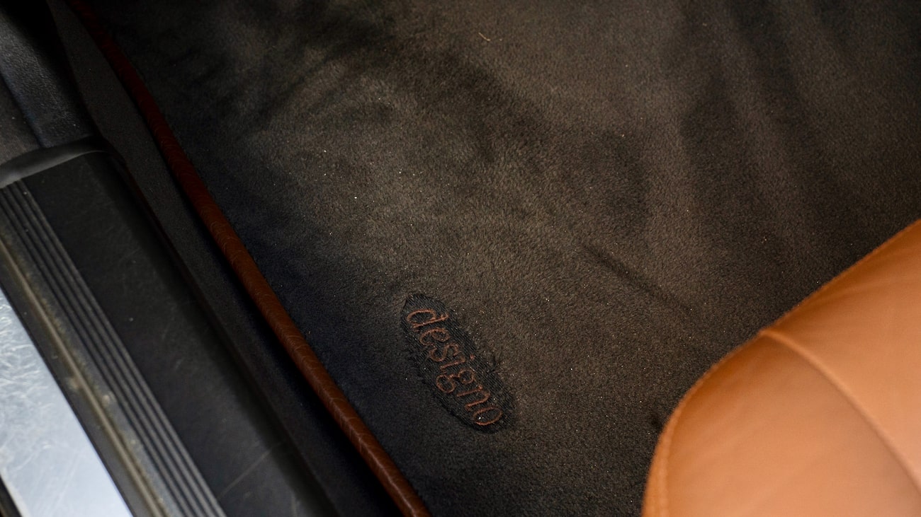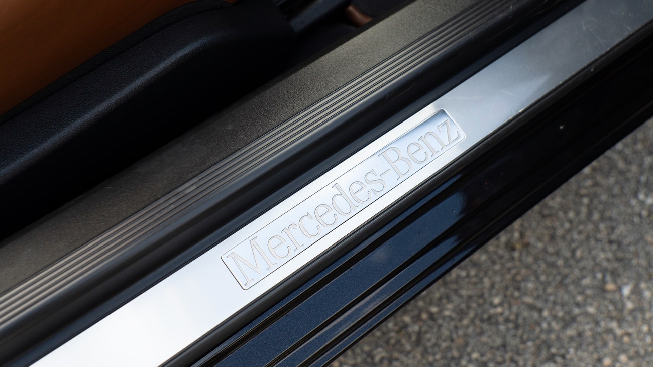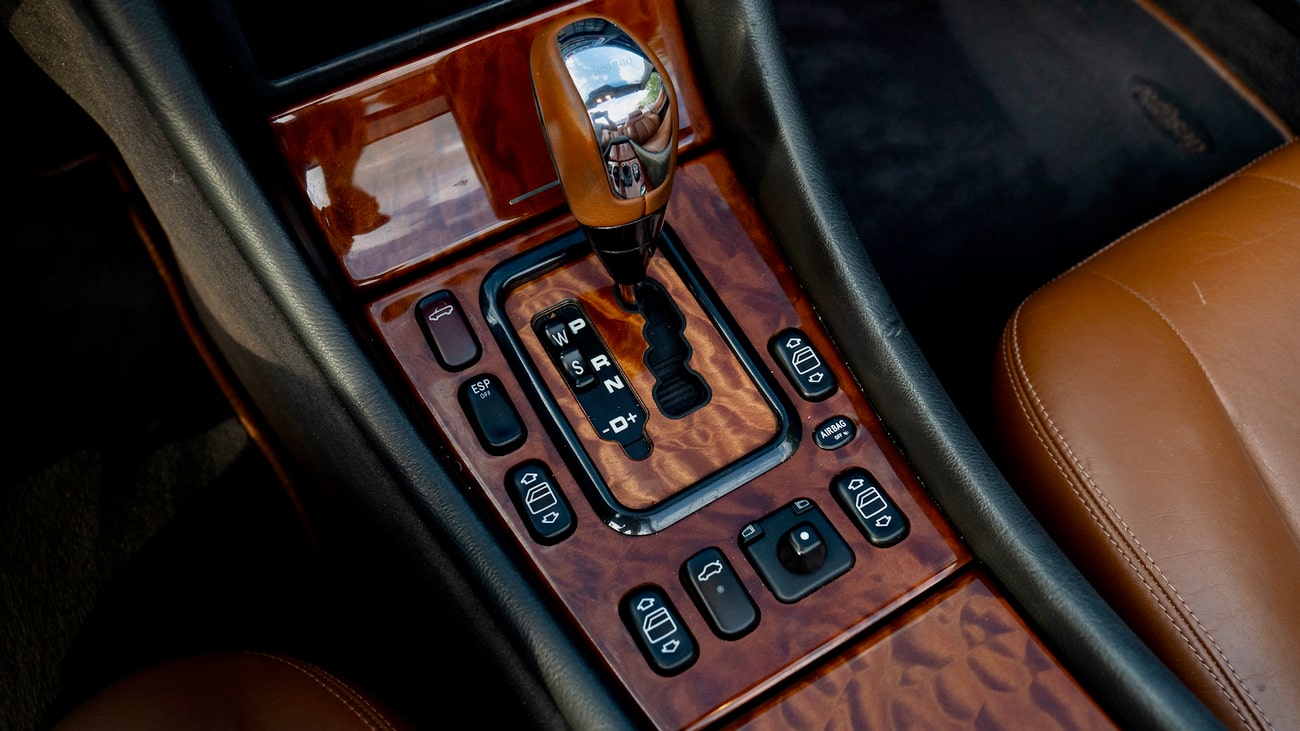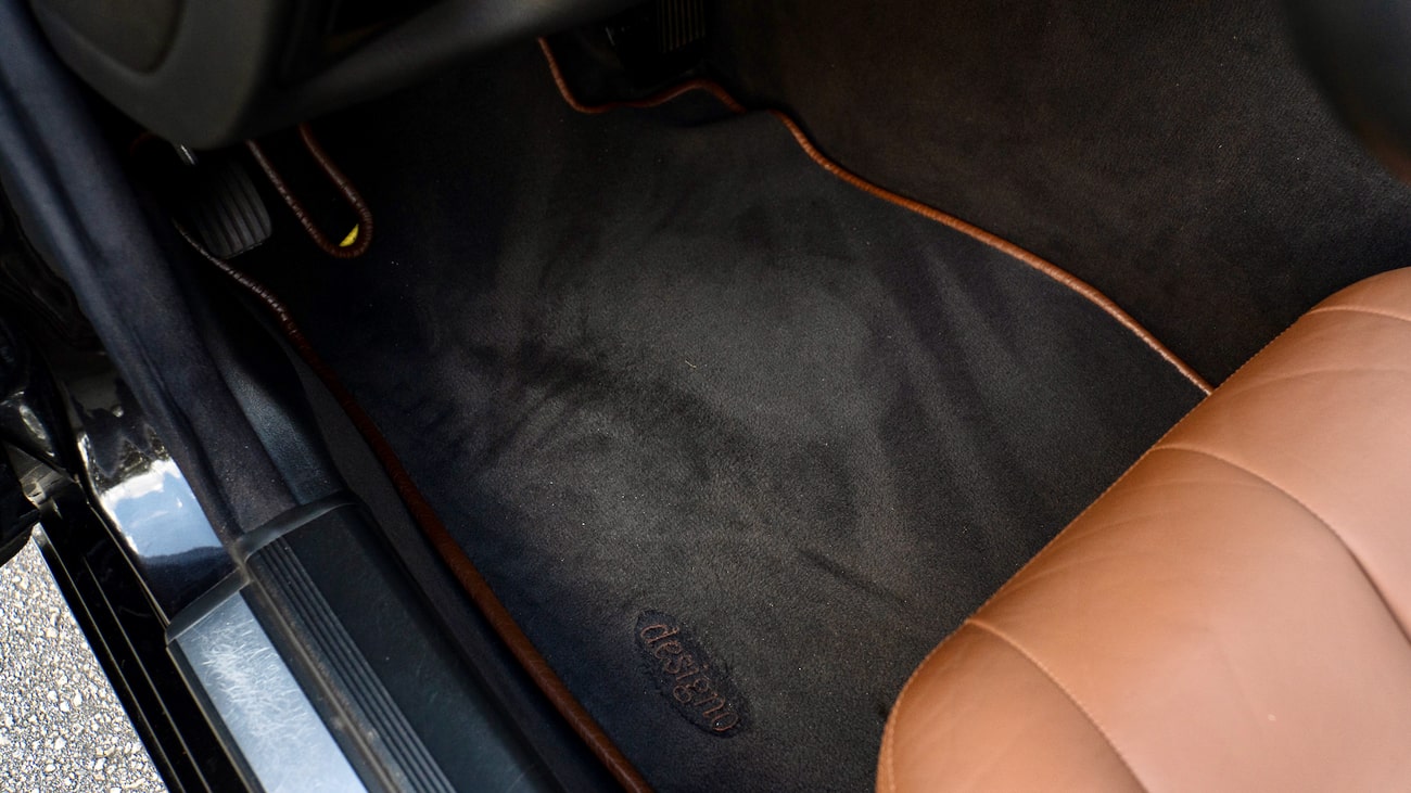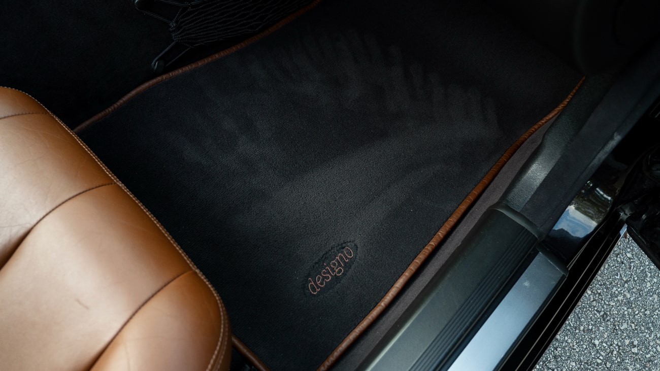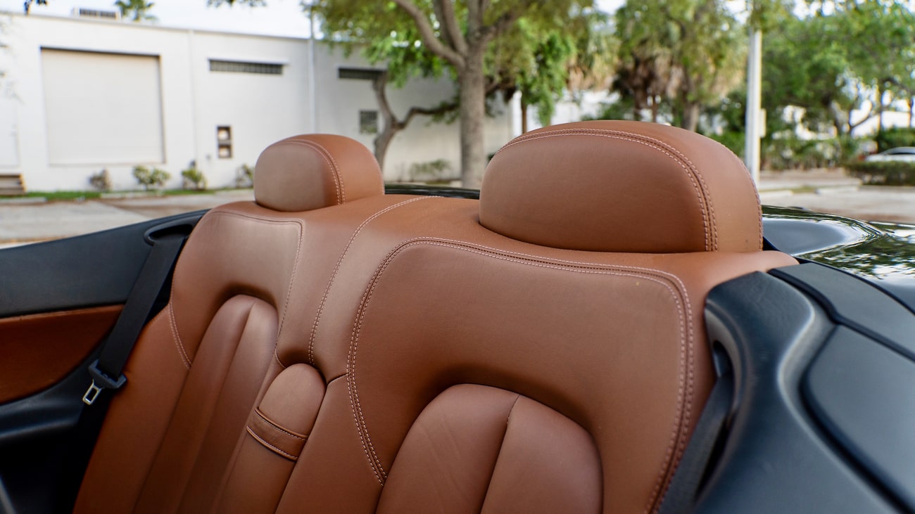 The seats are finished in designo Light Brown Nappa (X35) Leather with matching door card inserts, steering wheel, and shift knob. Original designo Curled Maple wood trim lines the center console, dash, and doors. Interior features include power windows, automatic climate control, electrically adjustable and heated front seats with position memory, cruise control, Bose audio, and a 6-disc CD changer. Matching designo leather-trimmed floor mats are shown in the footwells and the soft top headliner remains in good condition. All leather surfaces feature a double-stitched seam and the shift knob features the designo insignia. An OEM draft deflector is included and pictured currently installed behind the front seats.