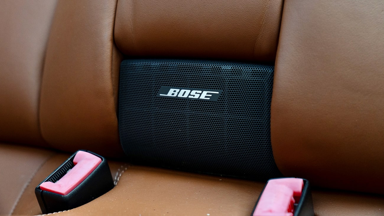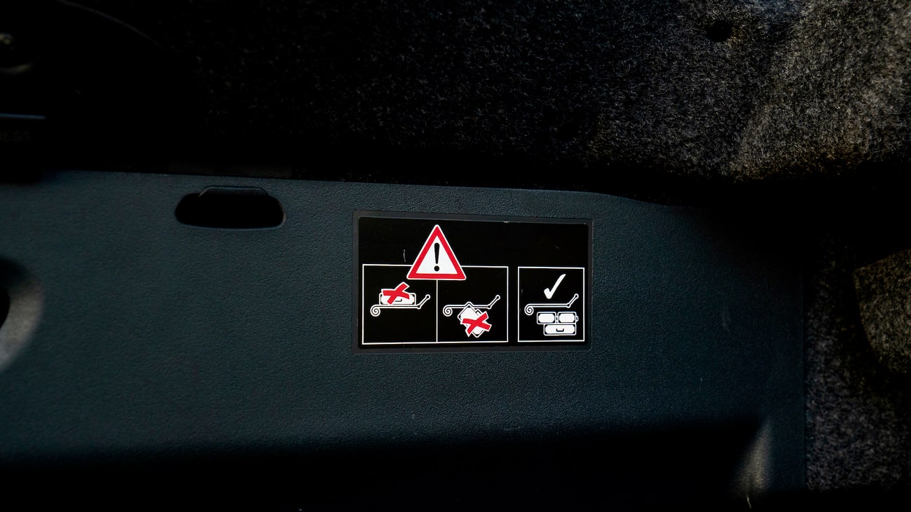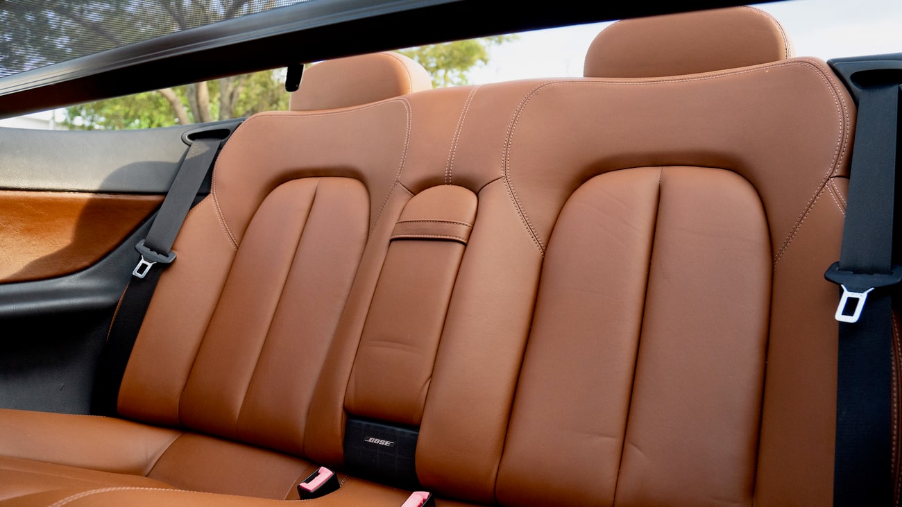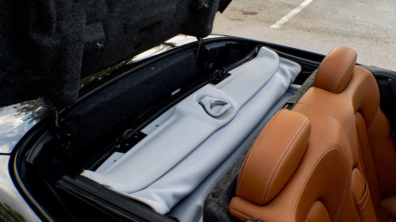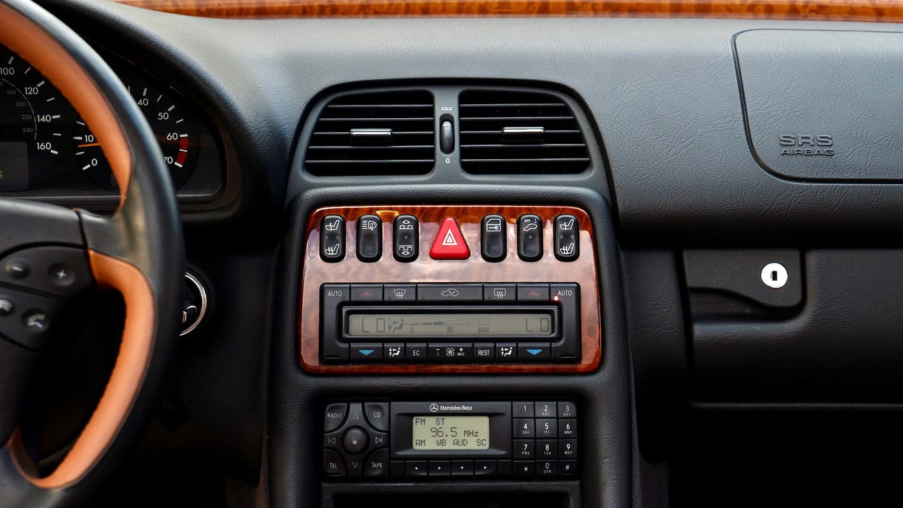 The seats are finished in designo Light Brown Nappa (X35) Leather with matching door card inserts, steering wheel, and shift knob. Original designo Curled Maple wood trim lines the center console, dash, and doors. Interior features include power windows, automatic climate control, electrically adjustable and heated front seats with position memory, cruise control, Bose audio, and a 6-disc CD changer. Matching designo leather-trimmed floor mats are shown in the footwells and the soft top headliner remains in good condition. All leather surfaces feature a double-stitched seam and the shift knob features the designo insignia. An OEM draft deflector is included and pictured currently installed behind the front seats.