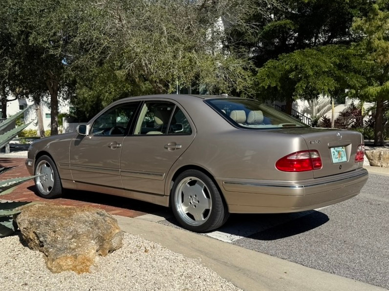 This 2002 Mercedes-Benz E430 shows California registration since new, three owners, and 144k original miles on the odometer. The most recent owner purchased the car on The MB Market in 2024. Finished in Travertine Beige Metallic (693) over Java Leather (214), power is provided by a 4.3-liter V8 mated to a five-speed automatic transmission driving the rear wheels. Equipment includes power adjustable heated front seats, a power tilt/slide glass sunroof, dual-zone automatic climate control, cruise control, power and auto-dimming mirrors, rain-sensing wipers, Bose audio and a power tilt/telescope steering column. The included Carfax report shows emissions tests since new. This E430 is now offered for sale by the current owner with both original keys, the original tool kit, manufacturer’s literature, and a clean California title in the seller’s name.