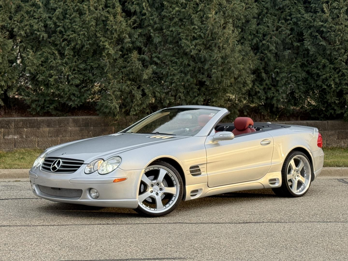 This 2006 Mercedes-Benz SL500 was sold out of Atlanta, Georgia to the first owner who then moved to Ashville, North Carolina in 2008 where it stayed until 2012. It shows subsequent registration in Tennessee, Missouri, and Oklahoma with just over 35k miles. Finished in Iridium Silver Metallic (775) over Red Leather (207), power is provided by a 5.0-liter V8 mated to a seven-speed automatic transmission. This R230 has a full Lorinser body kit, wheels, and exhaust installed when the car was new. Equipment includes a power-folding panoramic hardtop, Active Body Control, heated and ventilated multicontour power seats with memory, Black Ash wood, bi-xenon headlights, Premium surround sound and aftermarket headunit with bluetooth capabilities. Recent maintenance performed in preparation for the sale includes an engine oil and filter change and new locking hydraulic rams. This V8 roadster is now offered for sale by the selling dealer with the original tool kit, one key, a clean Carfax report and a clean Oklahoma title.