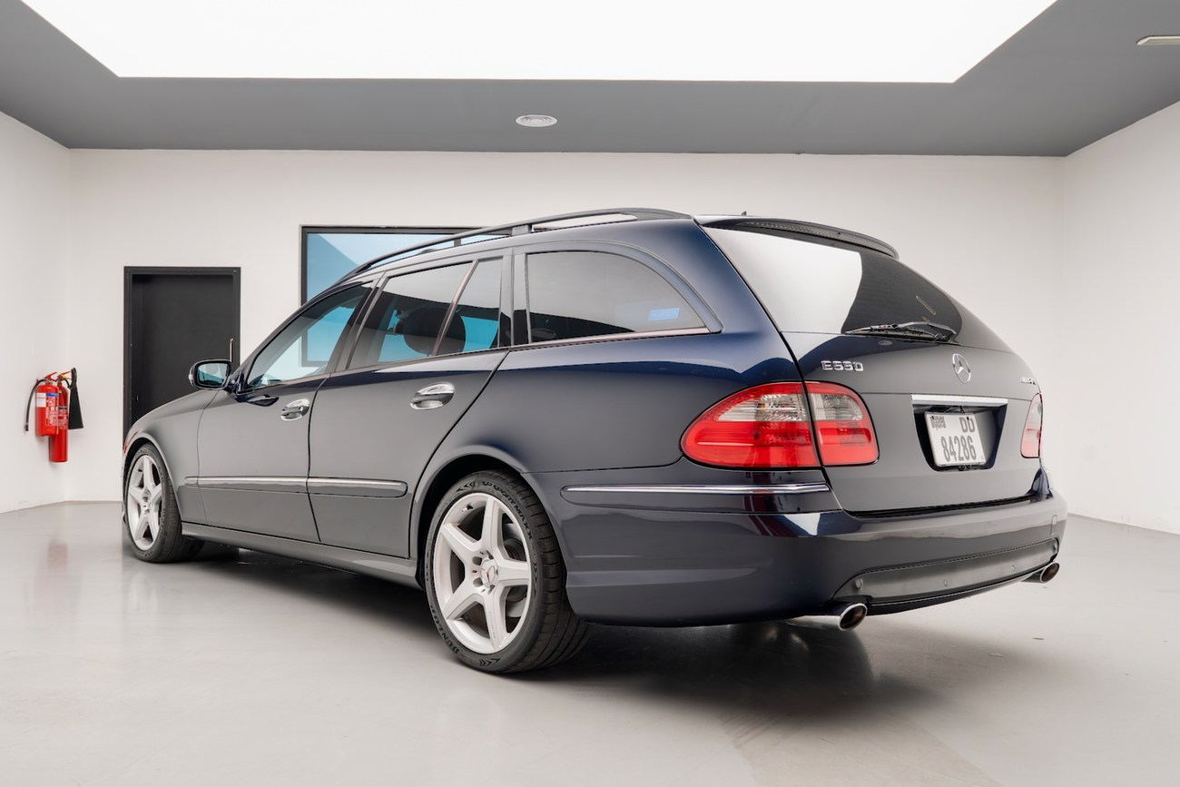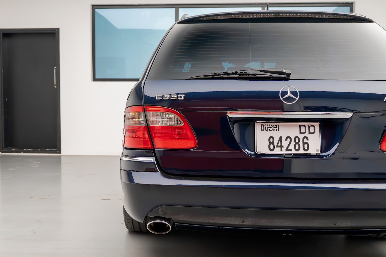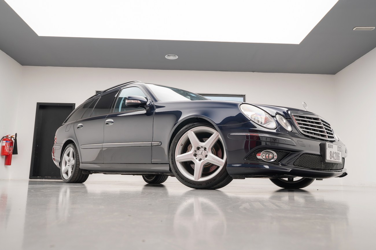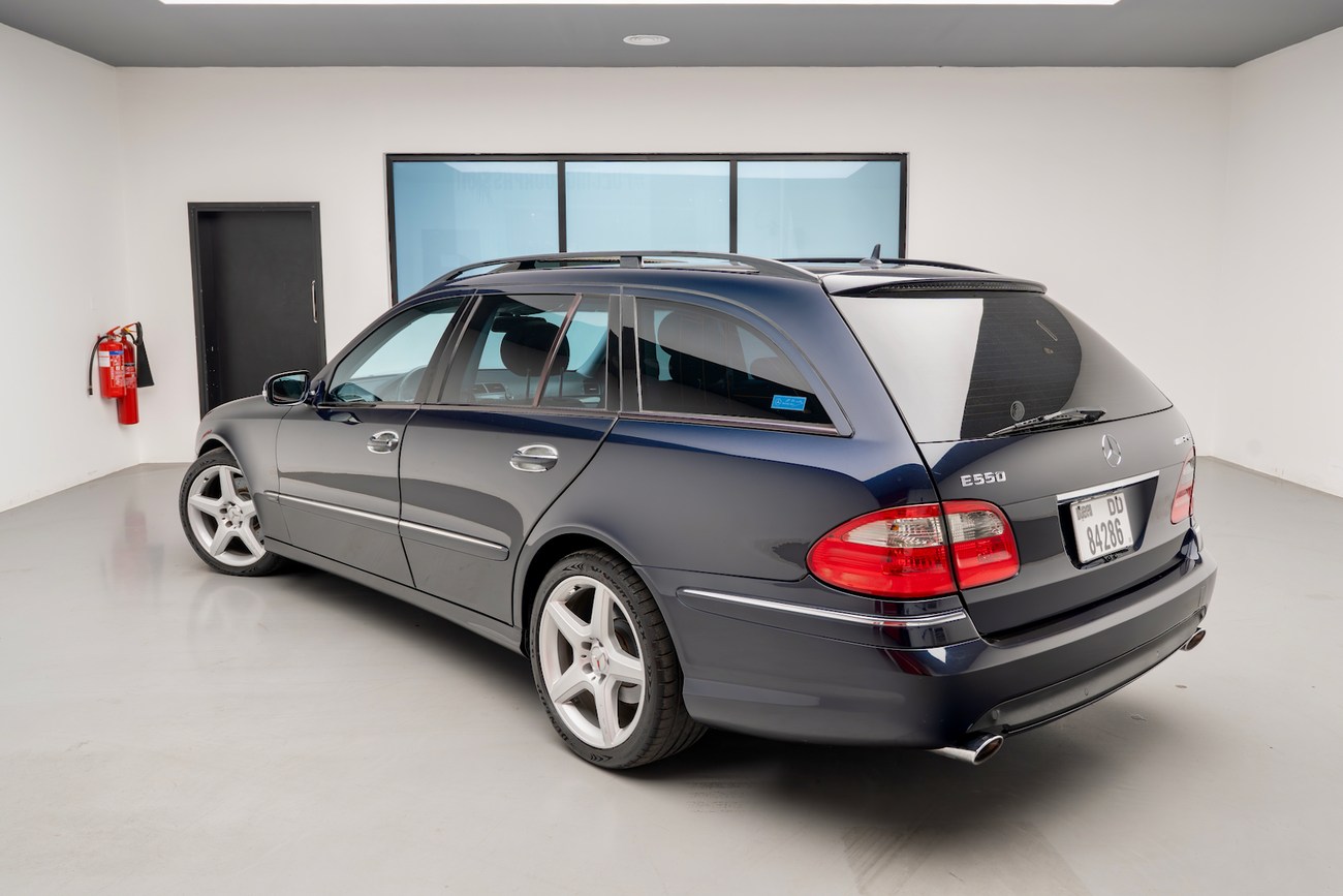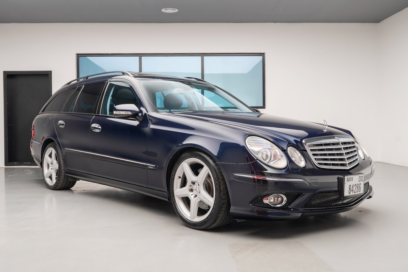 This 2007 Mercedes-Benz E550 Wagon was first sold new in Japan as a left-hand drive example and later exported to the United Arab Emirates where it currently resides with only 122k km (~75k miles). Finished in Tanzanite Blue Metallic (359) over Anthracite Leather (821), power is provided by a 5.5-liter V8 mated with a seven-speed automatic driving the rear wheels. Factory equipment includes heated front seats and mirrors, a glass sunroof, bi-xenon headlamps, dual-zone climate control, Harman Kardon audio, Parktronic, and the AMG Sport Package. Recent service includes new Dunlop tires in June 2025, along with a transmission service and oil change in October 2025 in preparation for the sale. This rare E-Class wagon is offered for sale in Dubai, UAE with one key, the factory tool roll, recent service records, and a clean UAE RTA Certificate/title. The seller can assist buyers with worldwide shipping needs.