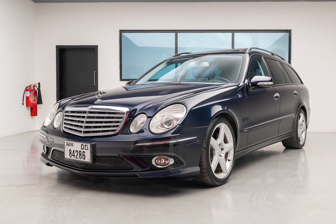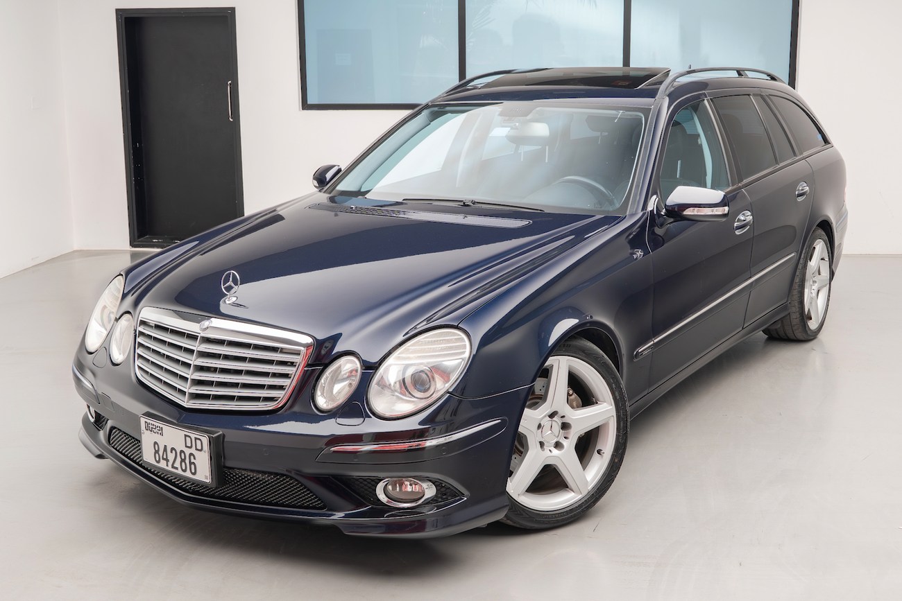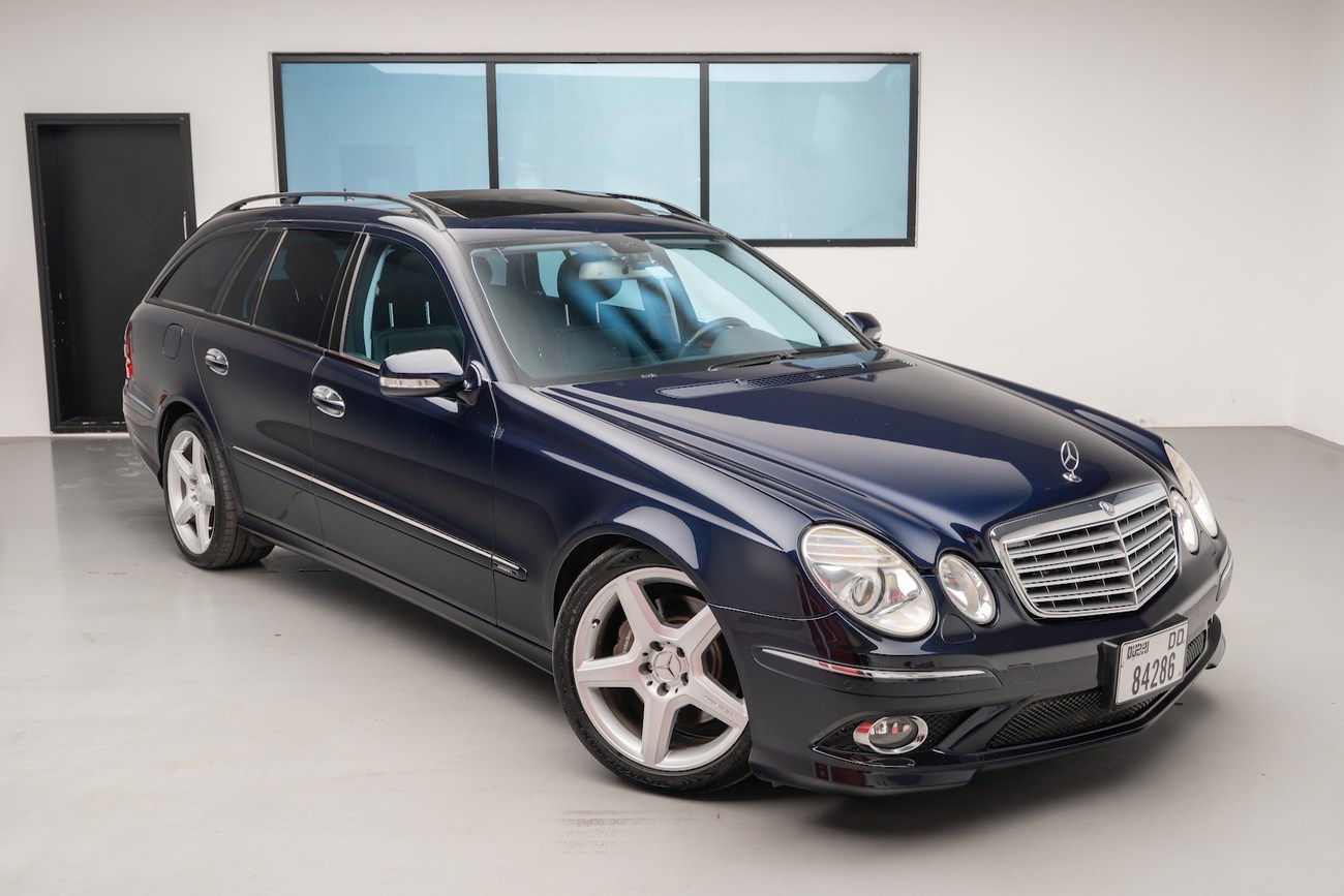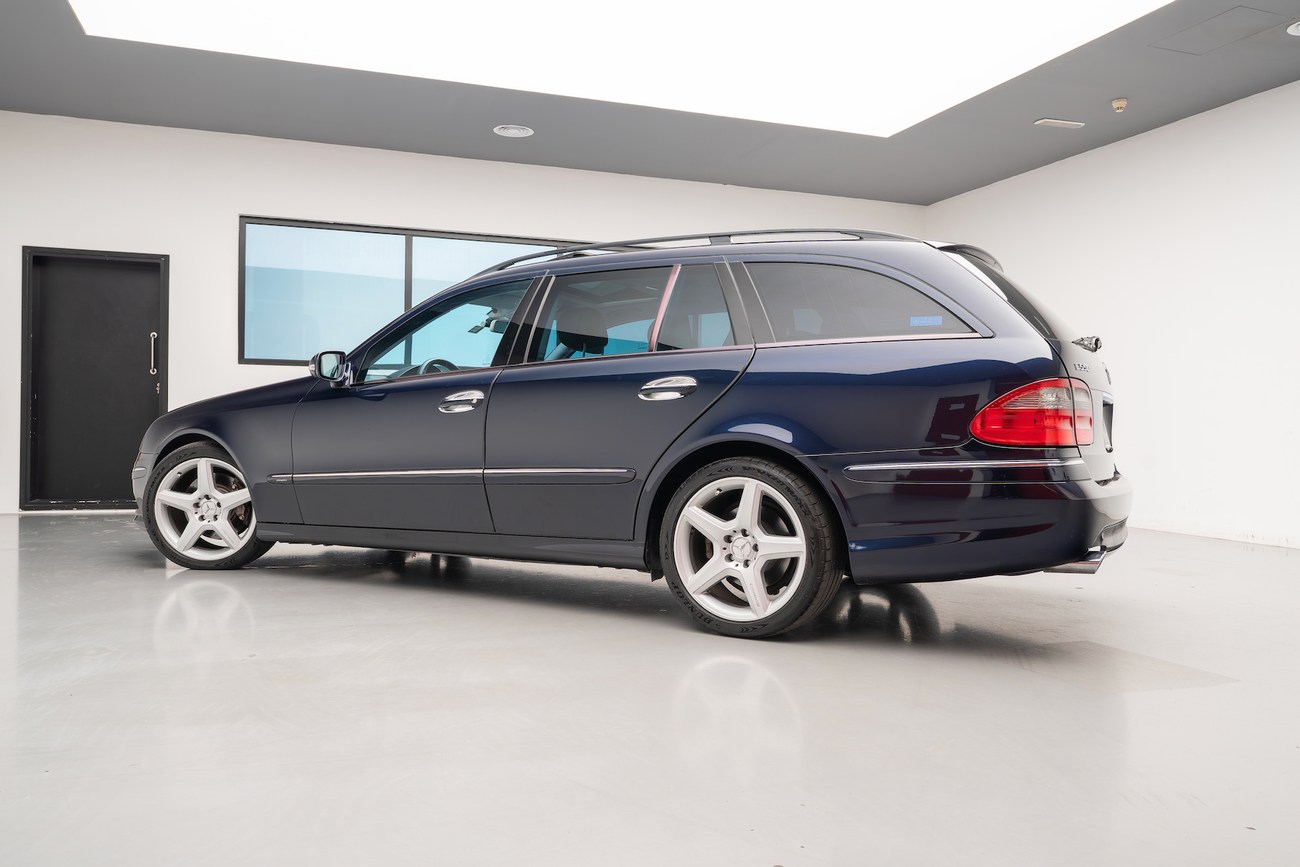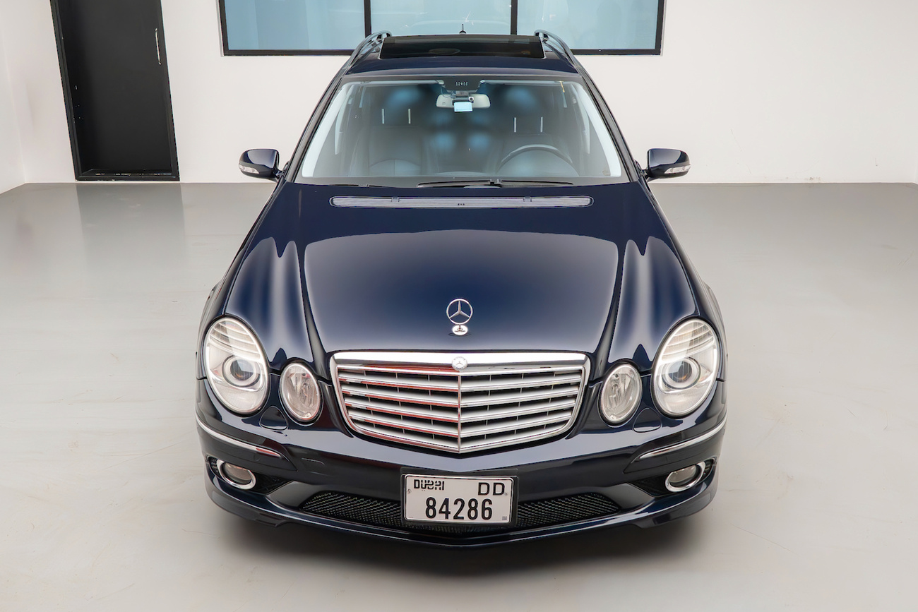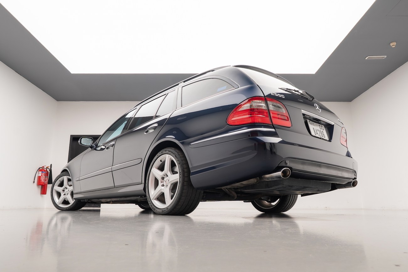 This 2007 Mercedes-Benz E550 Wagon was first sold new in Japan as a left-hand drive example and later exported to the United Arab Emirates where it currently resides with only 122k km (~75k miles). Finished in Tanzanite Blue Metallic (359) over Anthracite Leather (821), power is provided by a 5.5-liter V8 mated with a seven-speed automatic driving the rear wheels. Factory equipment includes heated front seats and mirrors, a glass sunroof, bi-xenon headlamps, dual-zone climate control, Harman Kardon audio, Parktronic, and the AMG Sport Package. Recent service includes new Dunlop tires in June 2025, along with a transmission service and oil change in October 2025 in preparation for the sale. This rare E-Class wagon is offered for sale in Dubai, UAE with one key, the factory tool roll, recent service records, and a clean UAE RTA Certificate/title. The seller can assist buyers with worldwide shipping needs.
