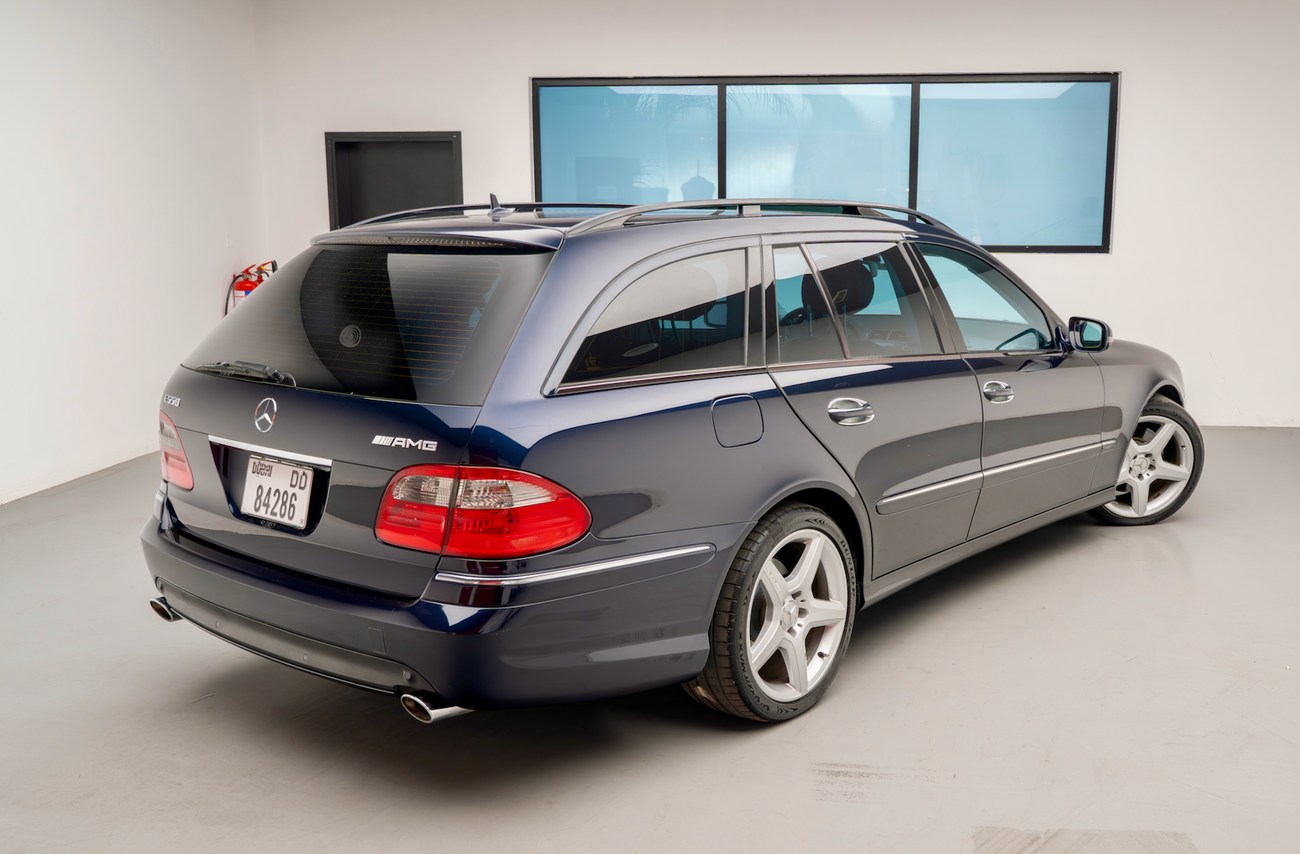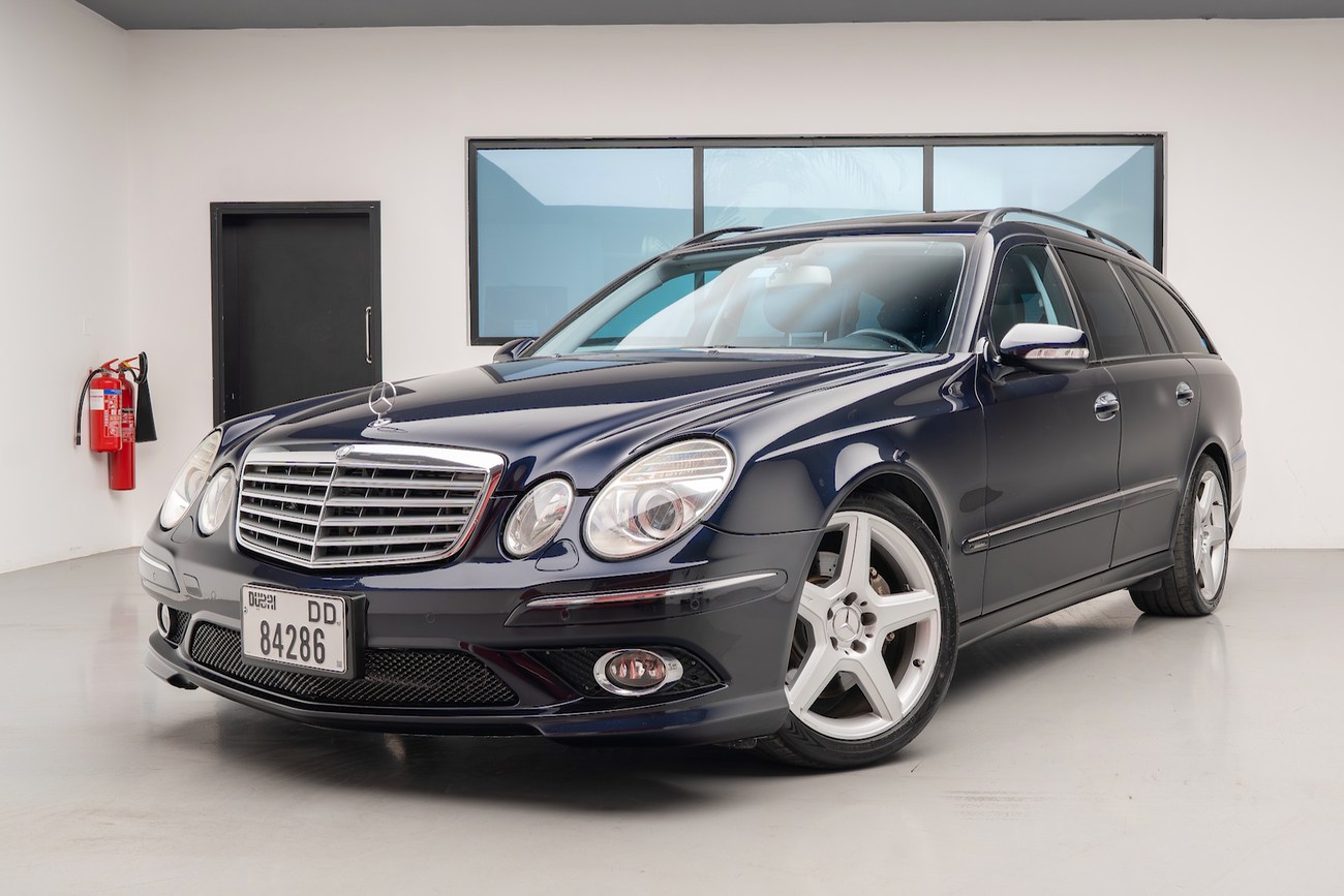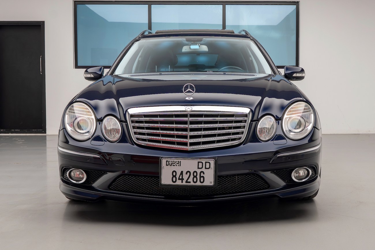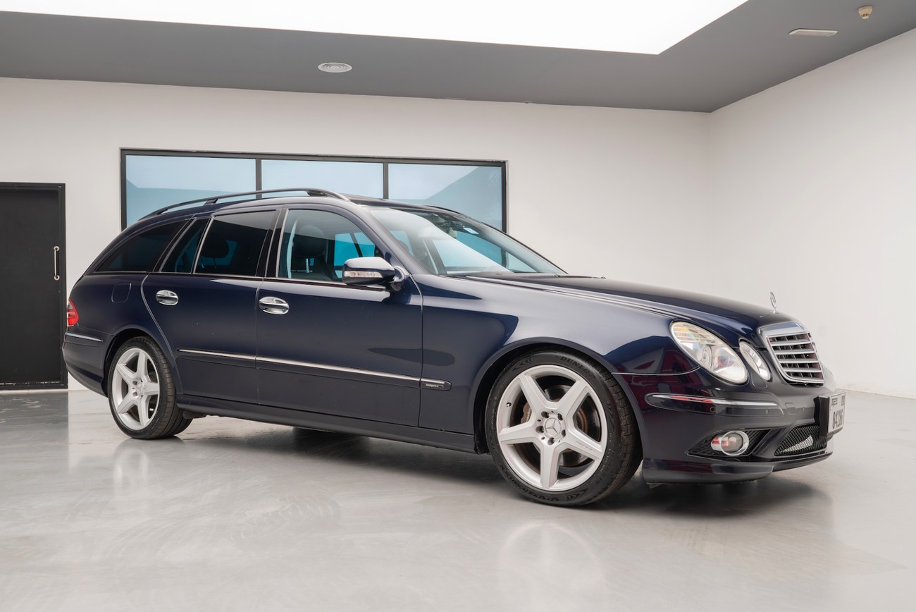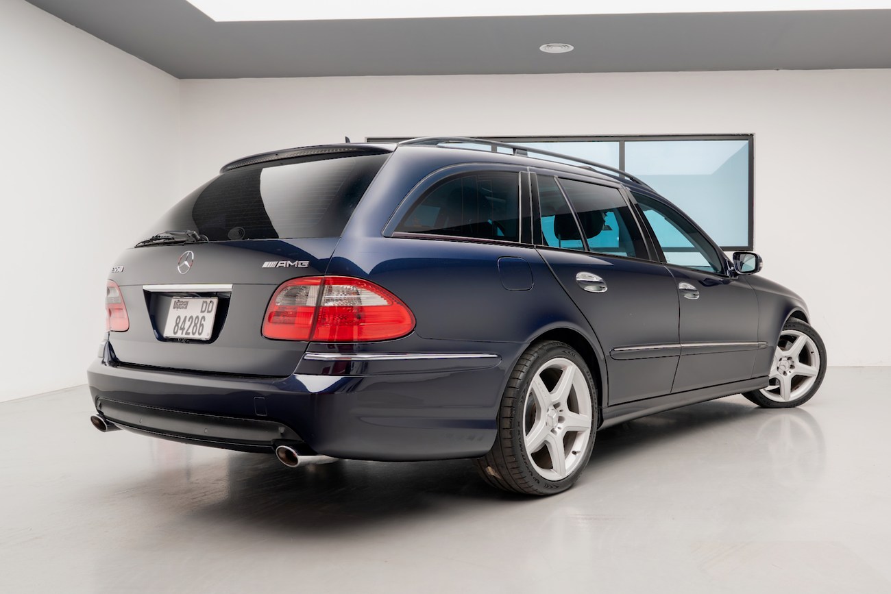 This 2007 Mercedes-Benz E550 Wagon was first sold new in Japan as a left-hand drive example and later exported to the United Arab Emirates where it currently resides with only 122k km (~75k miles). Finished in Tanzanite Blue Metallic (359) over Anthracite Leather (821), power is provided by a 5.5-liter V8 mated with a seven-speed automatic driving the rear wheels. Factory equipment includes heated front seats and mirrors, a glass sunroof, bi-xenon headlamps, dual-zone climate control, Harman Kardon audio, Parktronic, and the AMG Sport Package. Recent service includes new Dunlop tires in June 2025, along with a transmission service and oil change in October 2025 in preparation for the sale. This rare E-Class wagon is offered for sale in Dubai, UAE with one key, the factory tool roll, recent service records, and a clean UAE RTA Certificate/title. The seller can assist buyers with worldwide shipping needs.