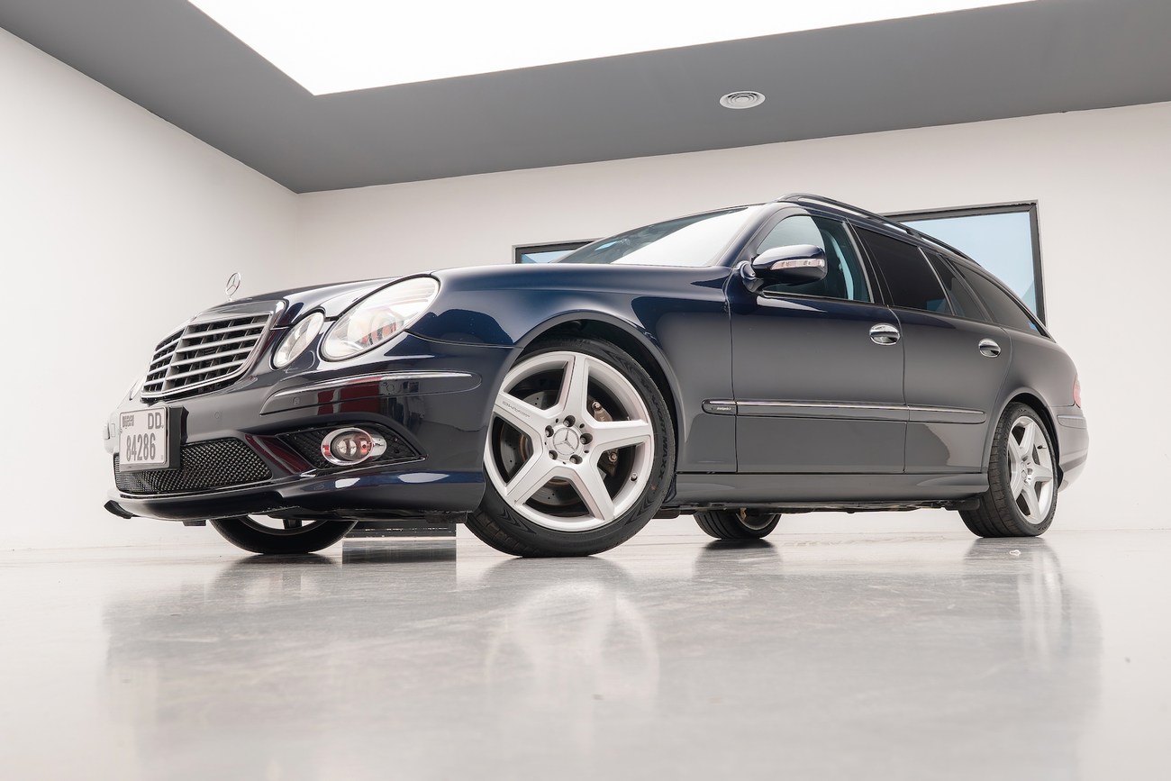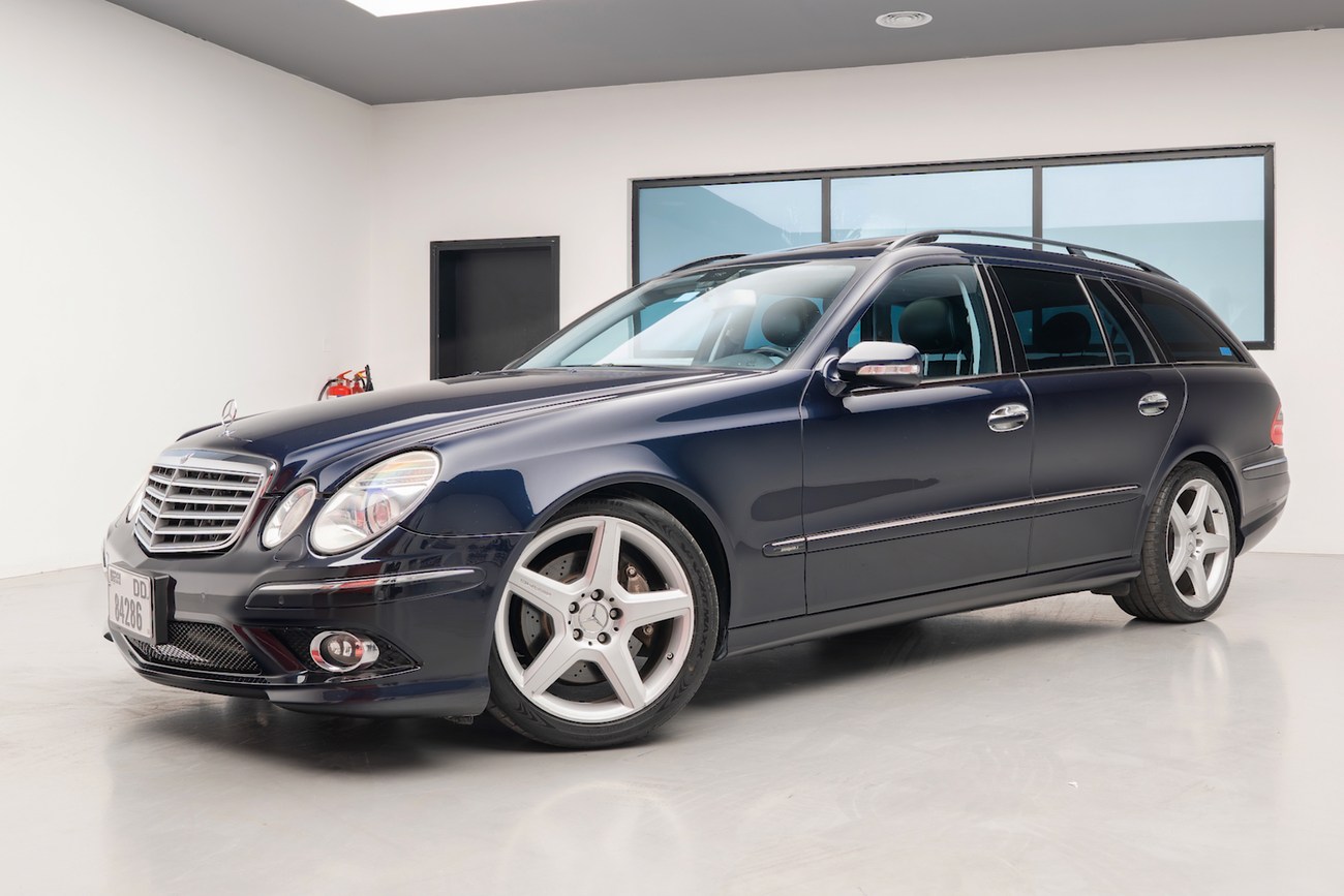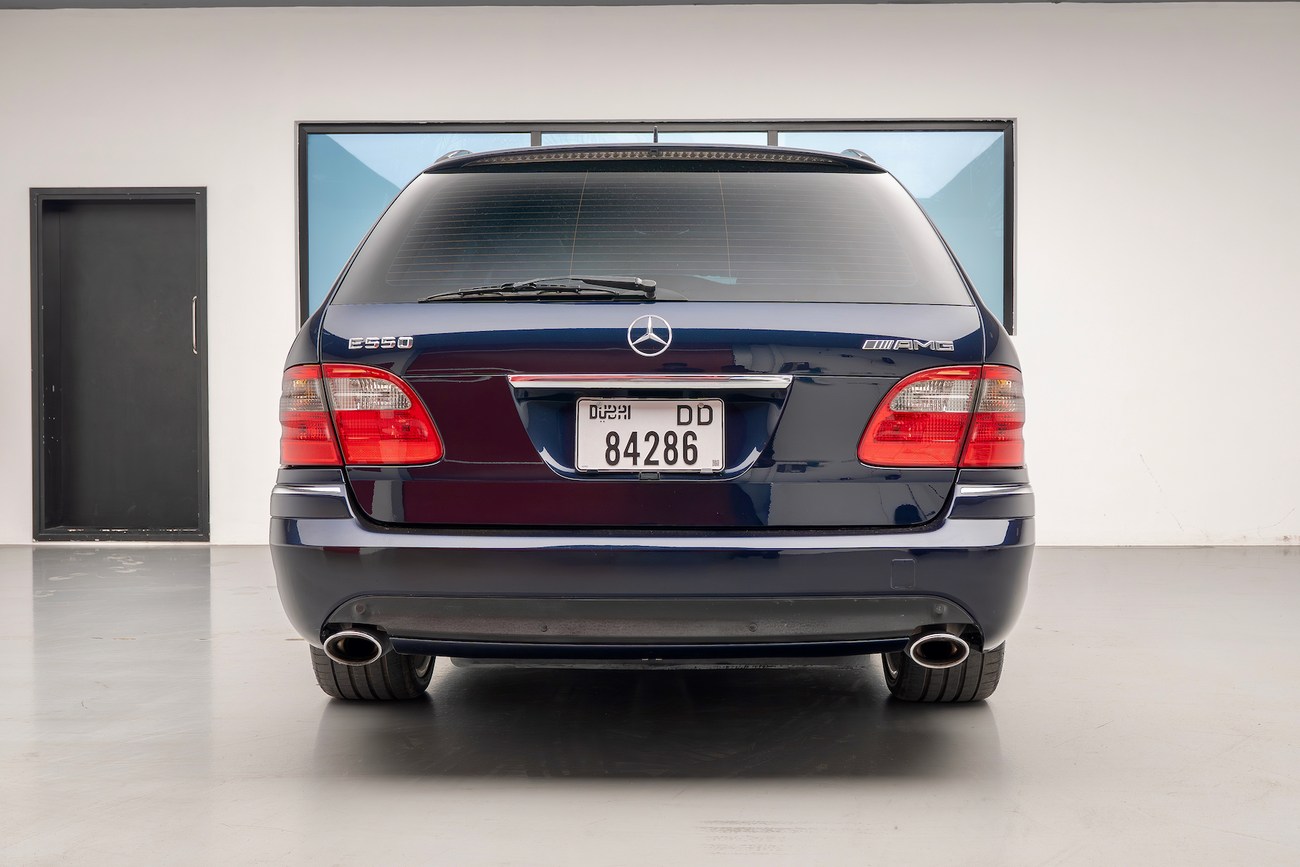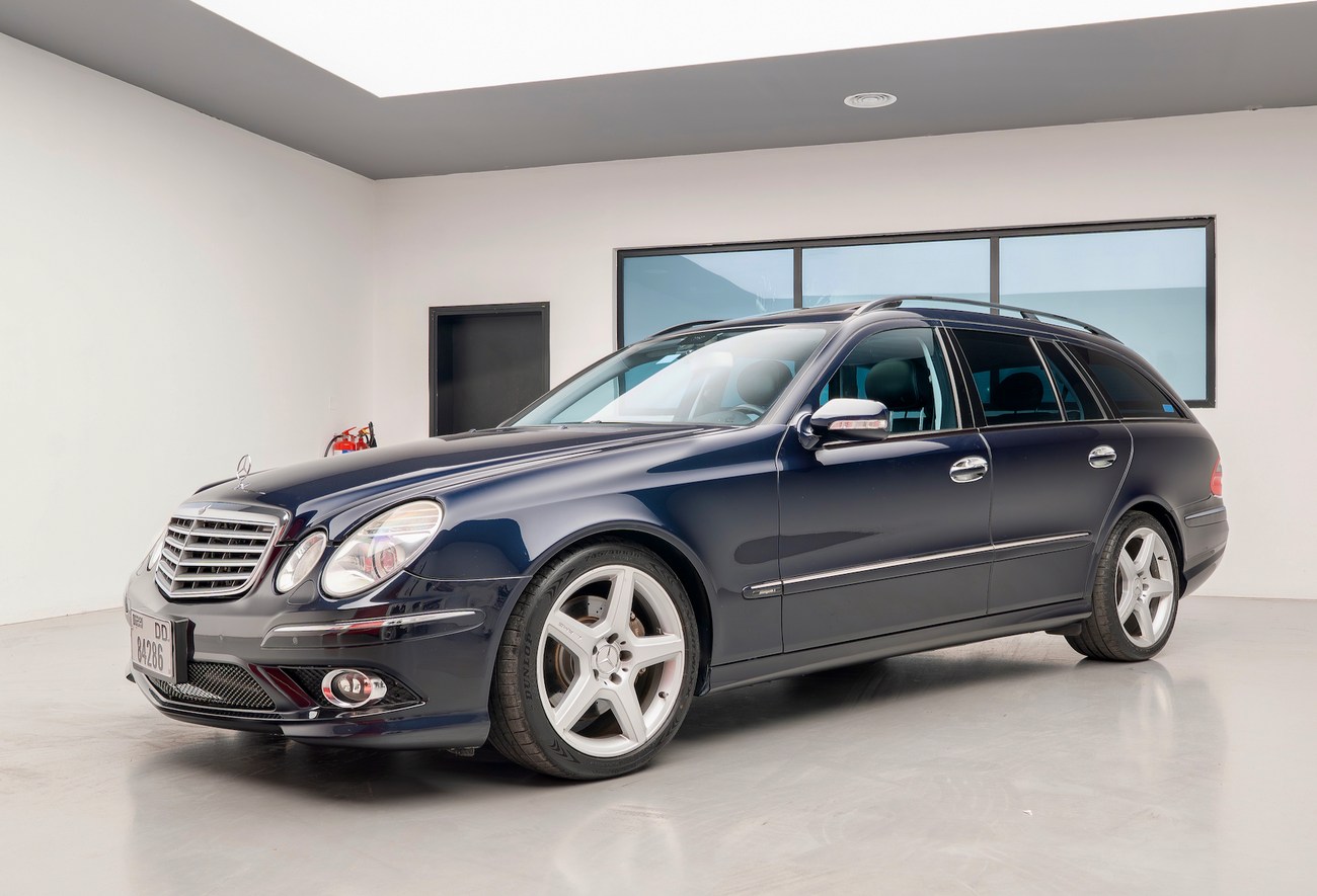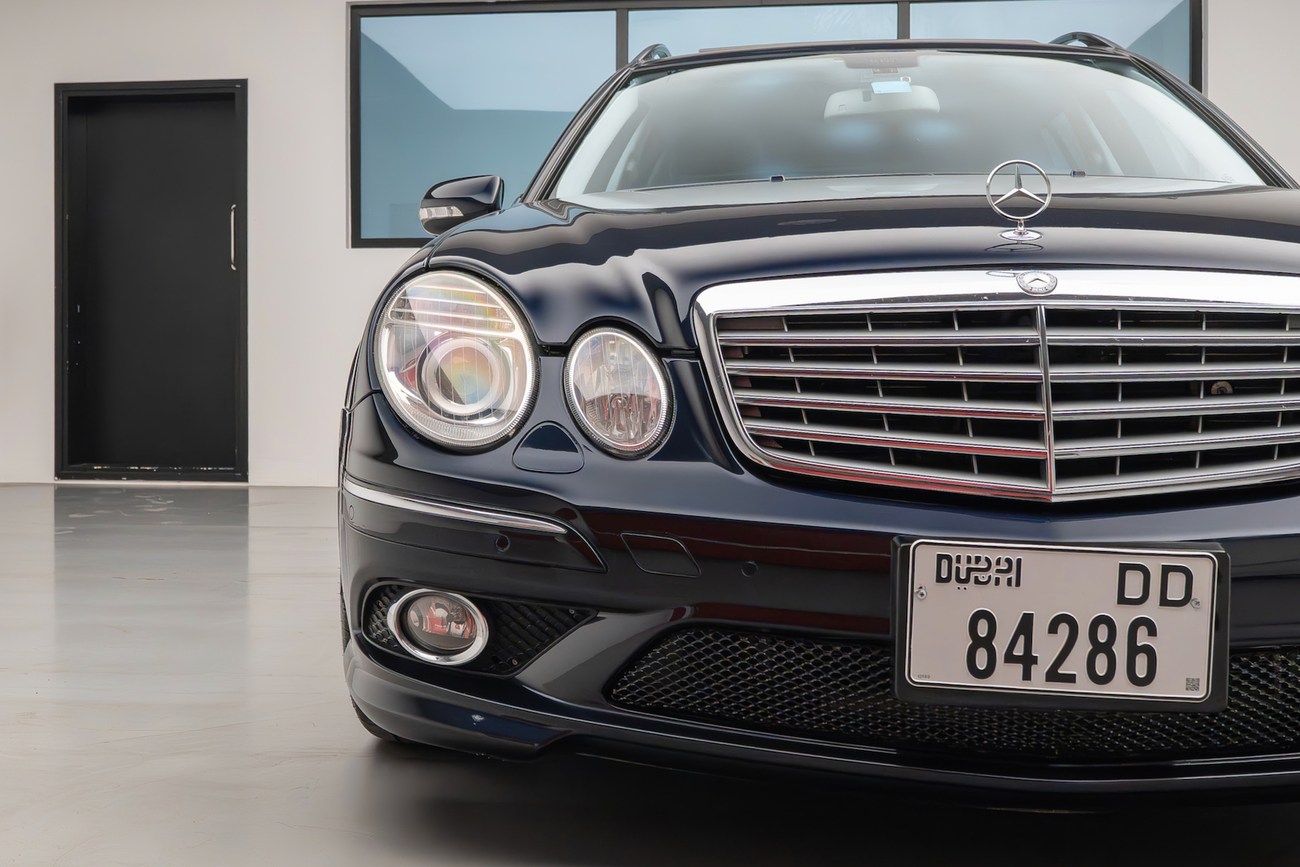 This 2007 Mercedes-Benz E550 Wagon was first sold new in Japan as a left-hand drive example and later exported to the United Arab Emirates where it currently resides with only 122k km (~75k miles). Finished in Tanzanite Blue Metallic (359) over Anthracite Leather (821), power is provided by a 5.5-liter V8 mated with a seven-speed automatic driving the rear wheels. Factory equipment includes heated front seats and mirrors, a glass sunroof, bi-xenon headlamps, dual-zone climate control, Harman Kardon audio, Parktronic, and the AMG Sport Package. Recent service includes new Dunlop tires in June 2025, along with a transmission service and oil change in October 2025 in preparation for the sale. This rare E-Class wagon is offered for sale in Dubai, UAE with one key, the factory tool roll, recent service records, and a clean UAE RTA Certificate/title. The seller can assist buyers with worldwide shipping needs.
