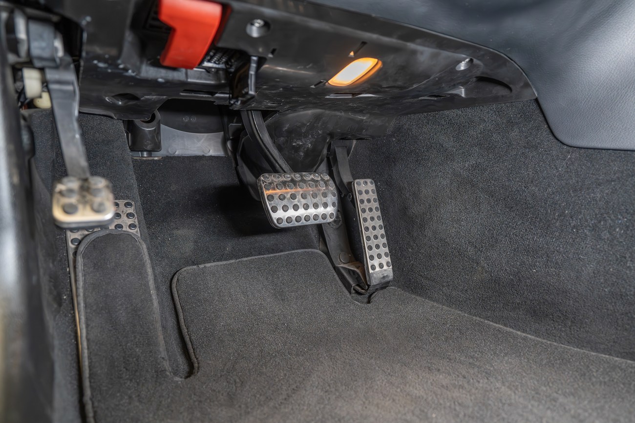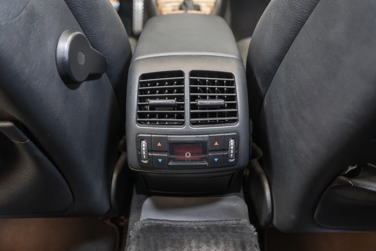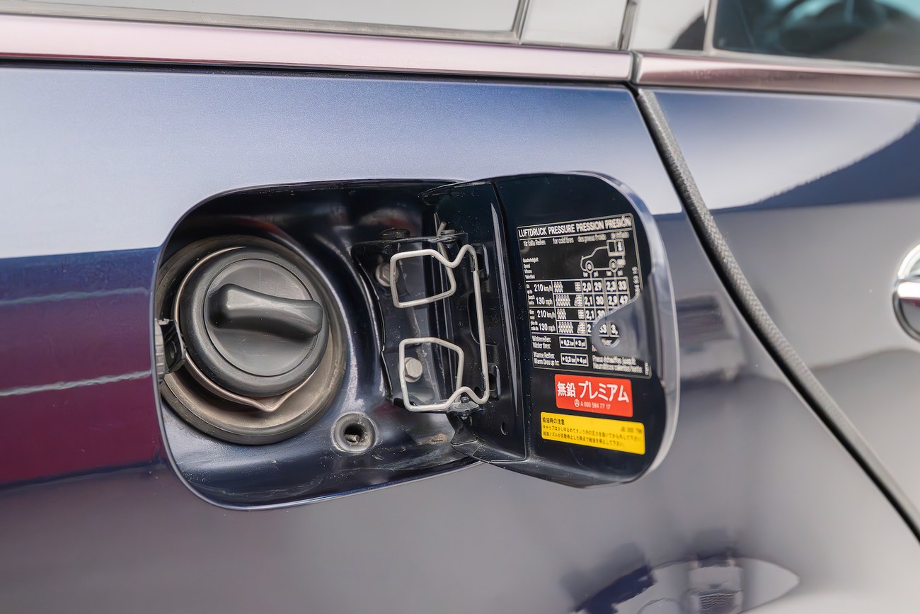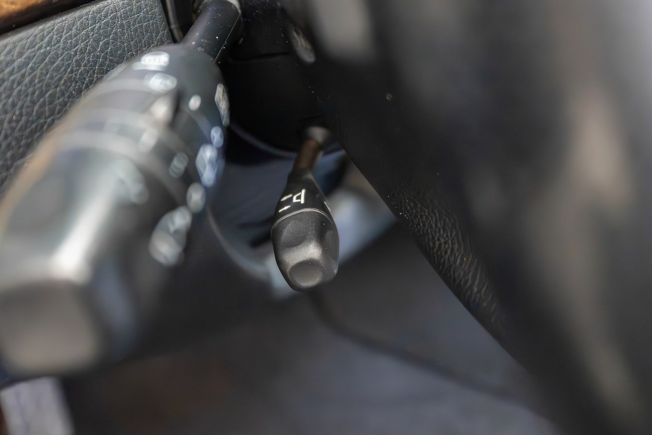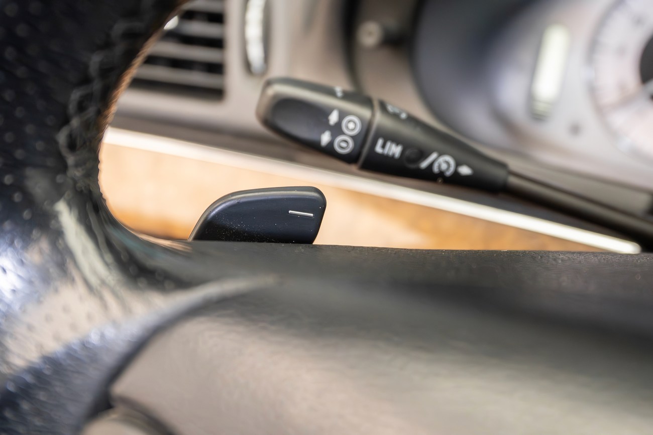 The leather-wrapped steering wheel features paddle shifters and fronts white-faced Sport gauges including a 260kmh speedometer with a centrally-mounted digital display. The digital odometer currently reads 122k kilometers (~75k miles). Other instrumentation includes a 7k-rpm tachometer, analog clock, and digital fuel level and coolant temperature gauges.