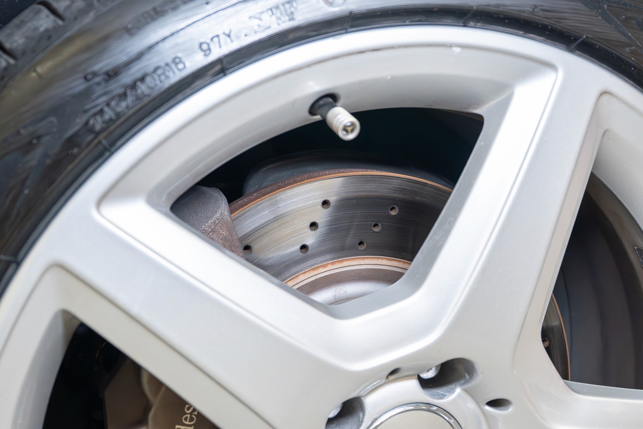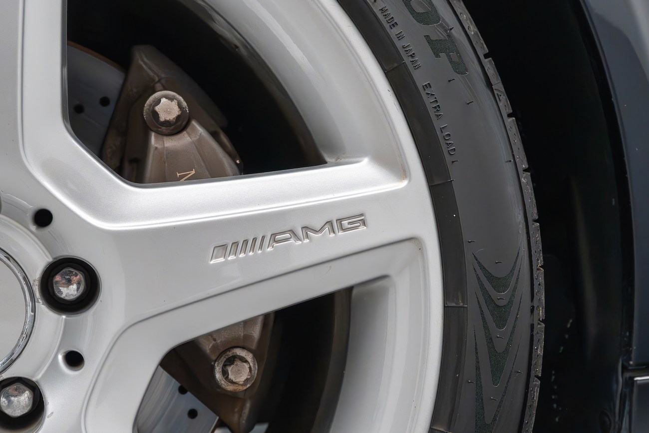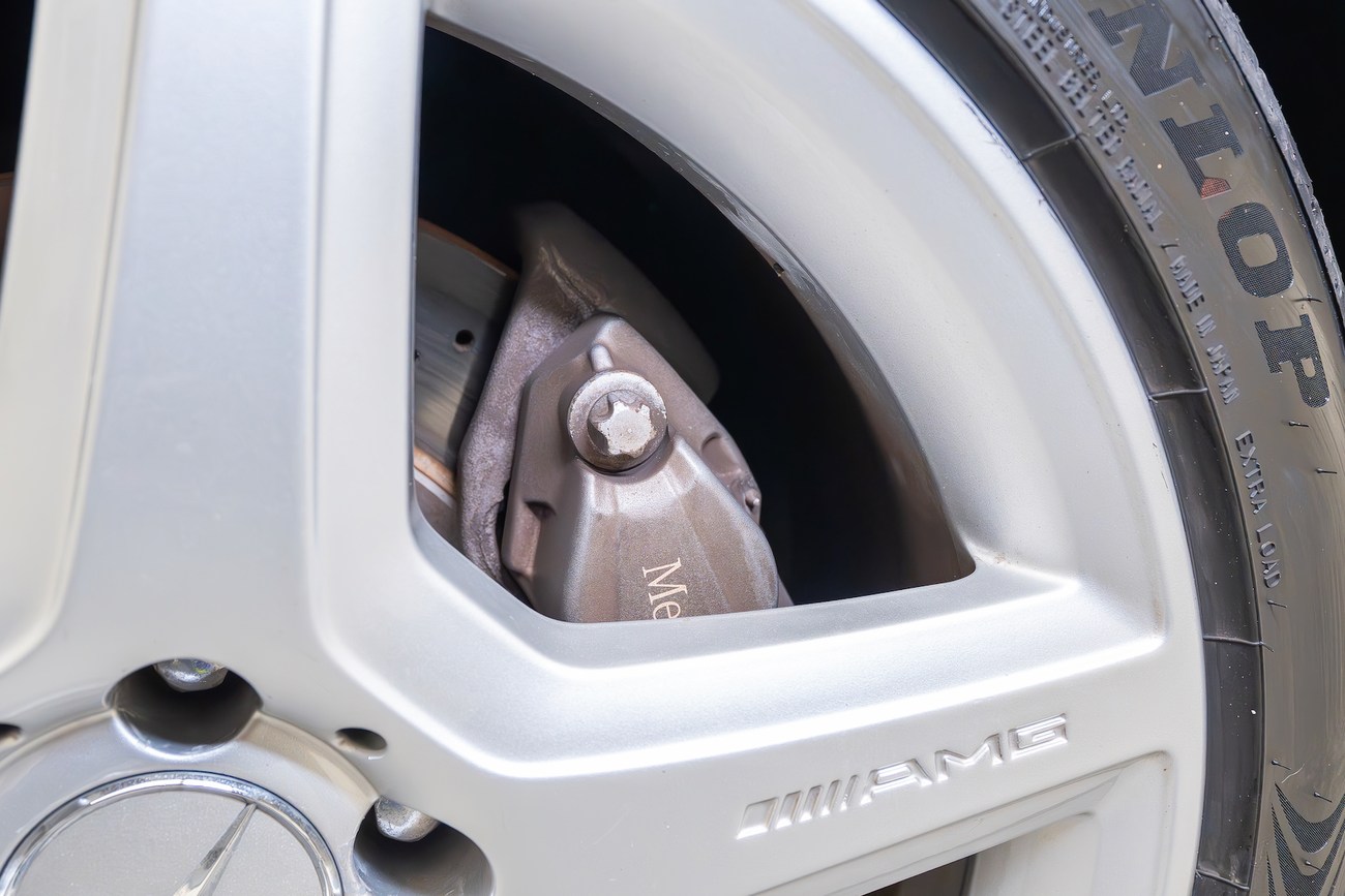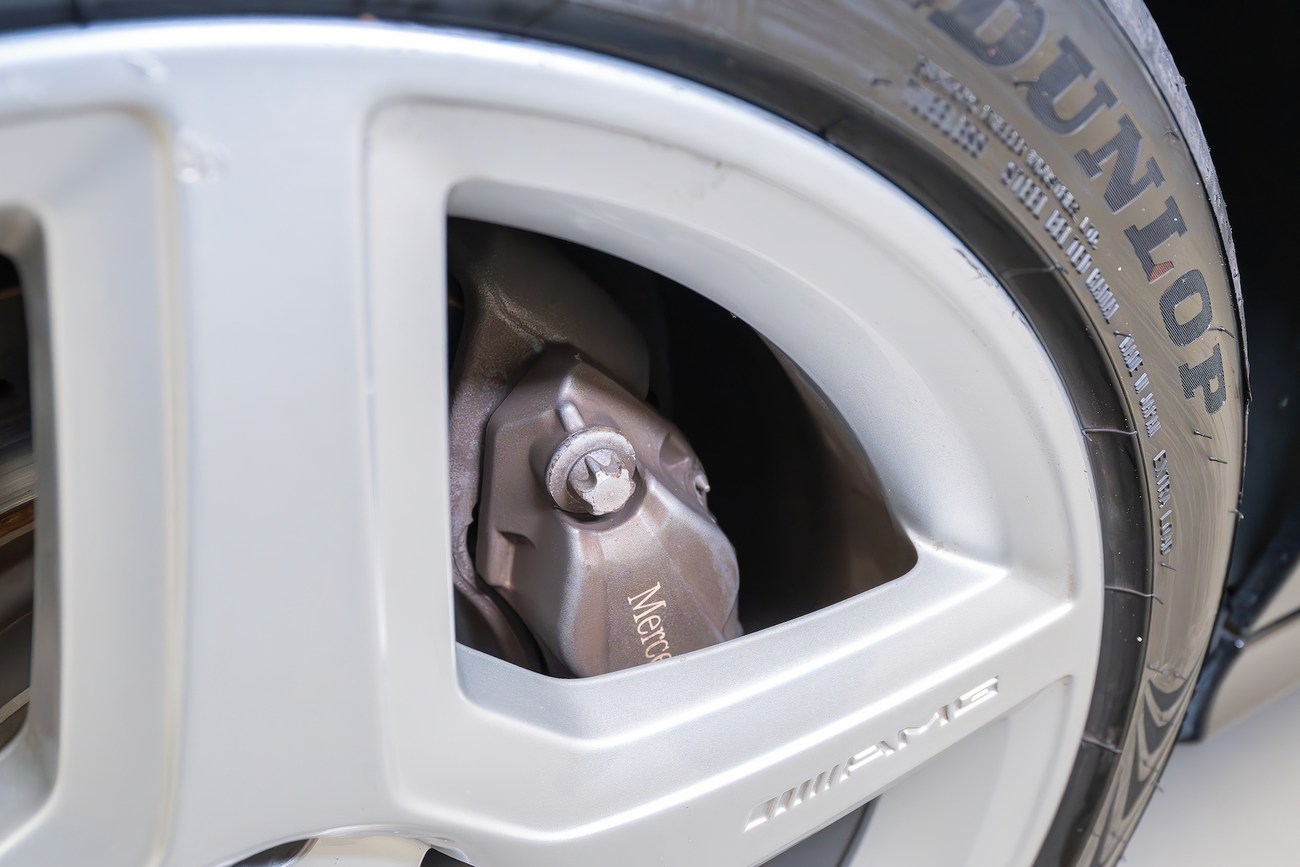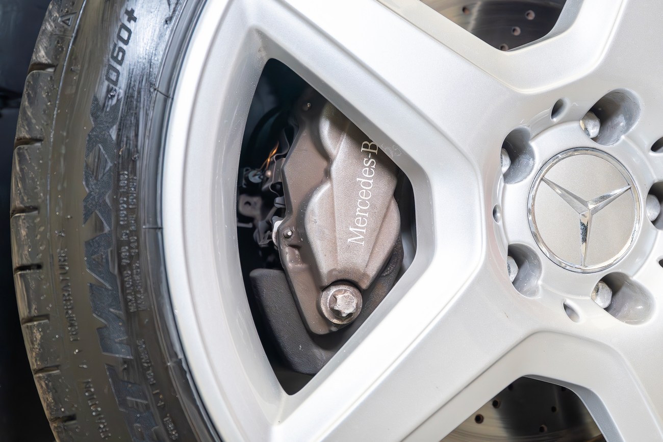 Fitted are the factory Sport-optioned 18” AMG five-spoke alloy wheels which are wrapped with Dunlop Sport Maxx tires measuring 245/40 in the front and 265/35 in the rear. The tires were replaced in June 2025 and show 2025 date codes. The car feature airmatic suspension on all four corners which allow for height and damping adjustment.