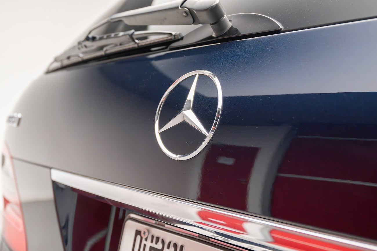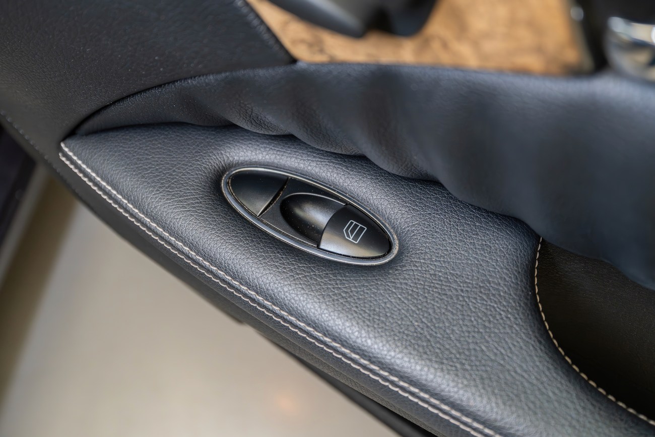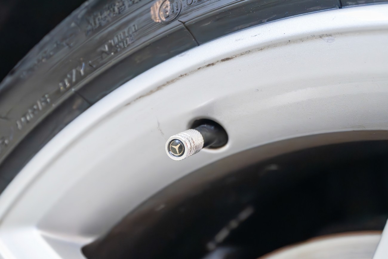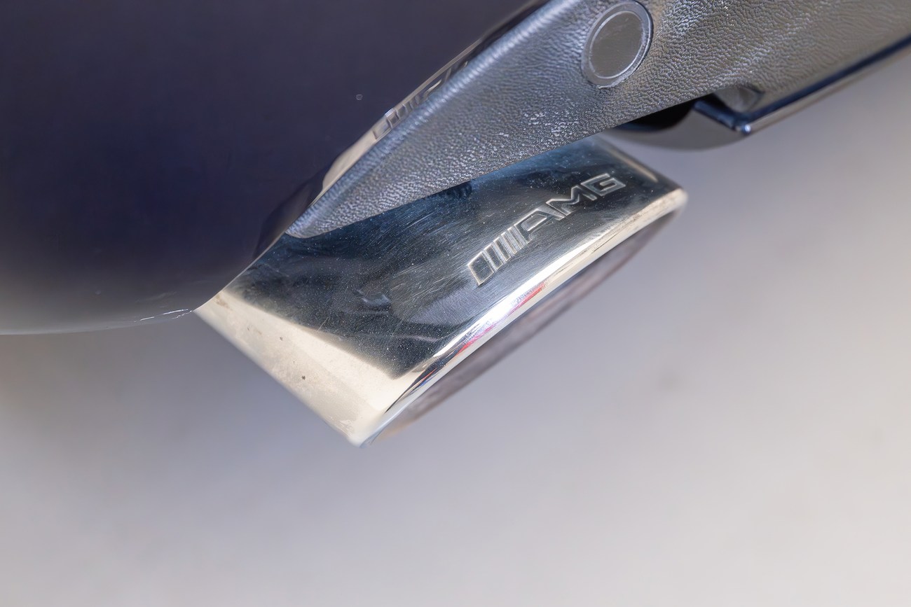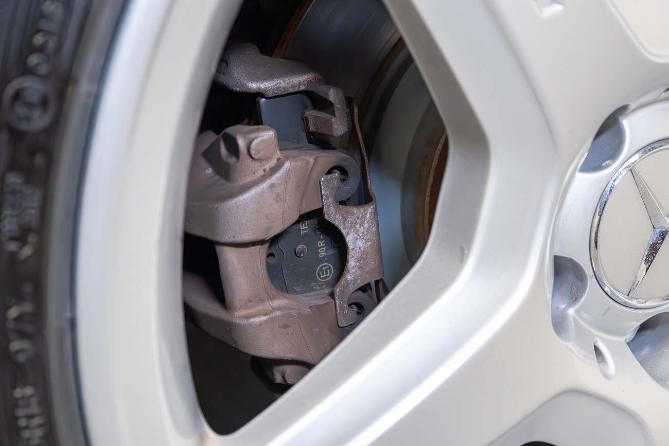 Fitted are the factory Sport-optioned 18” AMG five-spoke alloy wheels which are wrapped with Dunlop Sport Maxx tires measuring 245/40 in the front and 265/35 in the rear. The tires were replaced in June 2025 and show 2025 date codes. The car feature airmatic suspension on all four corners which allow for height and damping adjustment.