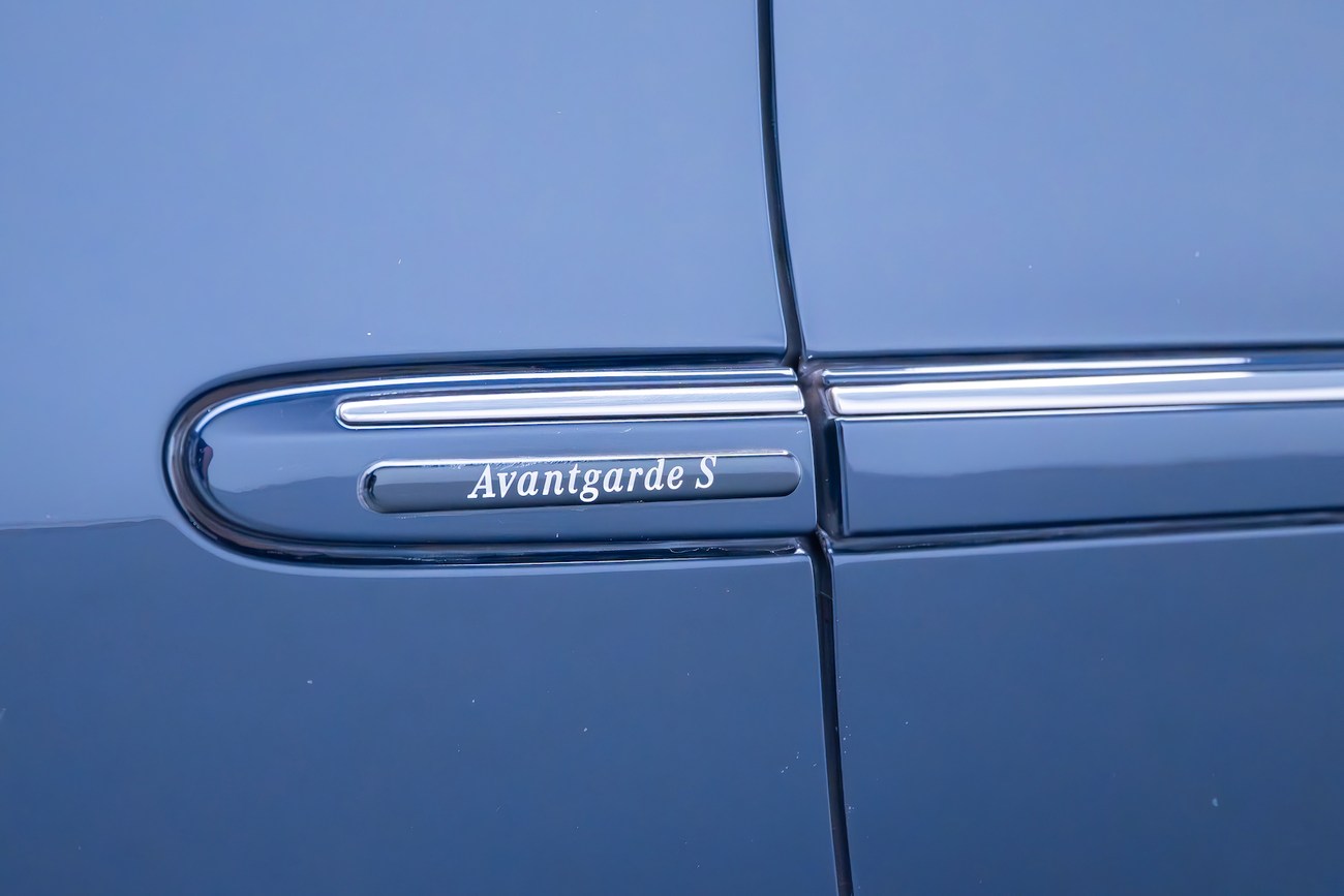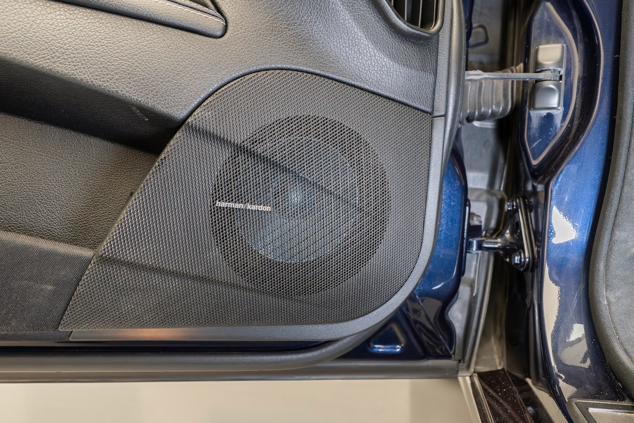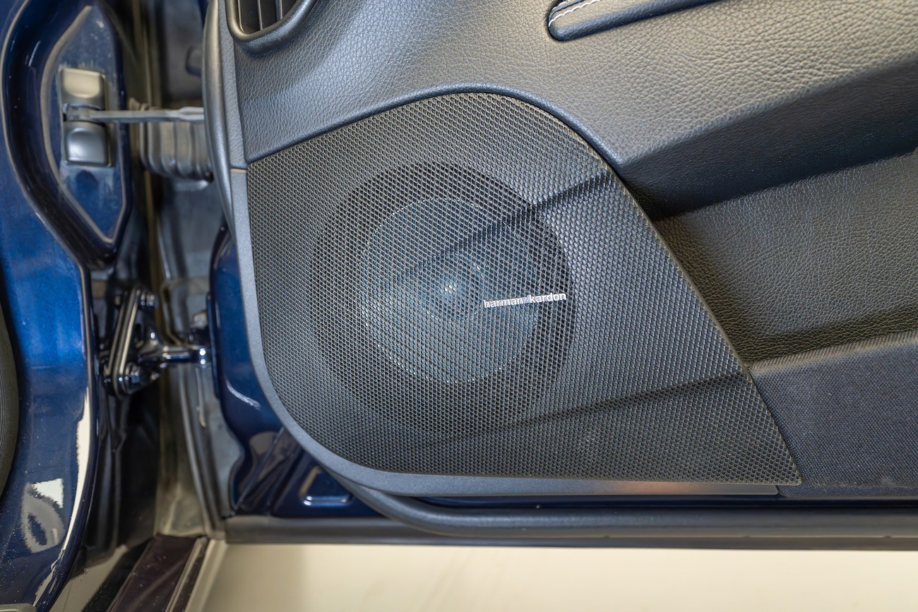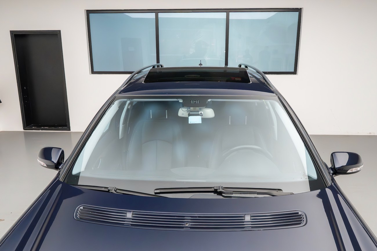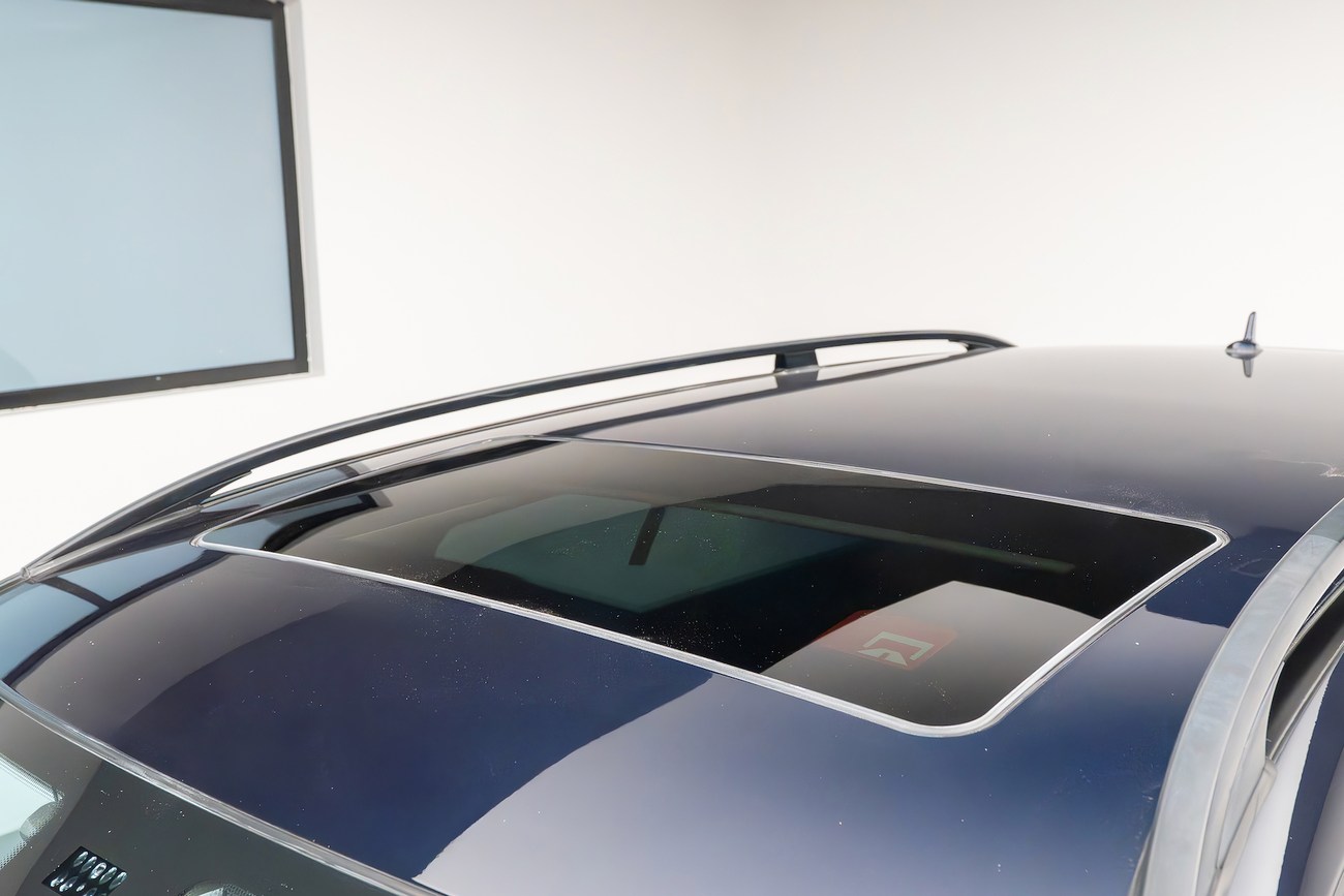 Anthracite Leather (821) upholstery is accented with matching carpets and a leather-trimmed shift knob. Bird's Eye Maple wood trim accents the dashboard, door cards, center console, and armrest. Interior equipment includes a Harman Kardon Logic7 sound system, dual powered and heated front seats with memory, a power glass moonroof, dual-zone automatic climate control, cruise control, automatic headlights, and power accessories. The cabin shows well with little interior wear including creases on the driver’s seat bottom and light fading across the dashboard wood trim. An aftermarket Dynavin head unit is installed in place of the factory COMAND screen.