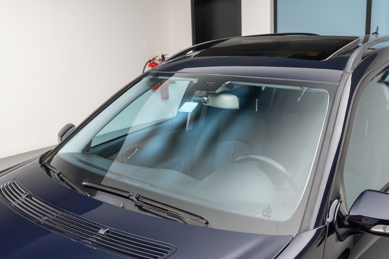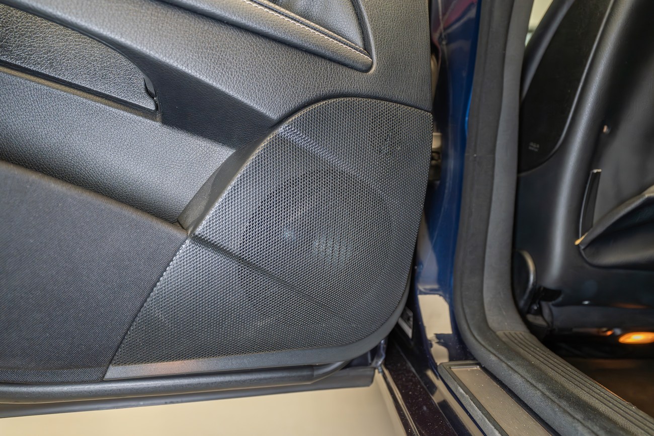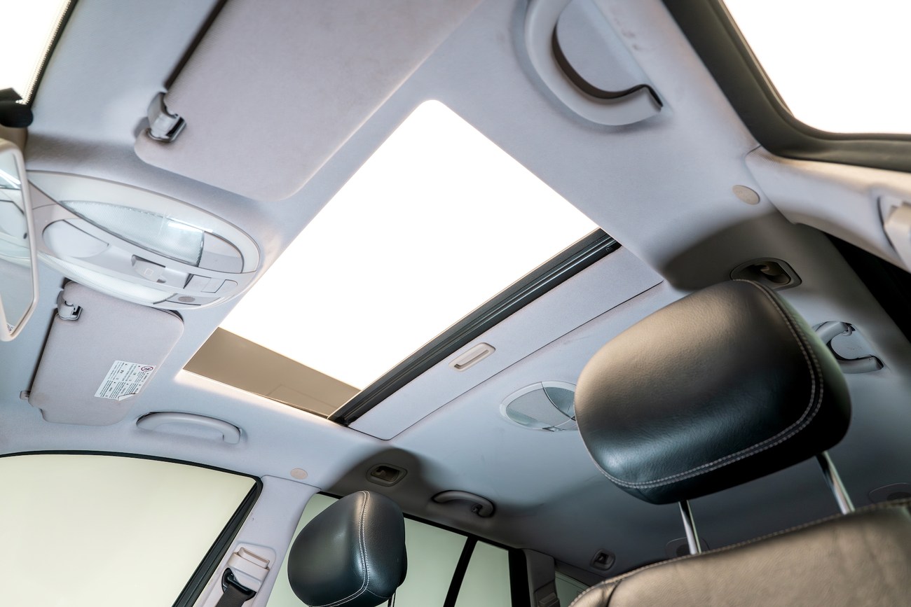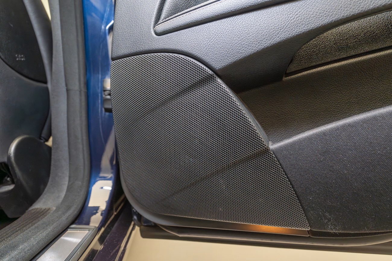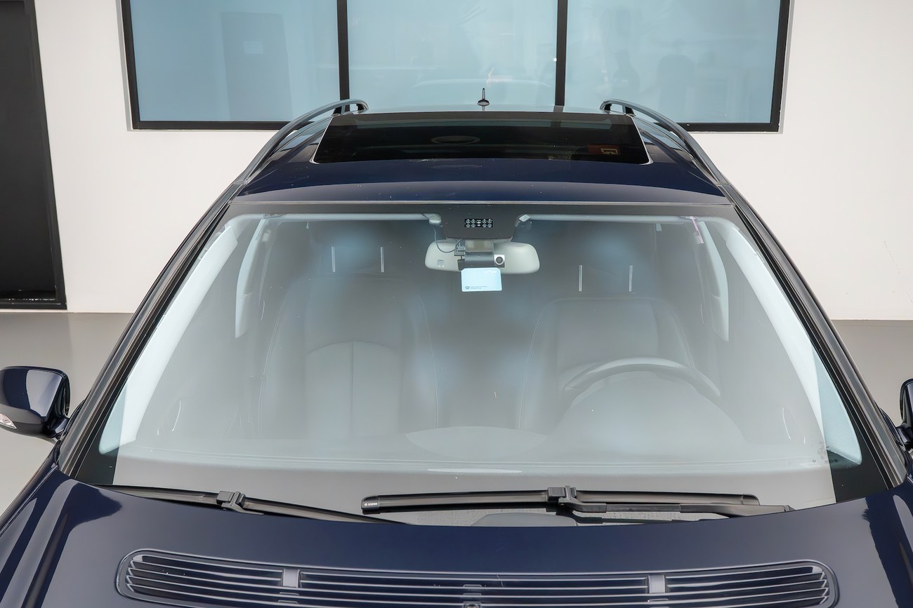 Anthracite Leather (821) upholstery is accented with matching carpets and a leather-trimmed shift knob. Bird's Eye Maple wood trim accents the dashboard, door cards, center console, and armrest. Interior equipment includes a Harman Kardon Logic7 sound system, dual powered and heated front seats with memory, a power glass moonroof, dual-zone automatic climate control, cruise control, automatic headlights, and power accessories. The cabin shows well with little interior wear including creases on the driver’s seat bottom and light fading across the dashboard wood trim. An aftermarket Dynavin head unit is installed in place of the factory COMAND screen.