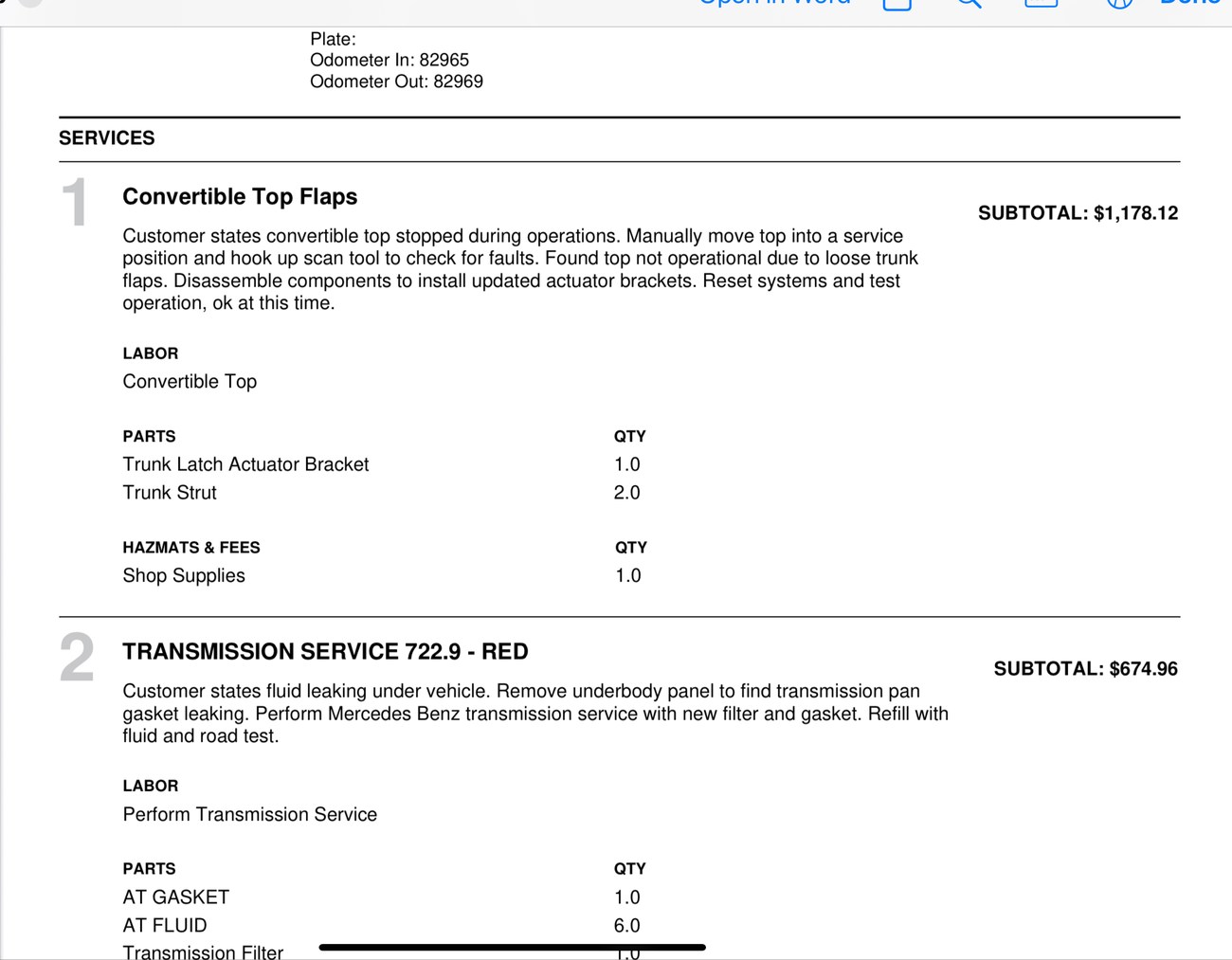 GrandpaGman, the wrenches in service noted in the photo is Service B, Due in 12,000 miles noted on the right of the screen As far as I know, the only warnings are an occasional check engine which is a fuel pressure sensor. It goes away when the tank is above 1/4 full Battery light came on intermittently but has gone away since I had both tested Hope this helps.I note in the pic of the speedometer, there are 2 wrenches illuminated. Can you tell me what service is needed?If anyone wants a view or drive in S Florida, please let me know. ThanksAlso included Guide to the Mercedes Benz SL 230Thanks for the bids all! Entertainment system functions fully as original. Single CD, Dash entry, Six CD Changer behind driver seat, Phone hookup through Bluetooth for phone function only. (No messaging or music through phone). Hope this helps. Thanks again for your interest.Has the entertainment system been upgraded to include Bluetooth, Apple CarPlay, and Sirius? I think I know the answer but need to ask anyway....$5,500 bid placed by @cory