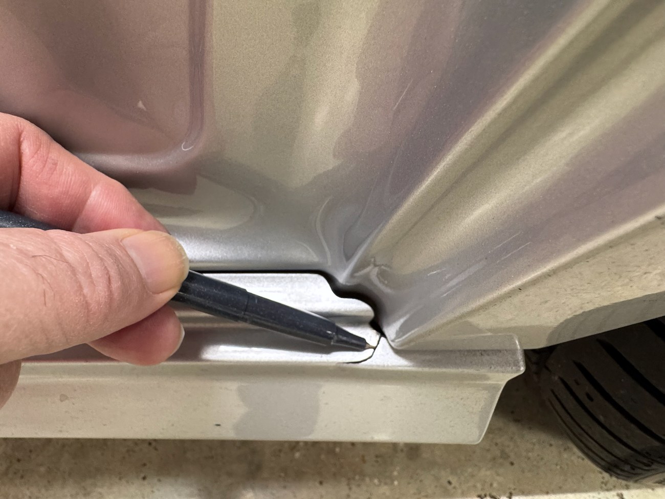 The car is finished in Iridium Silver Metallic (775) and features an AMG-specific body kit with deeper valances and side skirts, as well as a sculpted rear bumper with quad exhaust outlets and front bumper vents. Equipment includes a power operated sunroof, bi-xenon headlights with active curve illumination, and a power trunk closer. The seller notes one imperfection on the inside of the driverside skirt where there's a small crack visible with the rear door open. Detailed photos are provided in the gallery. The paint is believed to be all original as supported by the clean Carfax report.