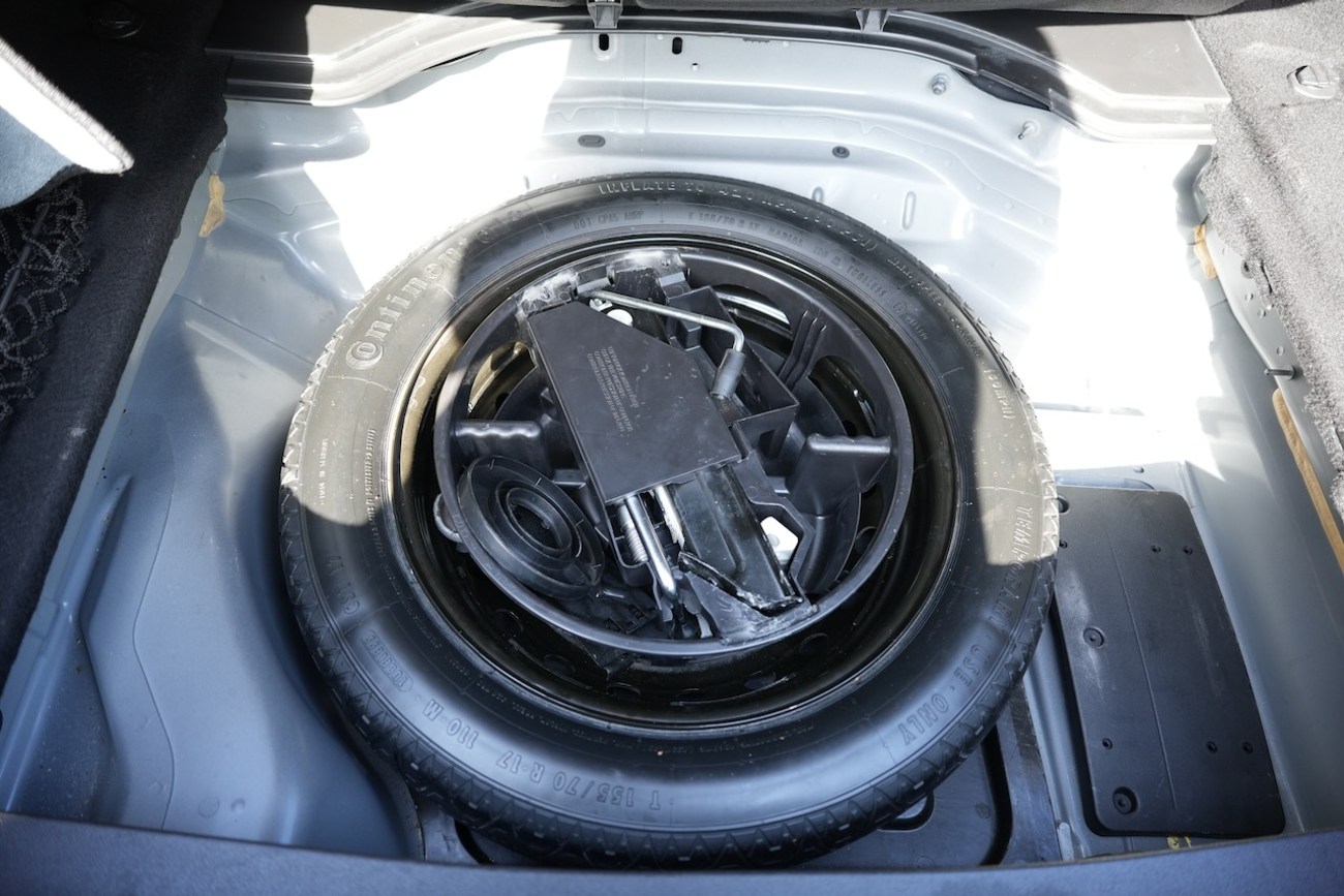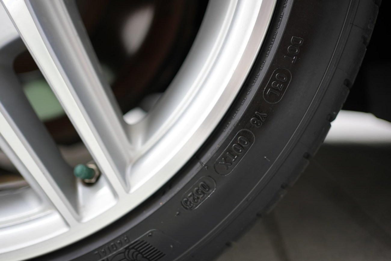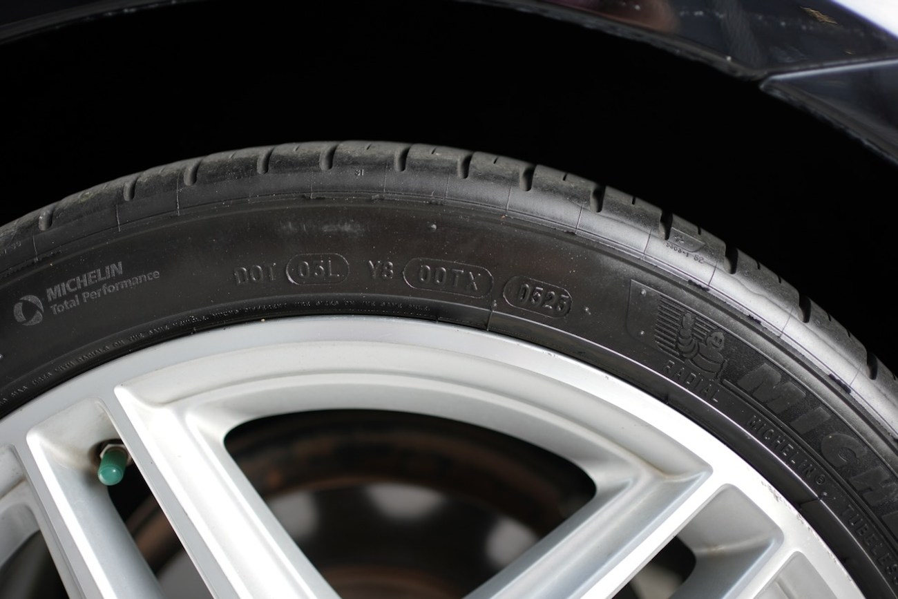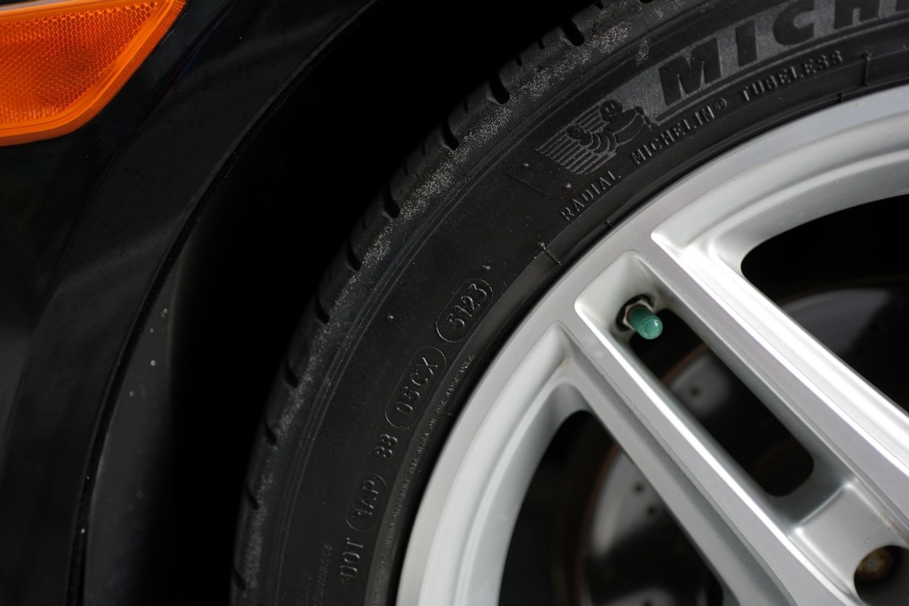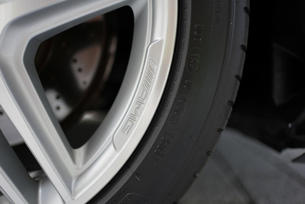 The 18” split five-spoke alloy wheels are fitted with Michelin tires which measure 245/40 up front and 265/35 in the rear. All four tires show 2023 date codes. The wheels show in excellent condition with no major imperfections. A spare can be found mounted below the trunk floor and is pictured in the gallery.