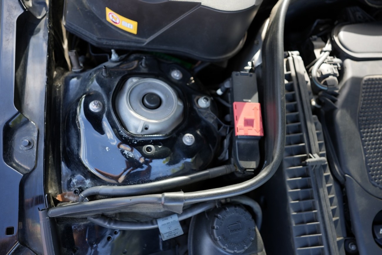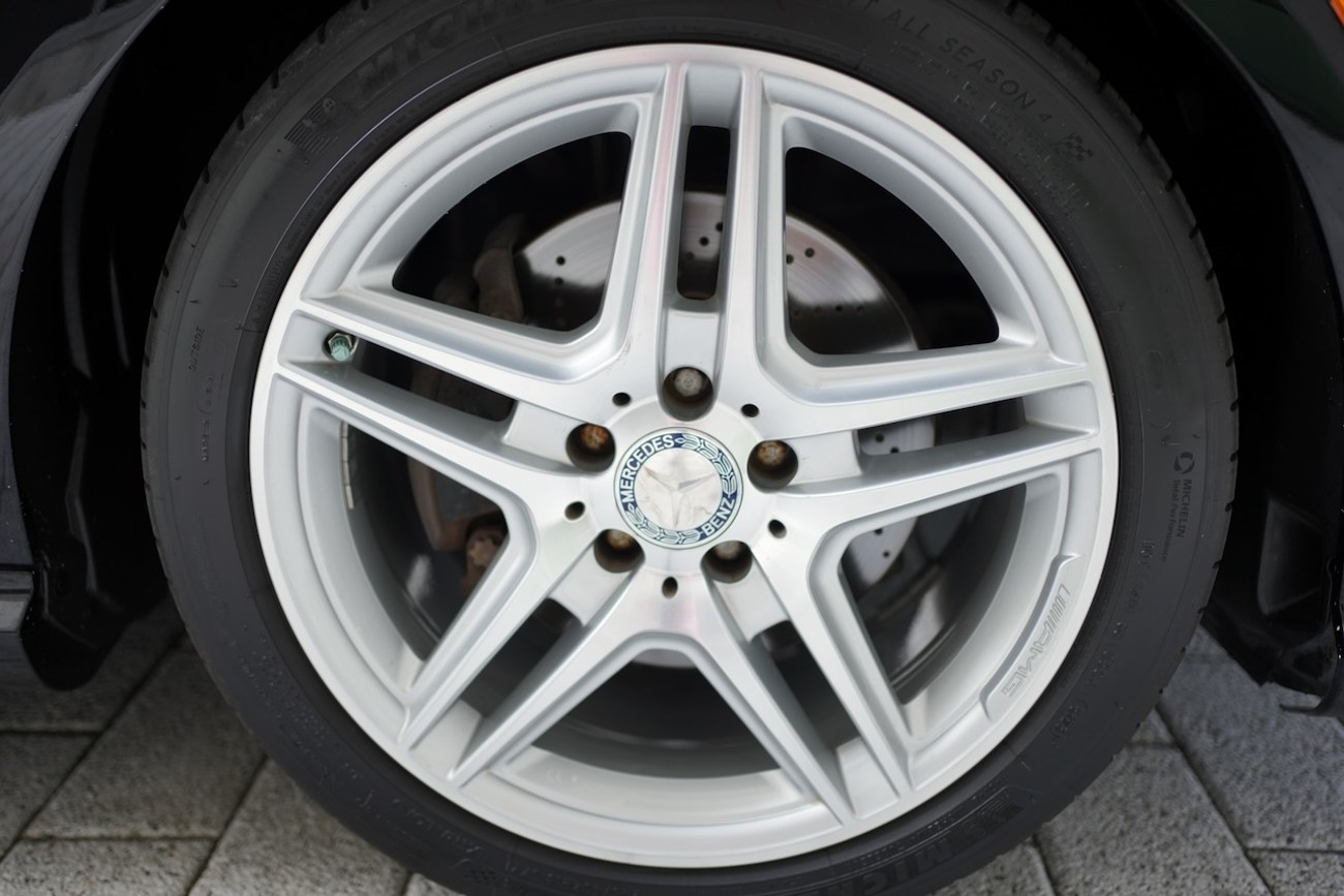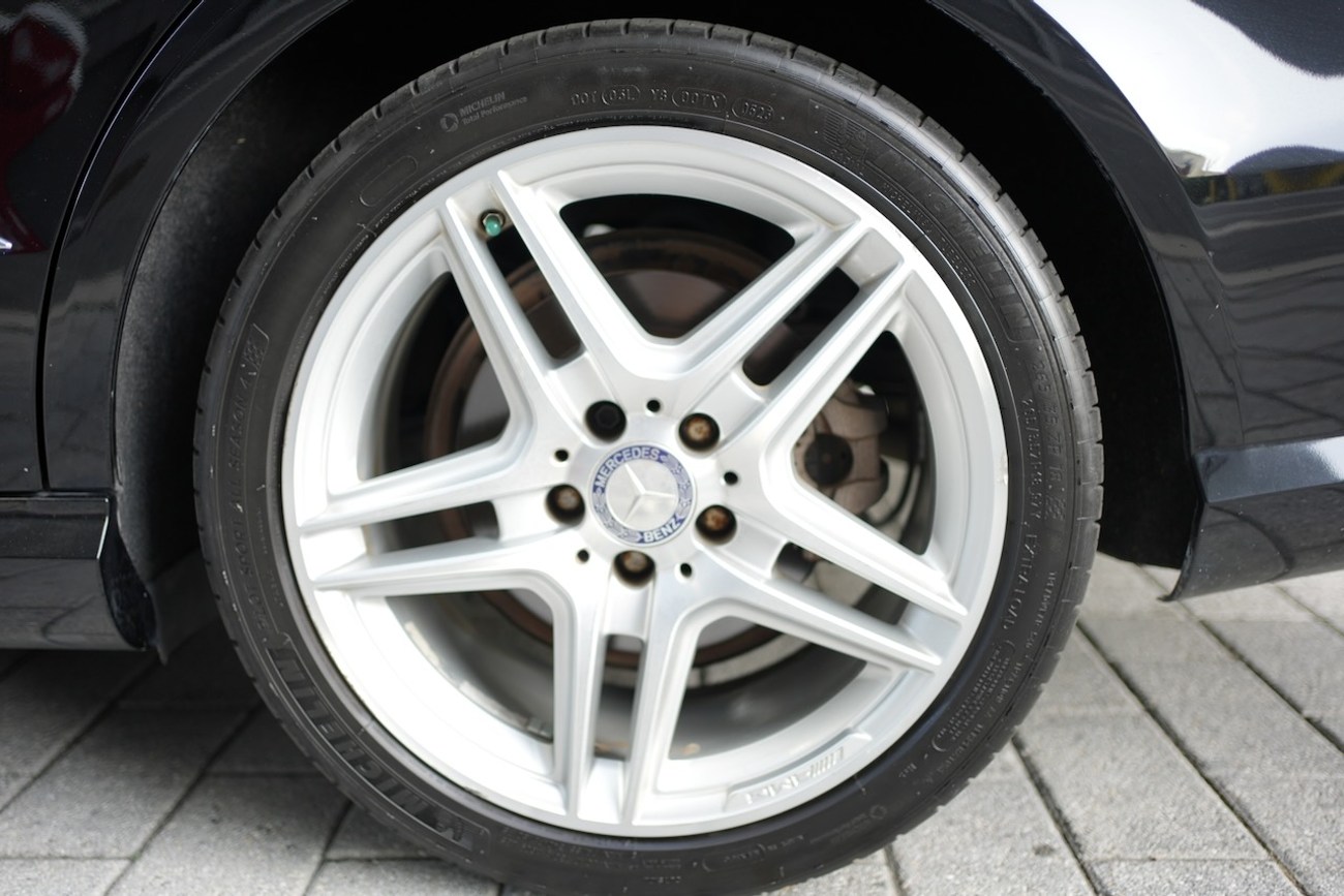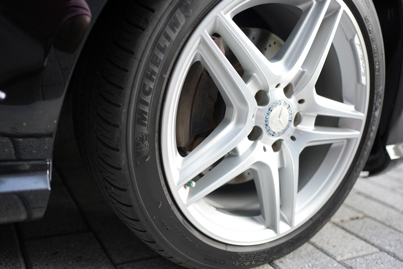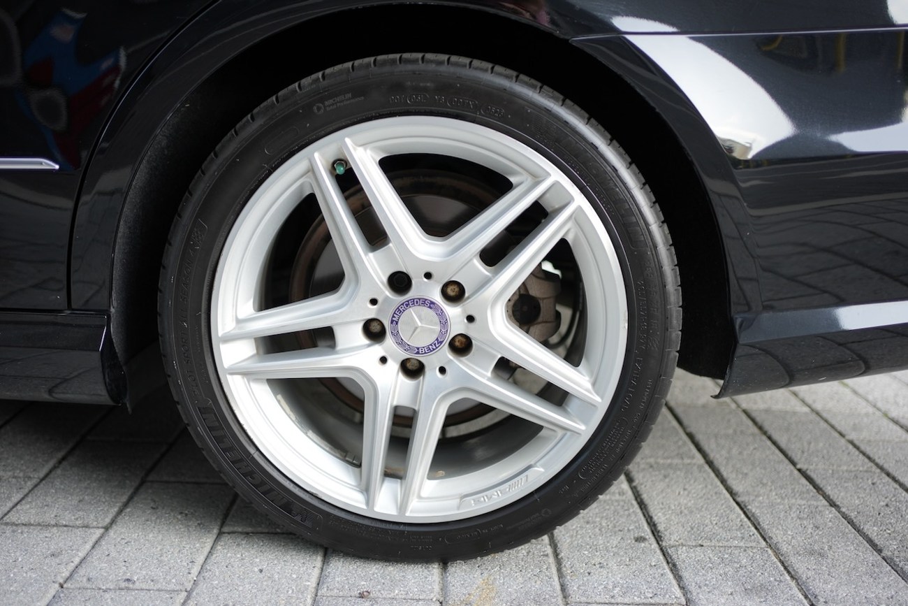 The 18” split five-spoke alloy wheels are fitted with Michelin tires which measure 245/40 up front and 265/35 in the rear. All four tires show 2023 date codes. The wheels show in excellent condition with no major imperfections. A spare can be found mounted below the trunk floor and is pictured in the gallery.