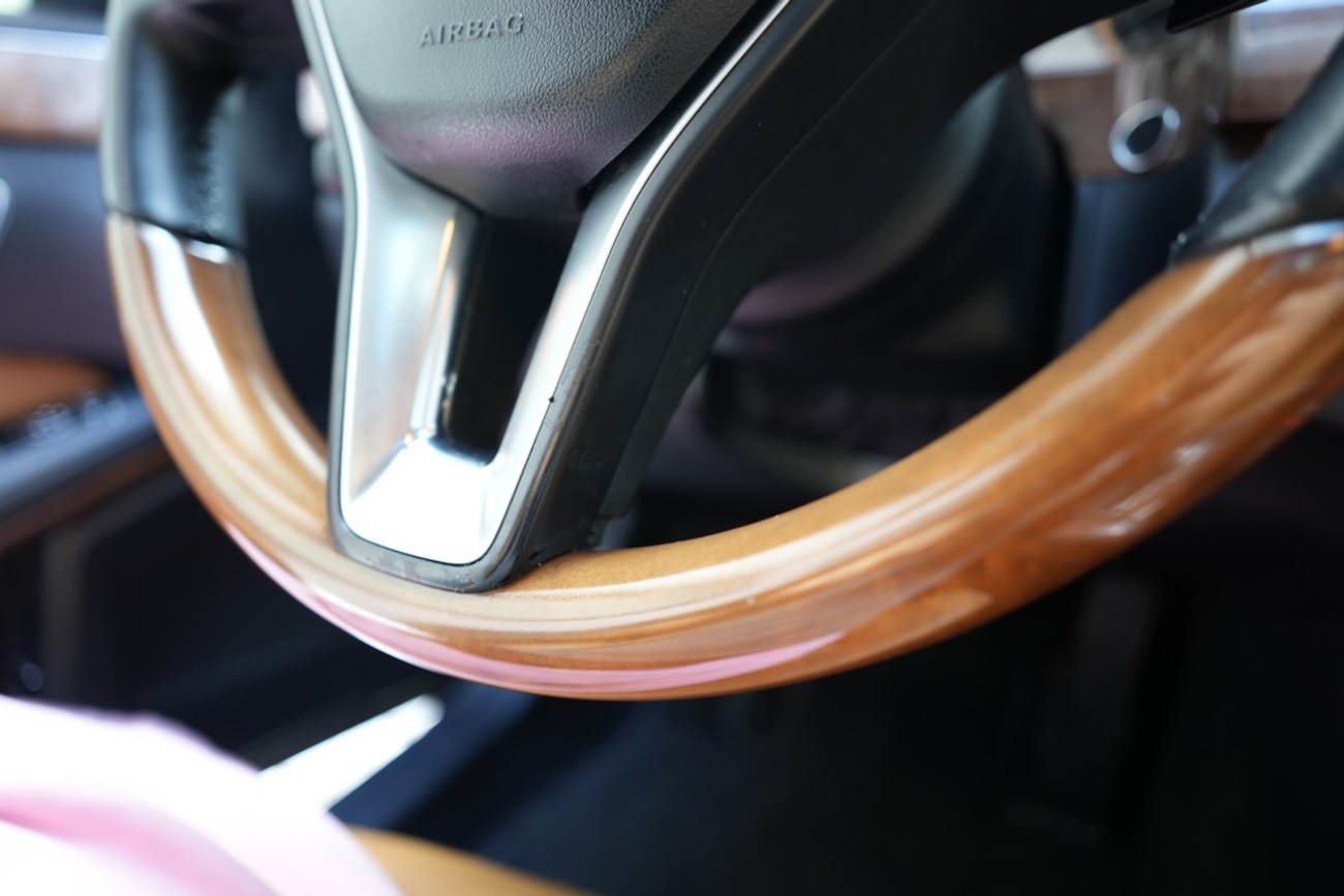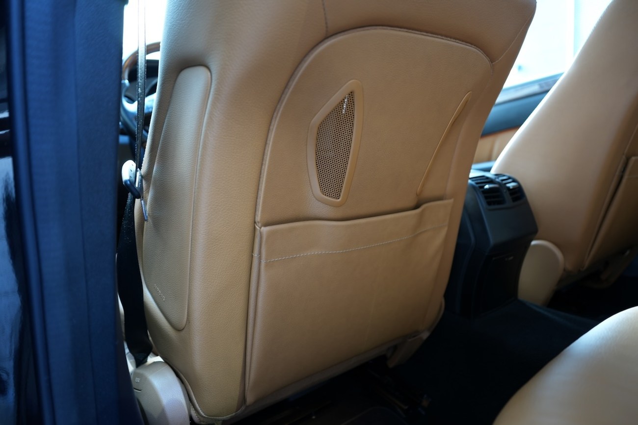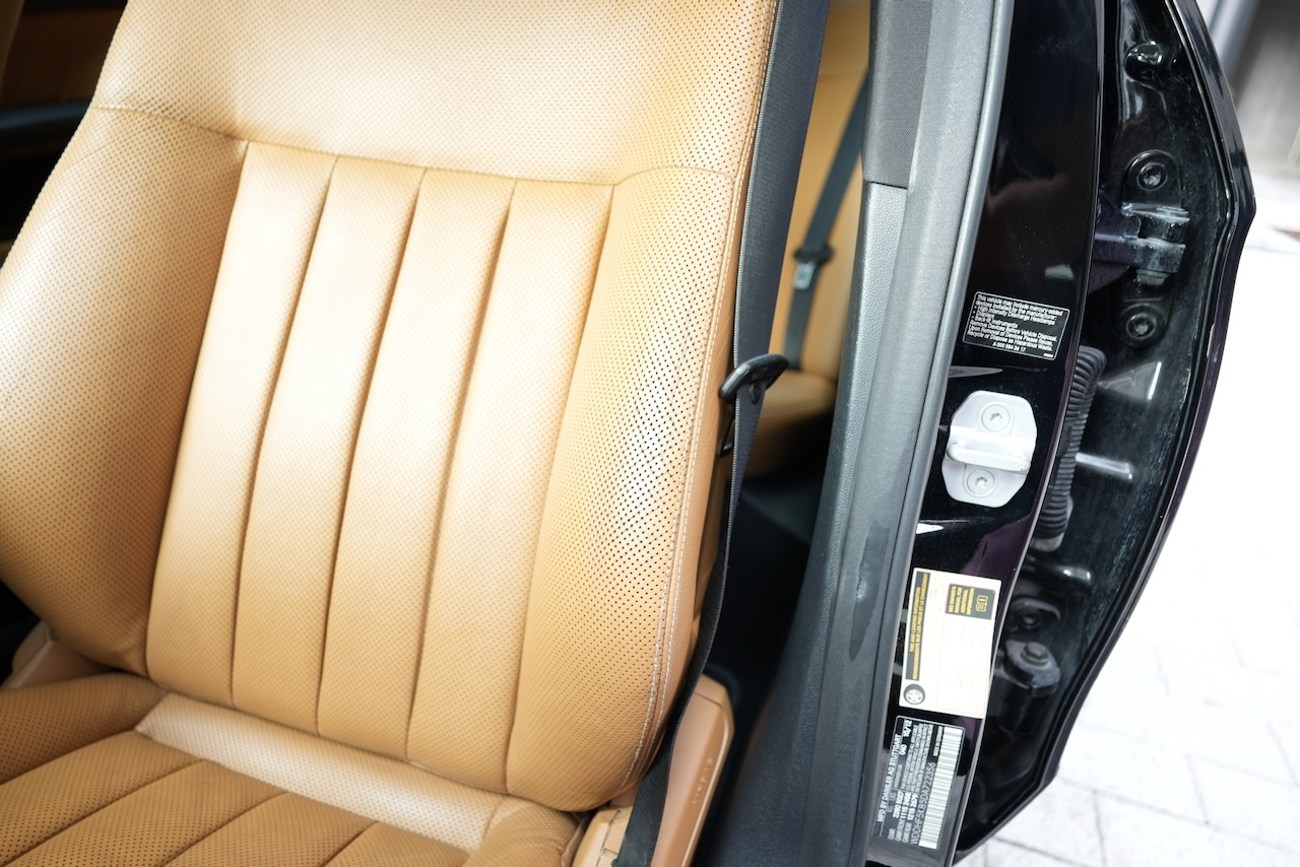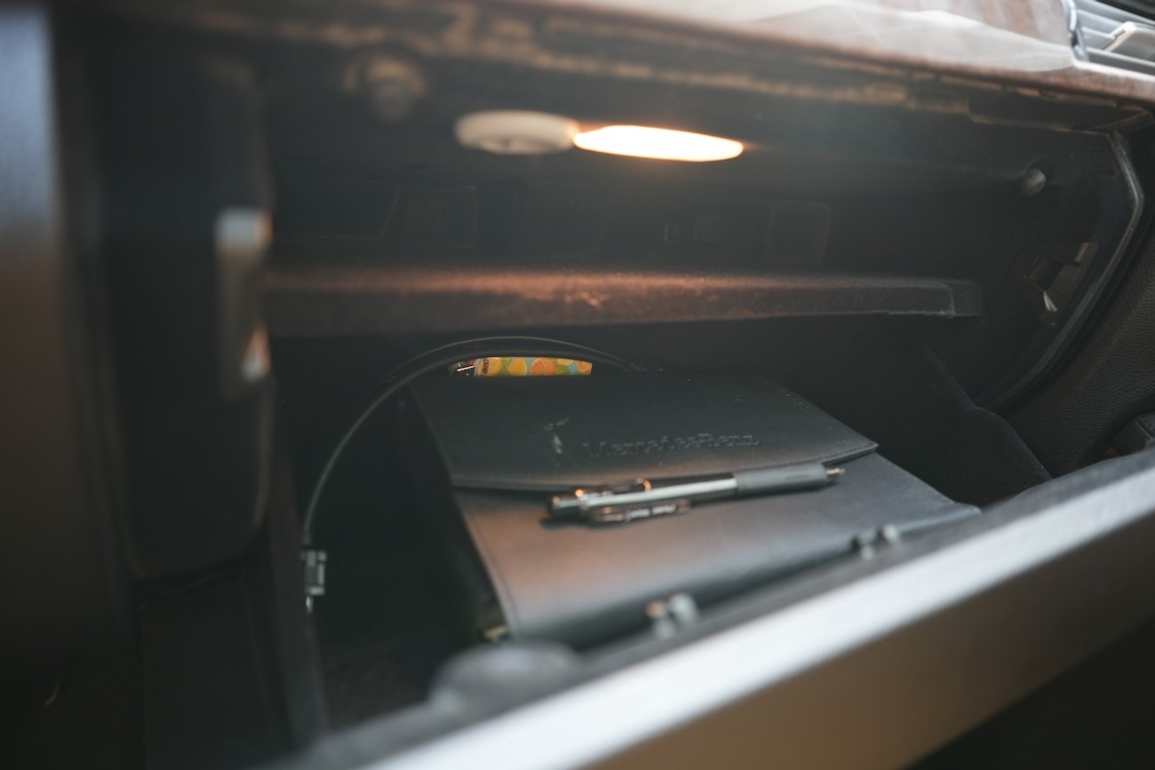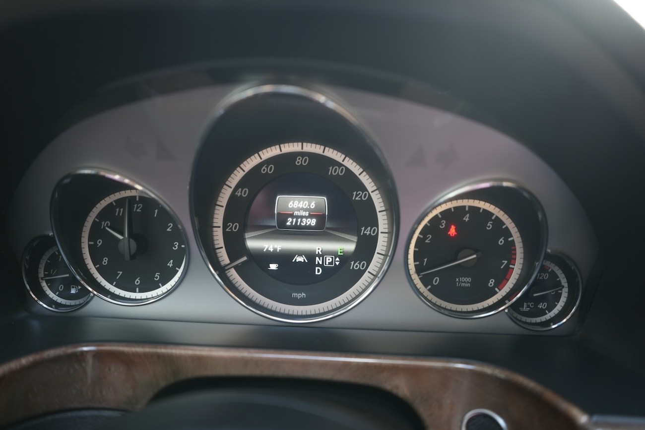 The optional wood and leather steering wheel fronts a 160-mph speedometer with a central configurable display along with an 8k-rpm tachometer, an analog clock and gauges for fuel level and coolant temperature. The digital odometer currently shows less than 212k miles from new.