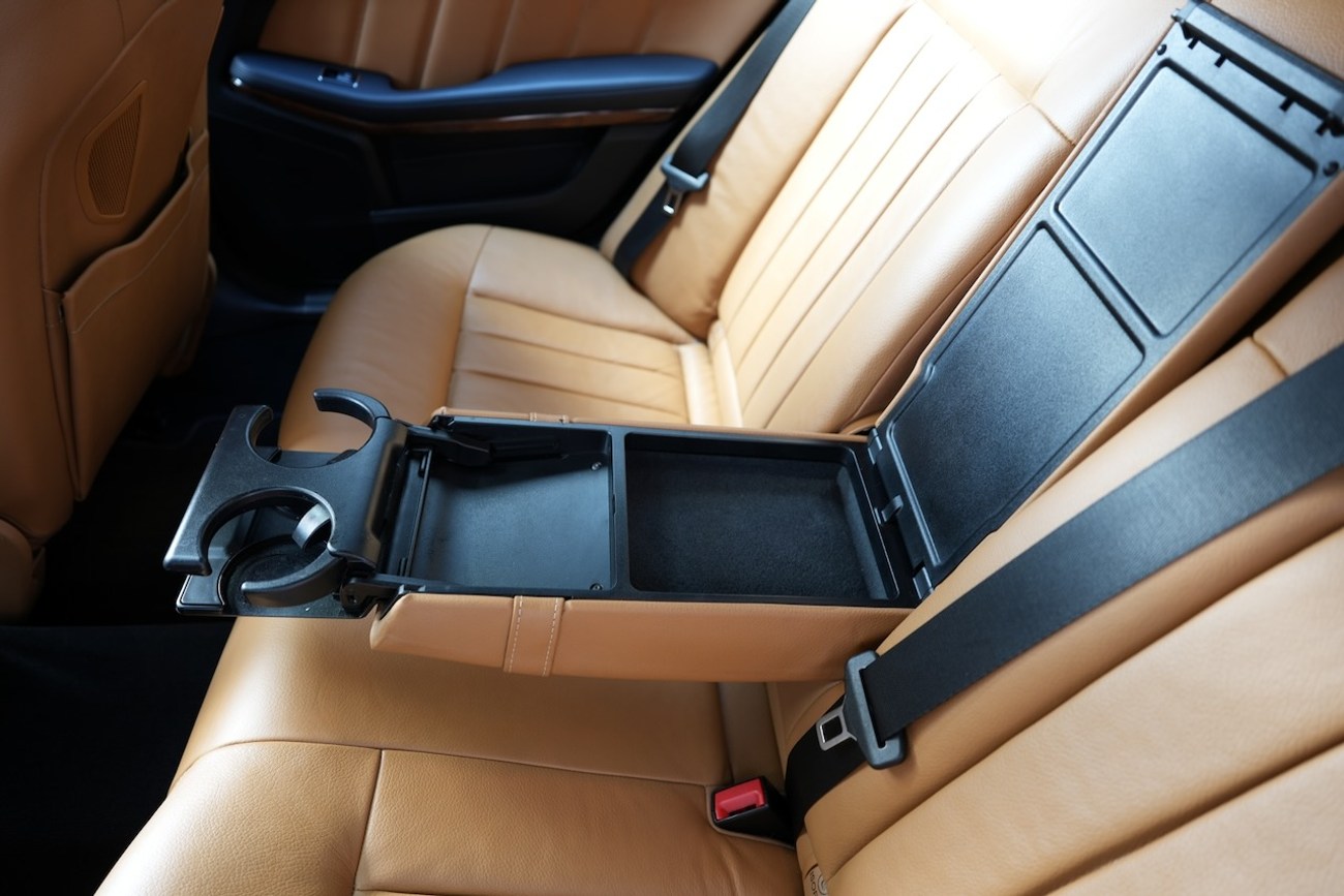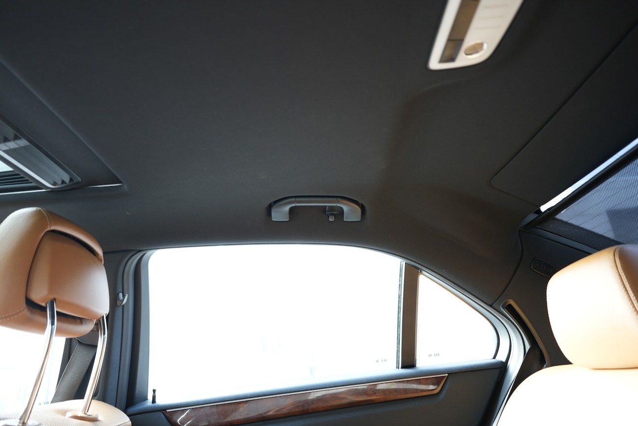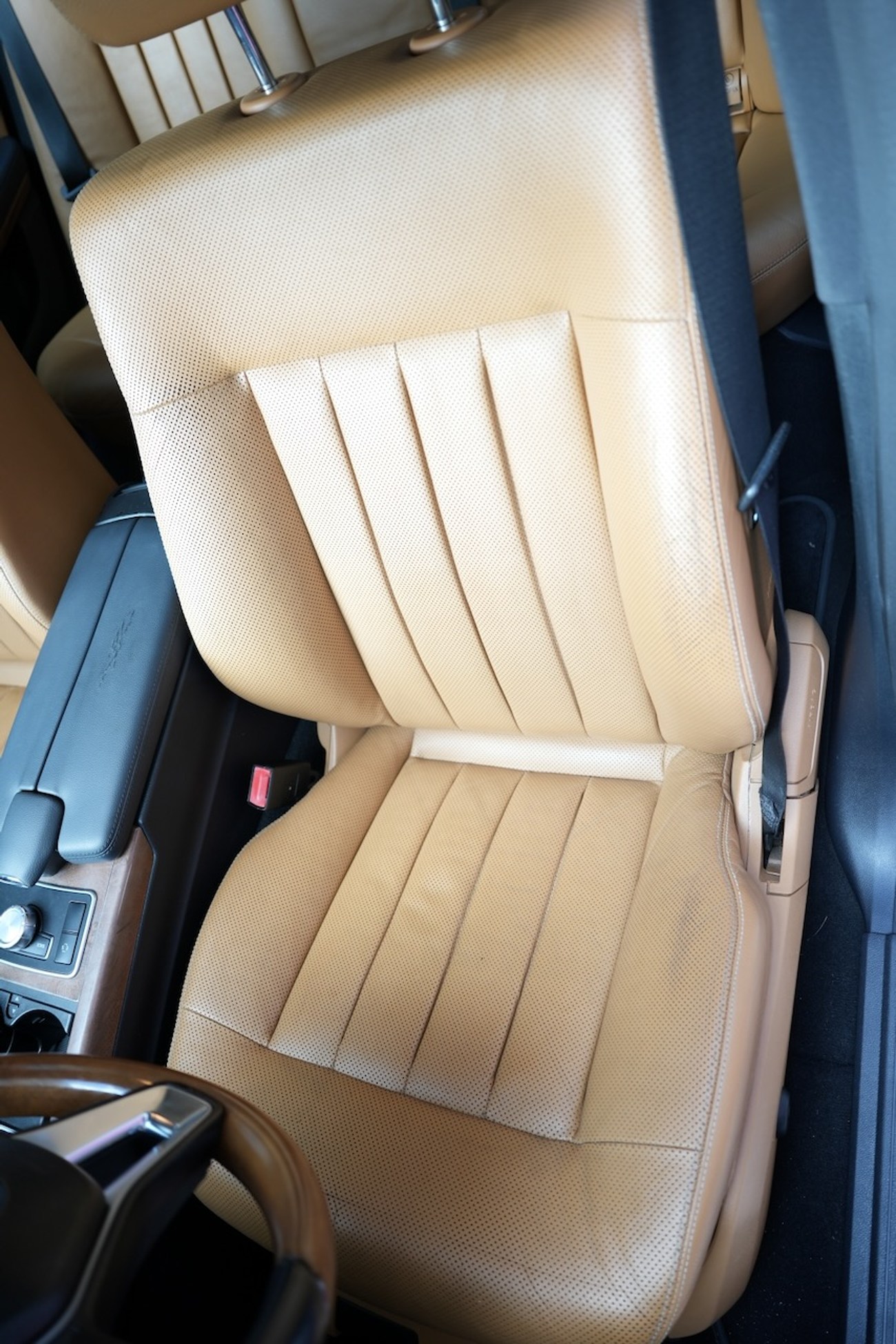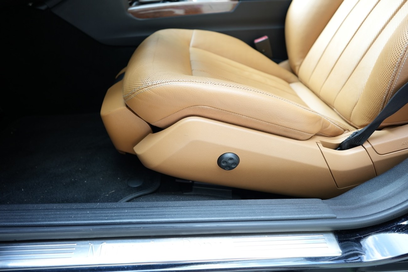 The cabin is upholstered in Natural Brown Leather (264) with a contrasting upper dashboard. Burl walnut wood trim lines the center console, gear selector, dash, steering wheel and door panels with some visible fading. Both front seats are heated and ventilated with three-position memory and driver lumbar adjustment. Additional interior amenities include Keyless-Go, dual-zone automatic climate control, COMAND infotainment with hard-drive navigation, bluetooth audio, a through-loading feature, and an electric rear sunshade. The cabin shows little wear and OEM velour floor mats are pictured.