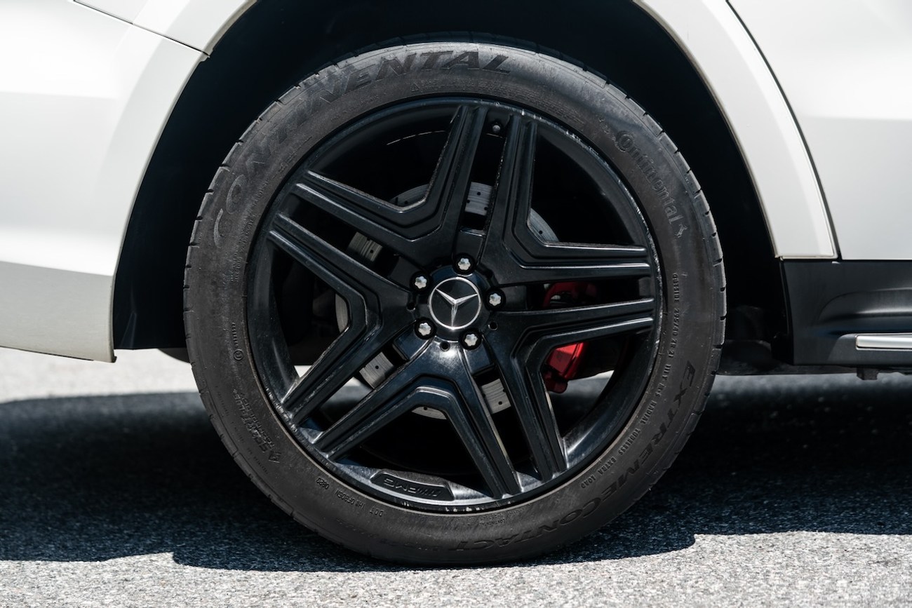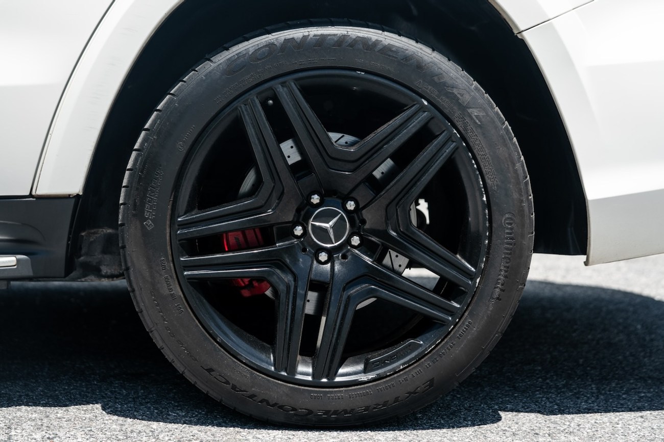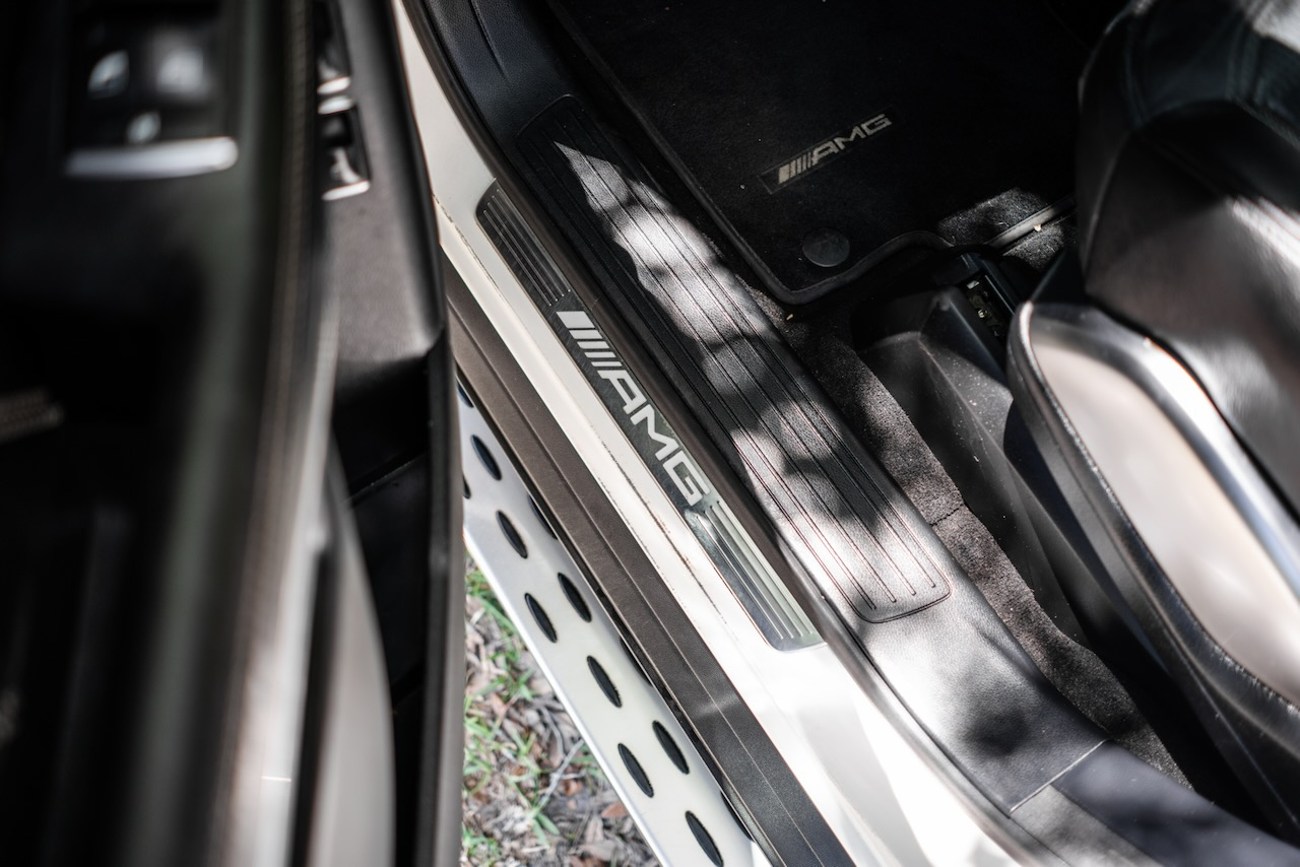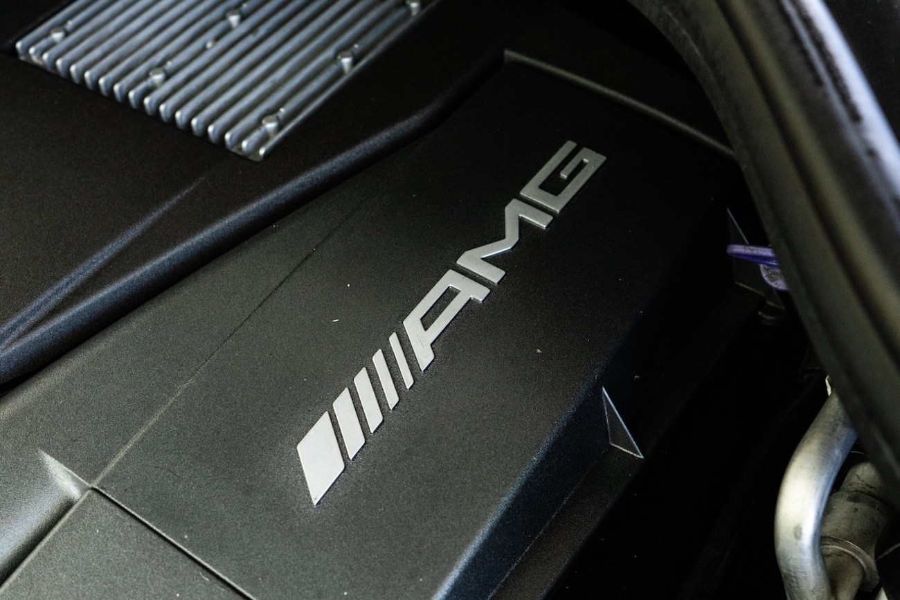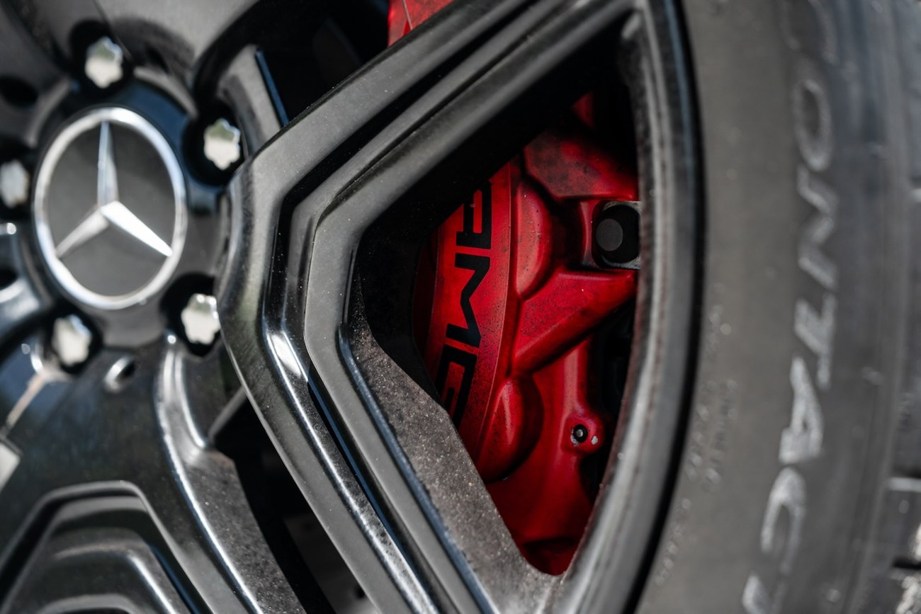 The optional 21” AMG twin multi-spoke alloy wheels are wrapped in Continental tires measuring 295/40 were installed in 2025. AMG sport suspension based on Airmatic offers adjustable ride height and damping and includes active roll stabilization. Red-painted brake calipers bite down on ventilated discs front and rear and wear black AMG lettering.