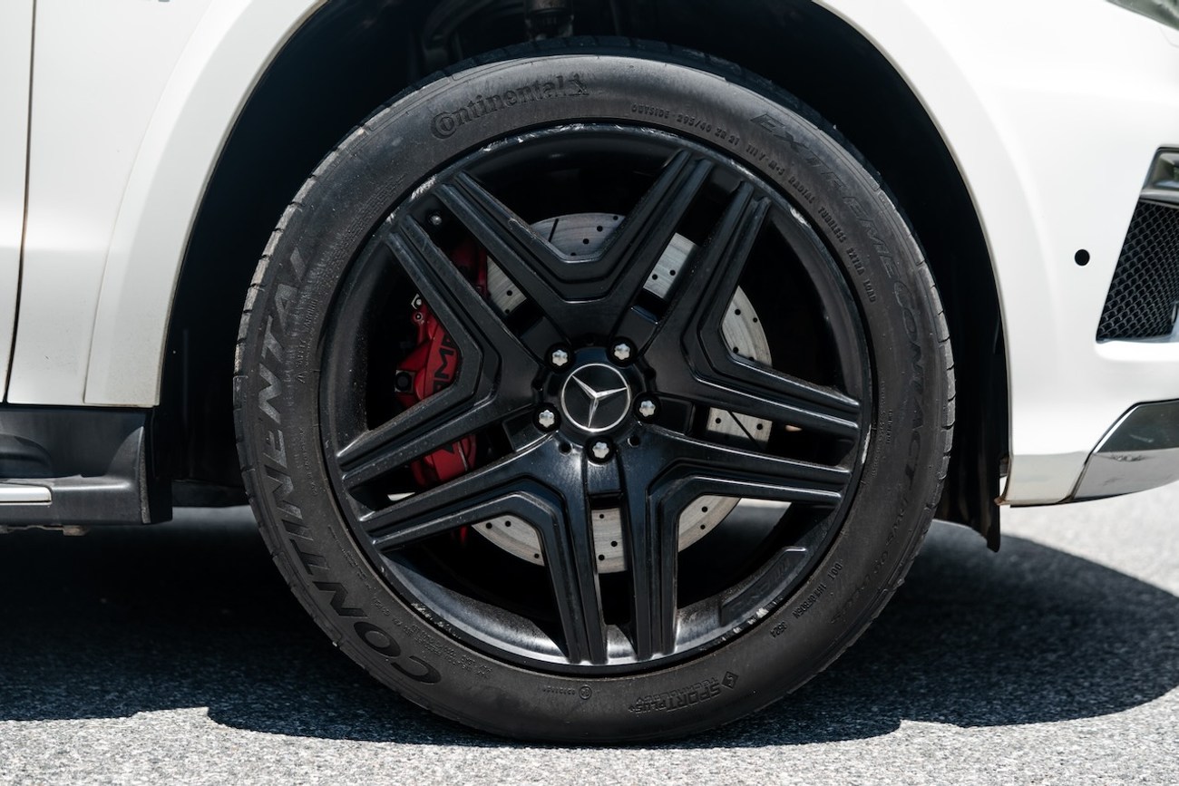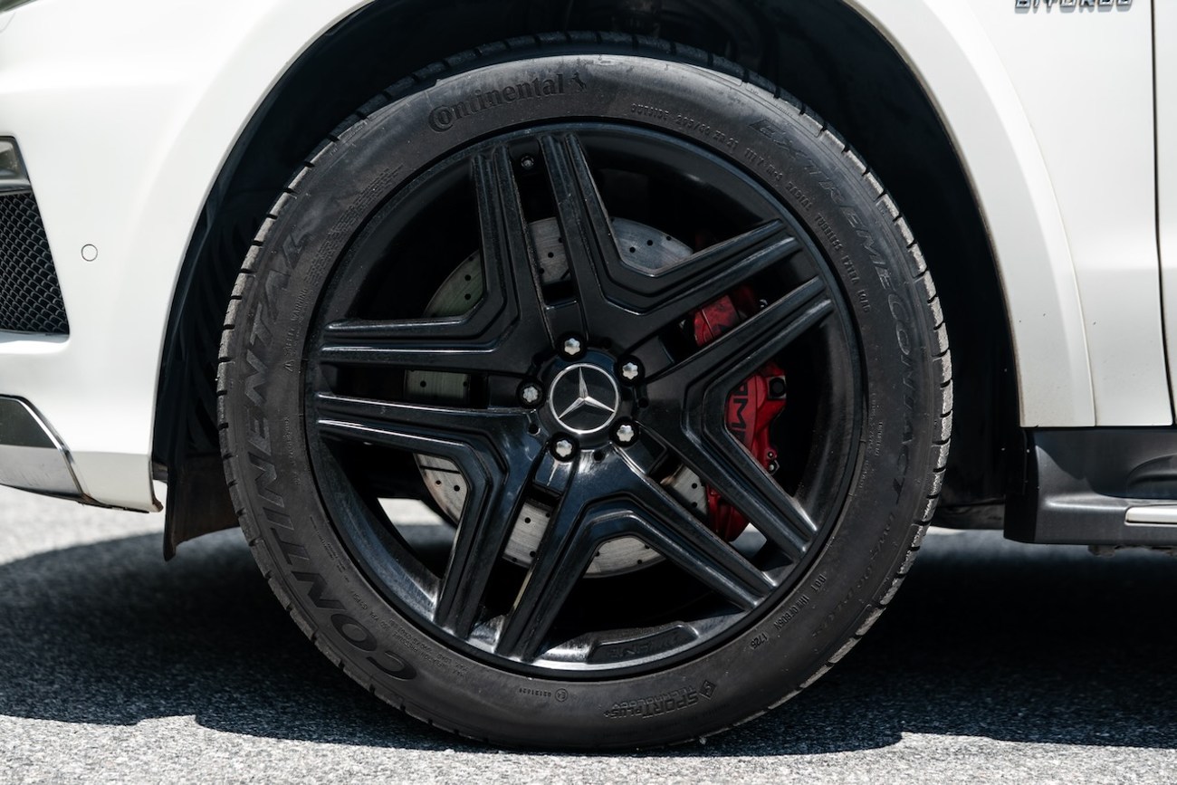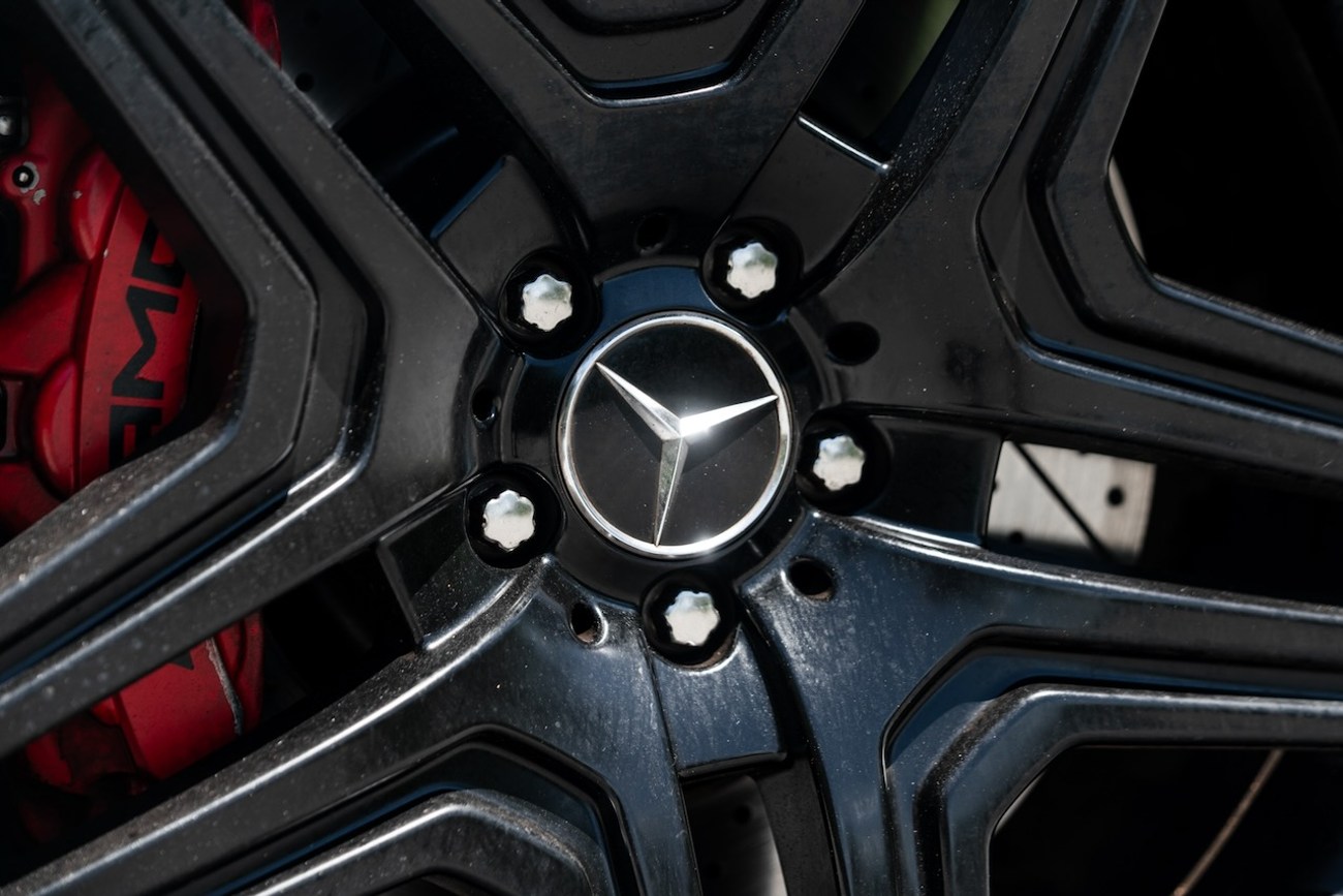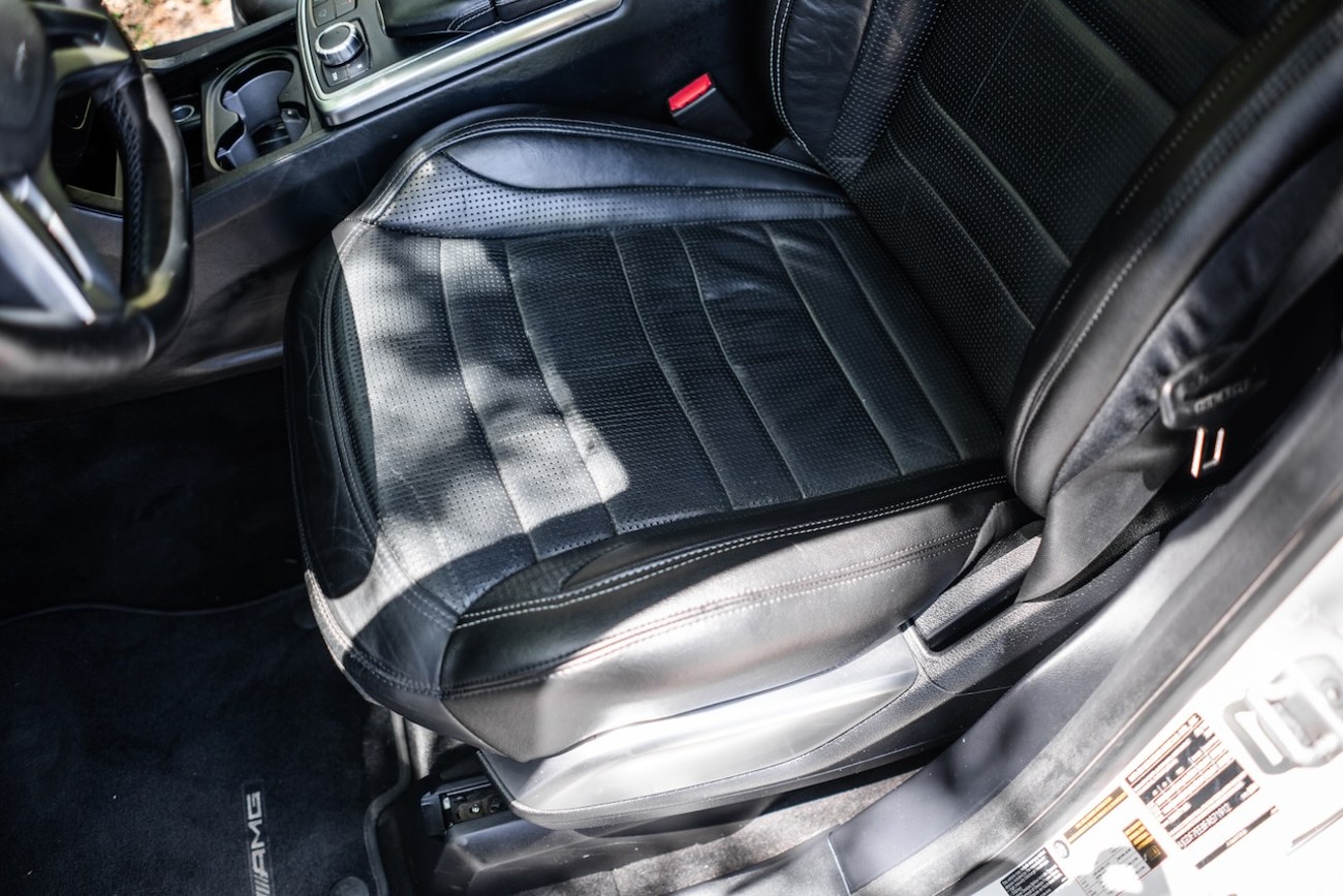 The optional 21” AMG twin multi-spoke alloy wheels are wrapped in Continental tires measuring 295/40 were installed in 2025. AMG sport suspension based on Airmatic offers adjustable ride height and damping and includes active roll stabilization. Red-painted brake calipers bite down on ventilated discs front and rear and wear black AMG lettering.