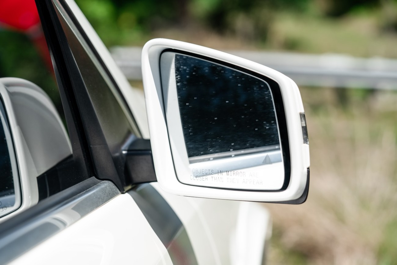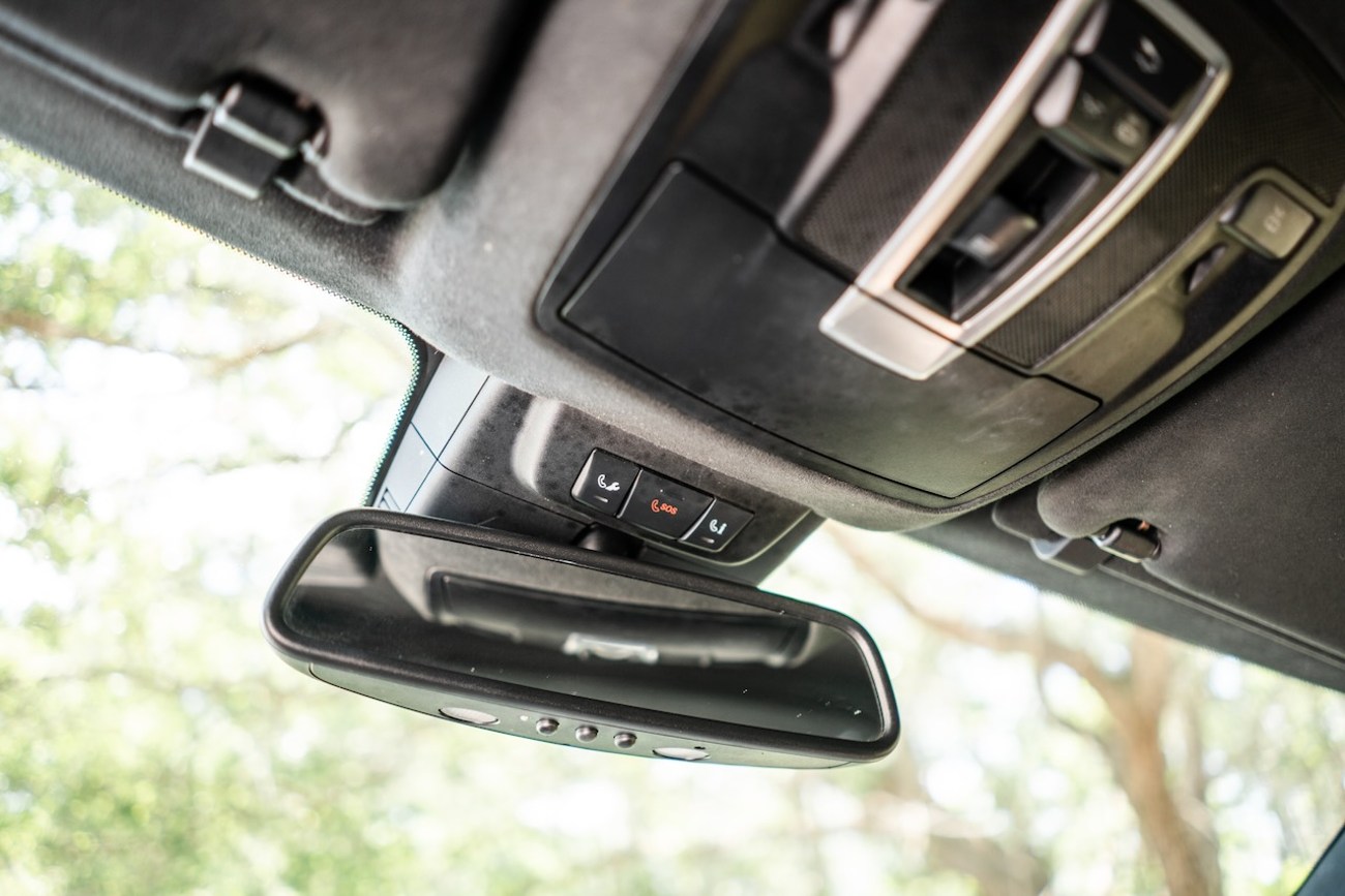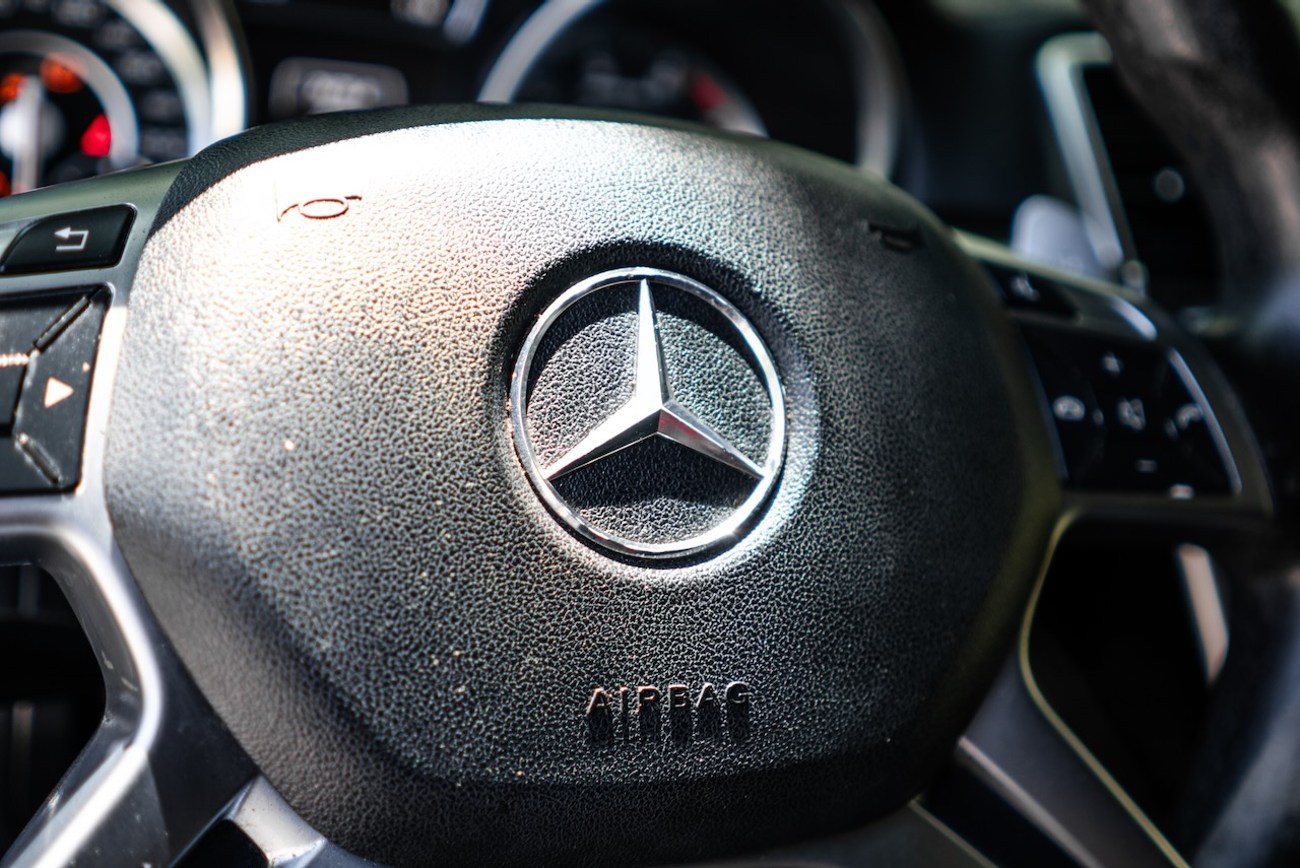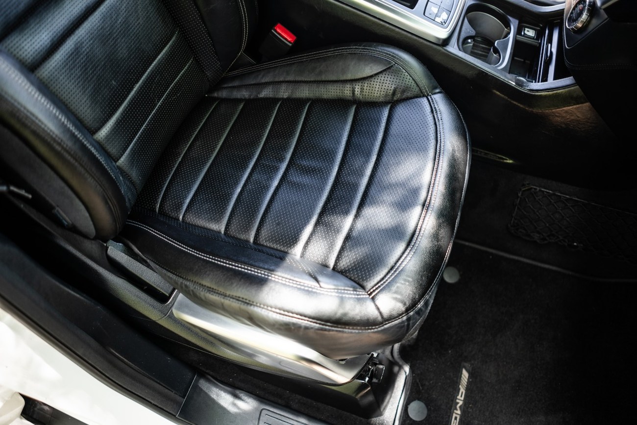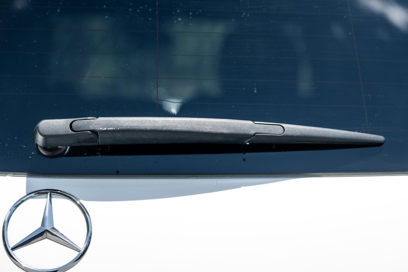 The optional 21” AMG twin multi-spoke alloy wheels are wrapped in Continental tires measuring 295/40 were installed in 2025. AMG sport suspension based on Airmatic offers adjustable ride height and damping and includes active roll stabilization. Red-painted brake calipers bite down on ventilated discs front and rear and wear black AMG lettering.