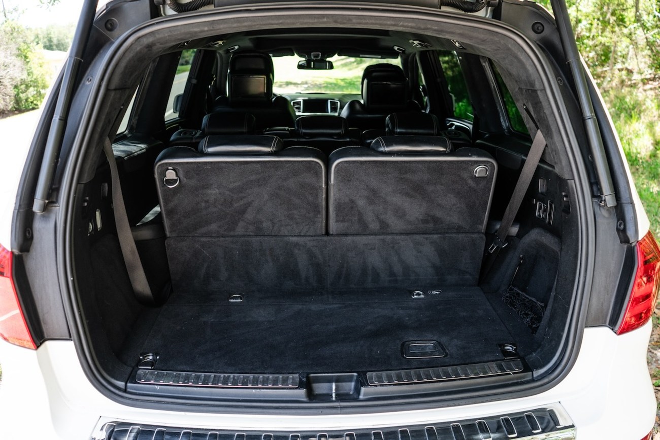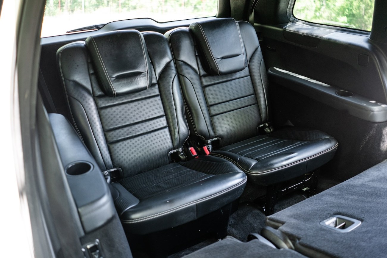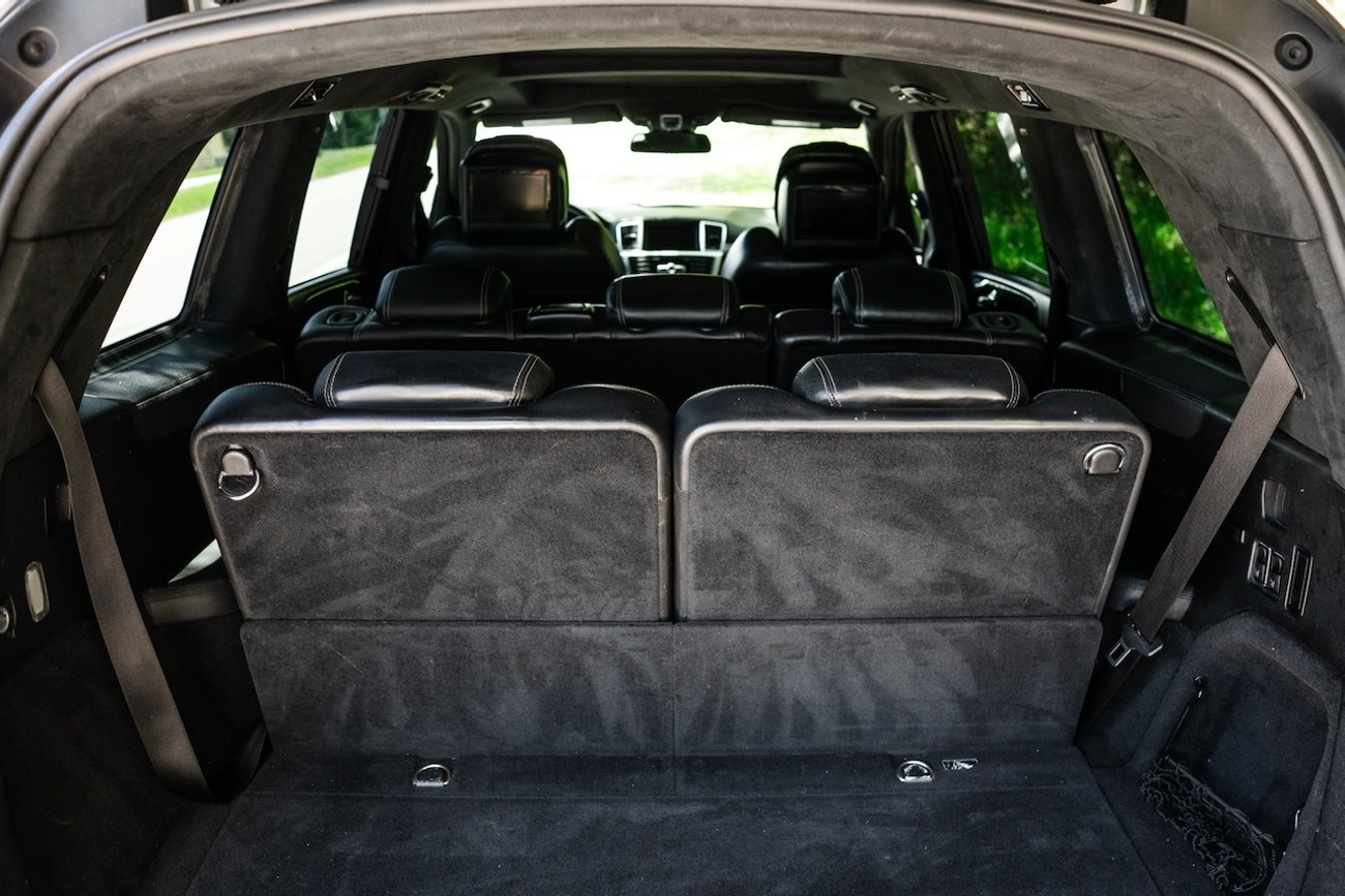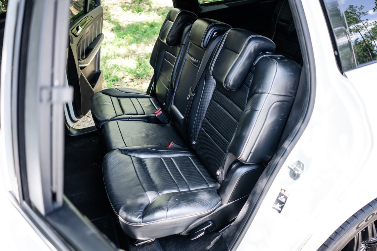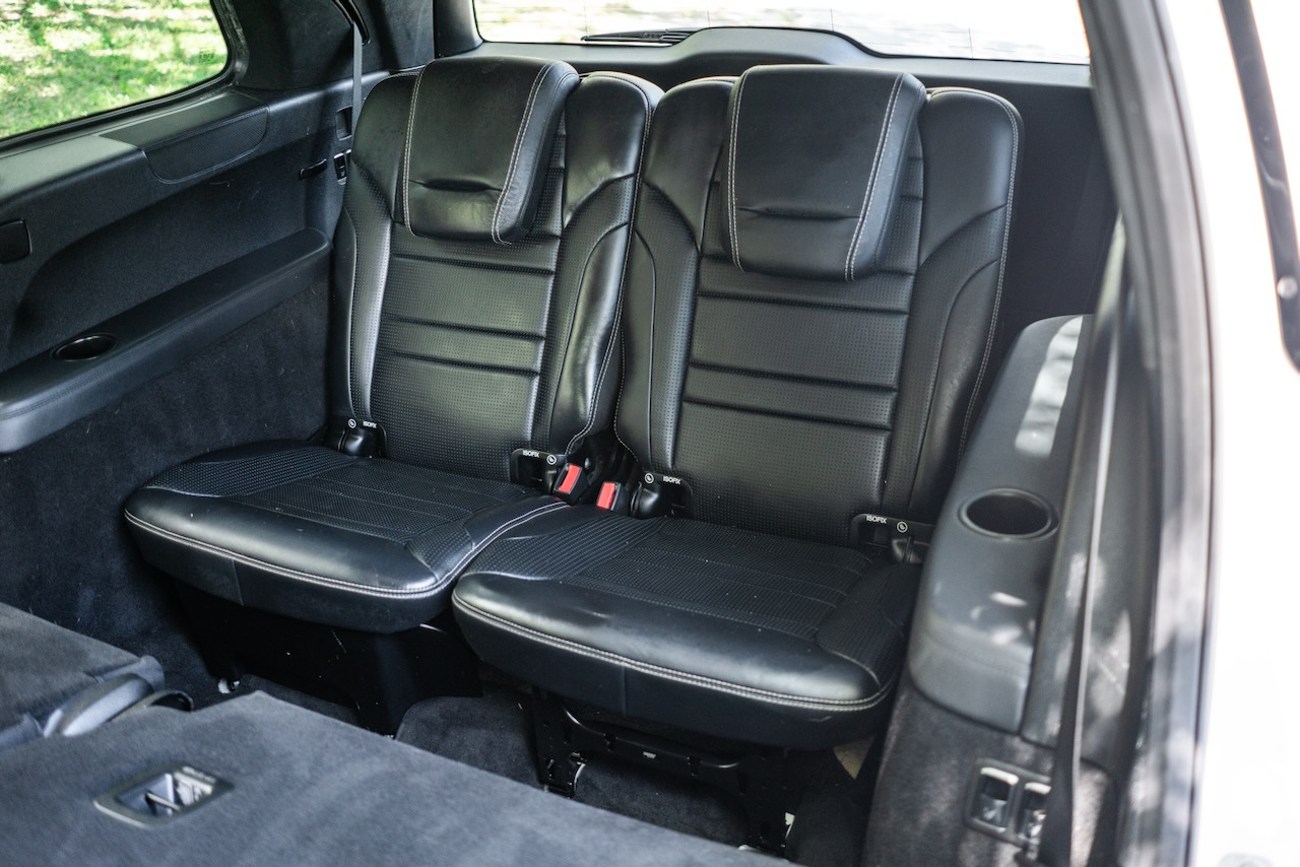 The bucket seats are trimmed in Exclusive Black Leather (X11) with black carpets and a black dinamica headliner. Optional designo Piano-Black trim accents the dash, center console, and doors. Both front seats are heated and ventilated and include multicontour with massage and adjustable lumbar support. Additional interior amenities include heated and cooled front cup holders, heated rear seats, three-zone automatic climate control, folding second row seats, an 8” COMAND display with Apple Carplay, and harman / kardon surround sound. Both second and third-row seats fold flat to provide a large loading area.