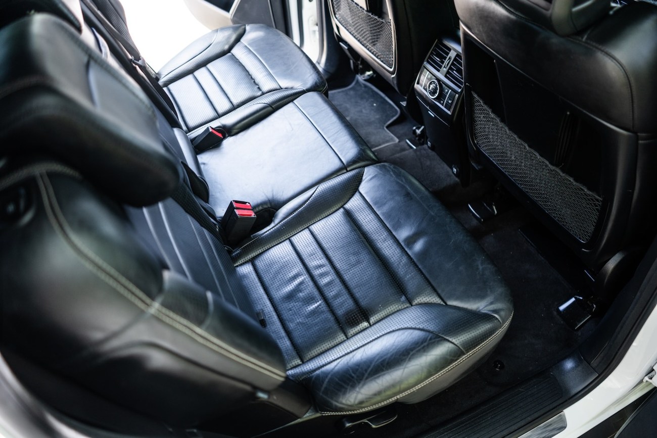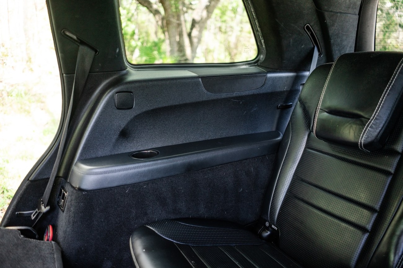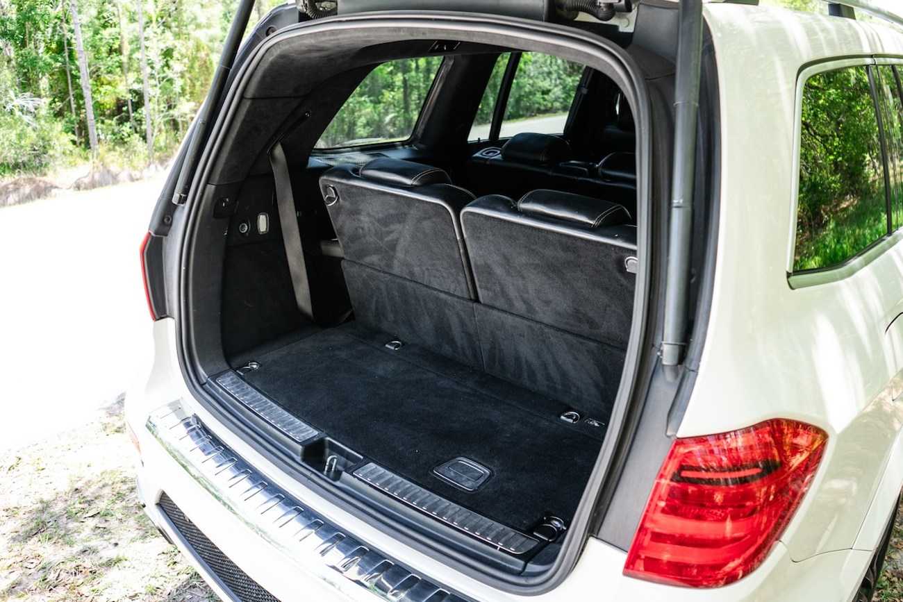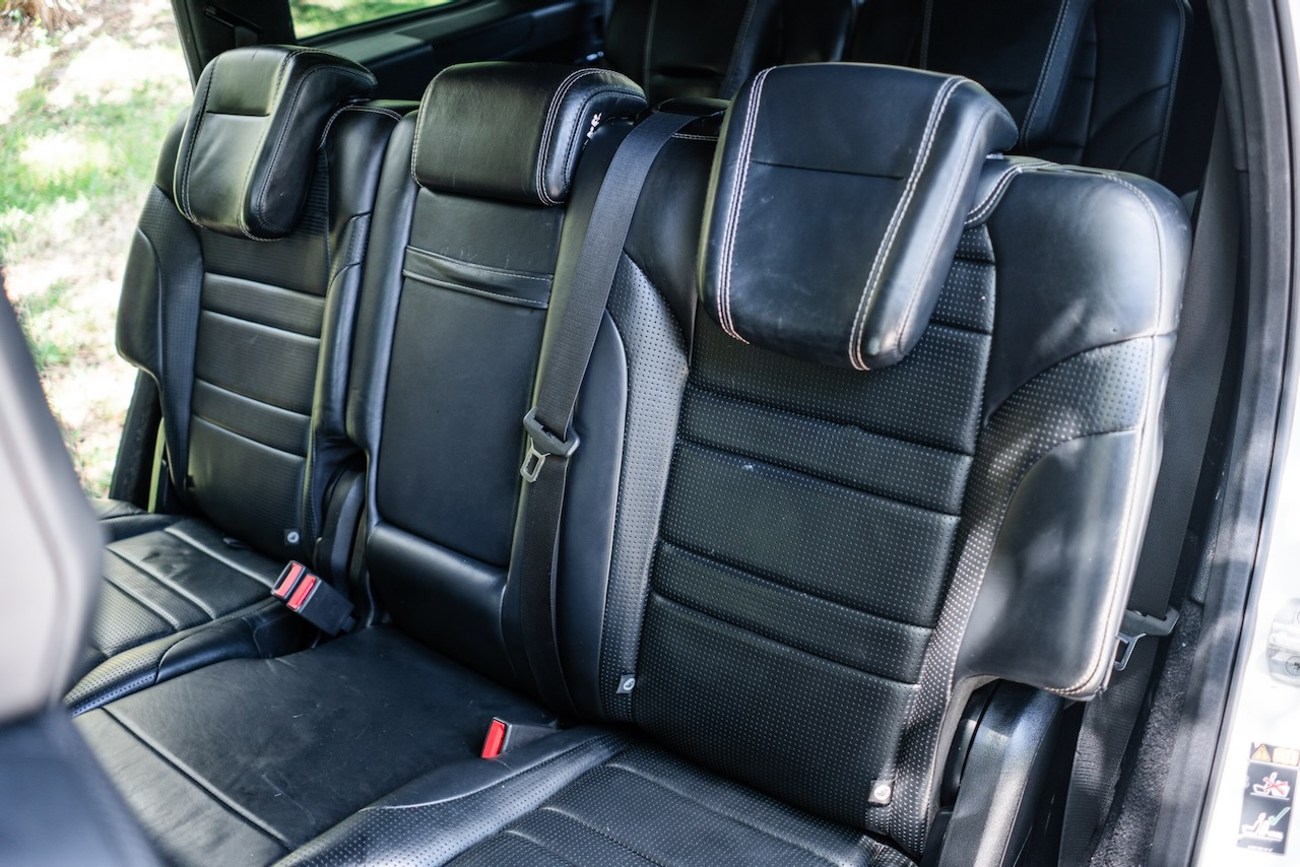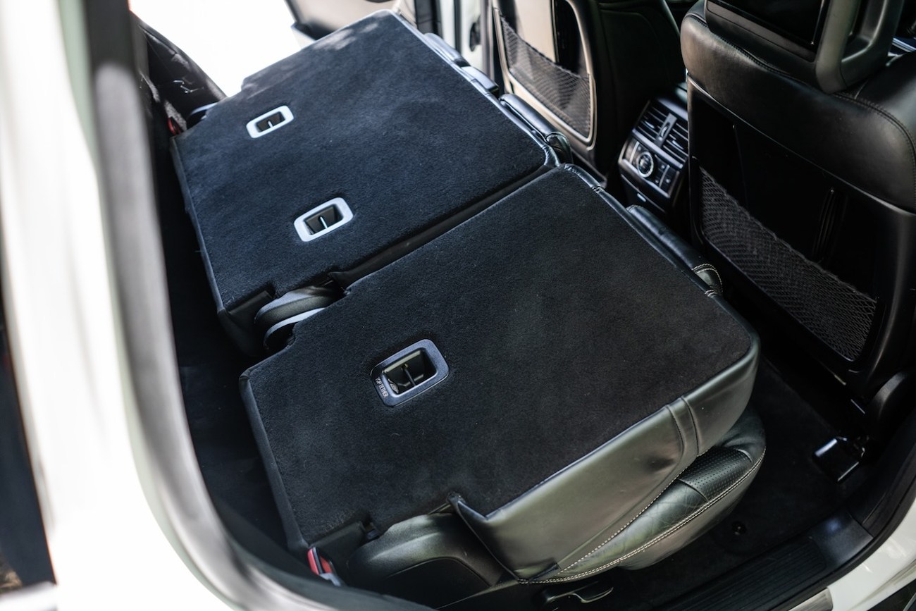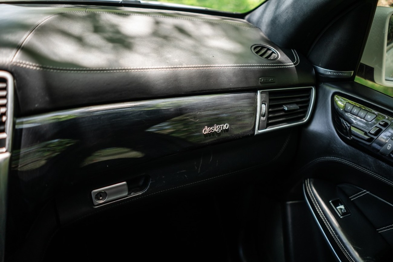 The bucket seats are trimmed in Exclusive Black Leather (X11) with black carpets and a black dinamica headliner. Optional designo Piano-Black trim accents the dash, center console, and doors. Both front seats are heated and ventilated and include multicontour with massage and adjustable lumbar support. Additional interior amenities include heated and cooled front cup holders, heated rear seats, three-zone automatic climate control, folding second row seats, an 8” COMAND display with Apple Carplay, and harman / kardon surround sound. Both second and third-row seats fold flat to provide a large loading area.