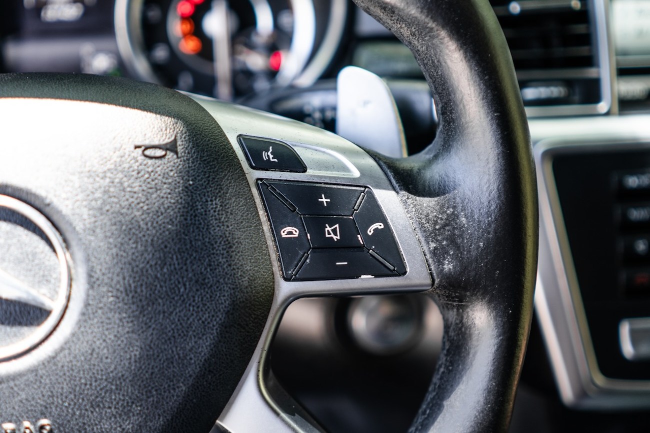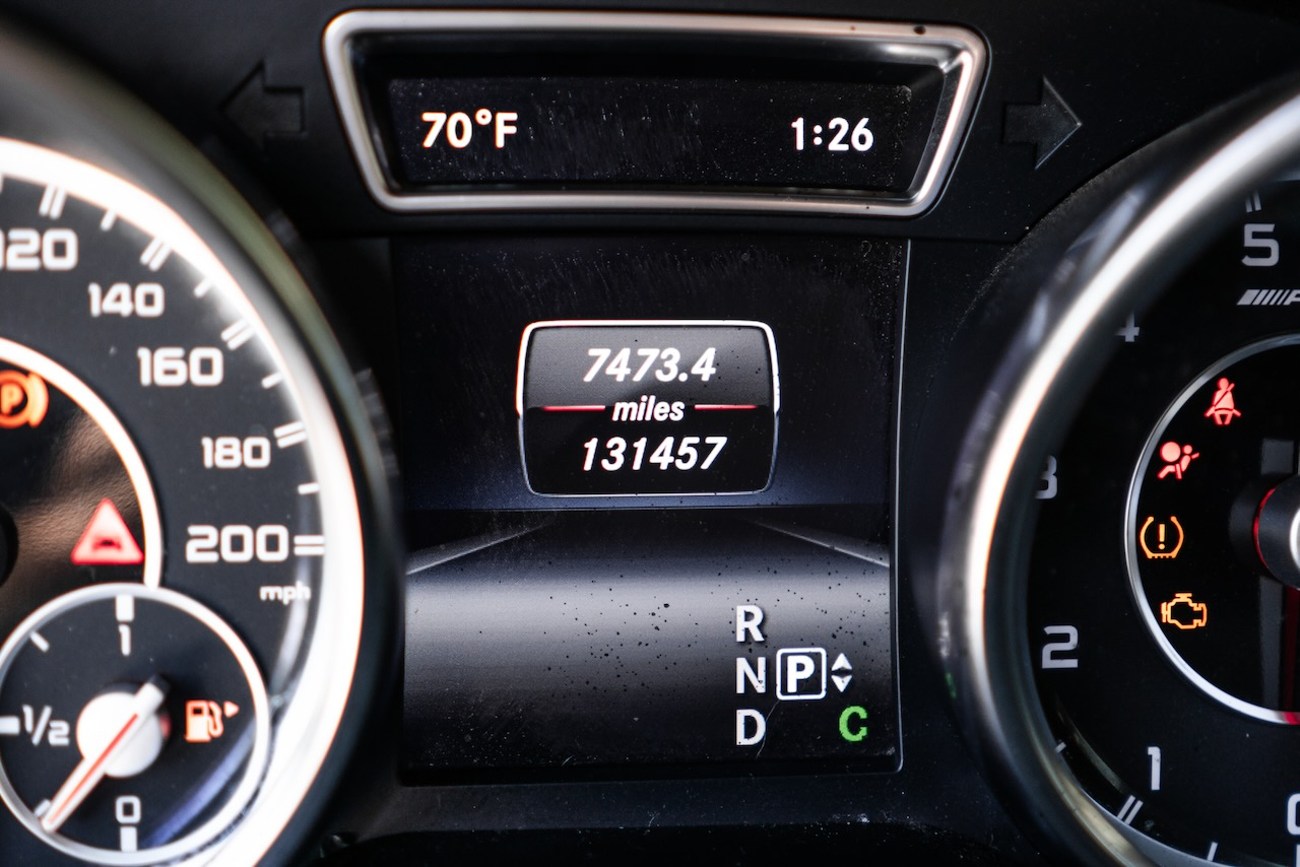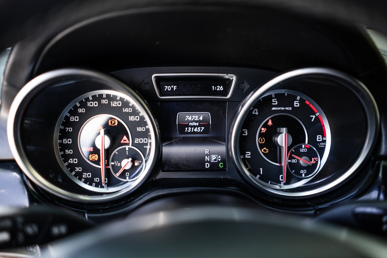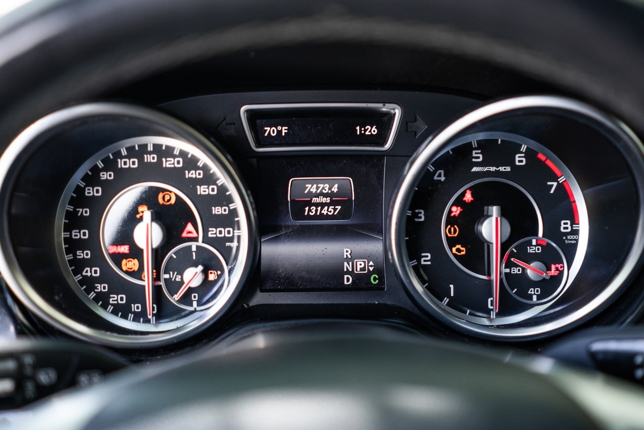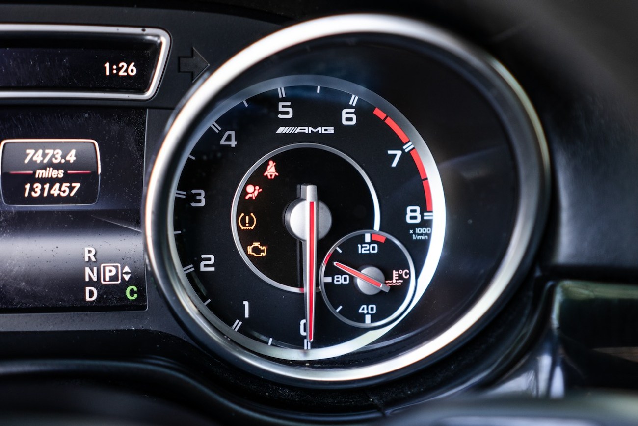 The AMG performance steering wheel is heated and frames an analog 200mph speedometer, an 8k-rpm tachometer and gauges for fuel level and coolant temperature. The centrally-mounted digital display can be configured to show various vehicle information including the digital odometer which currently shows just over 131k from new.
