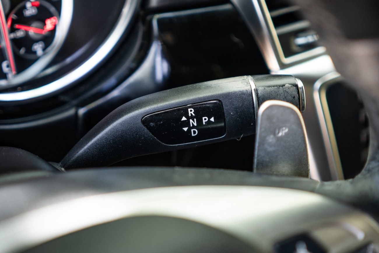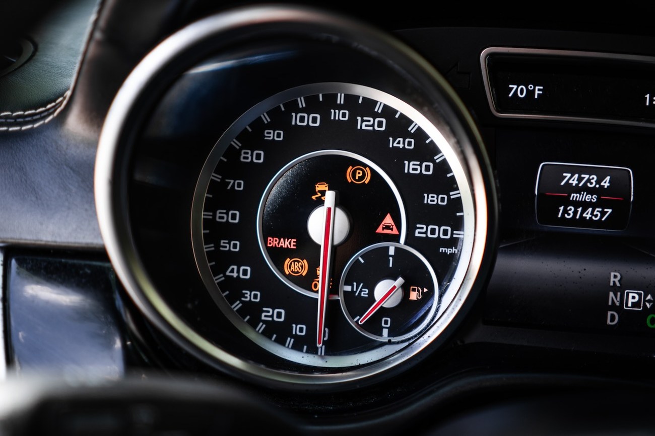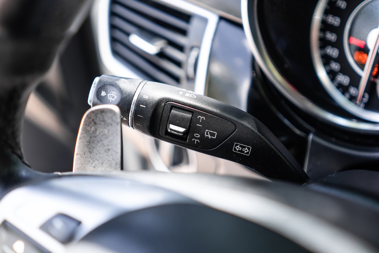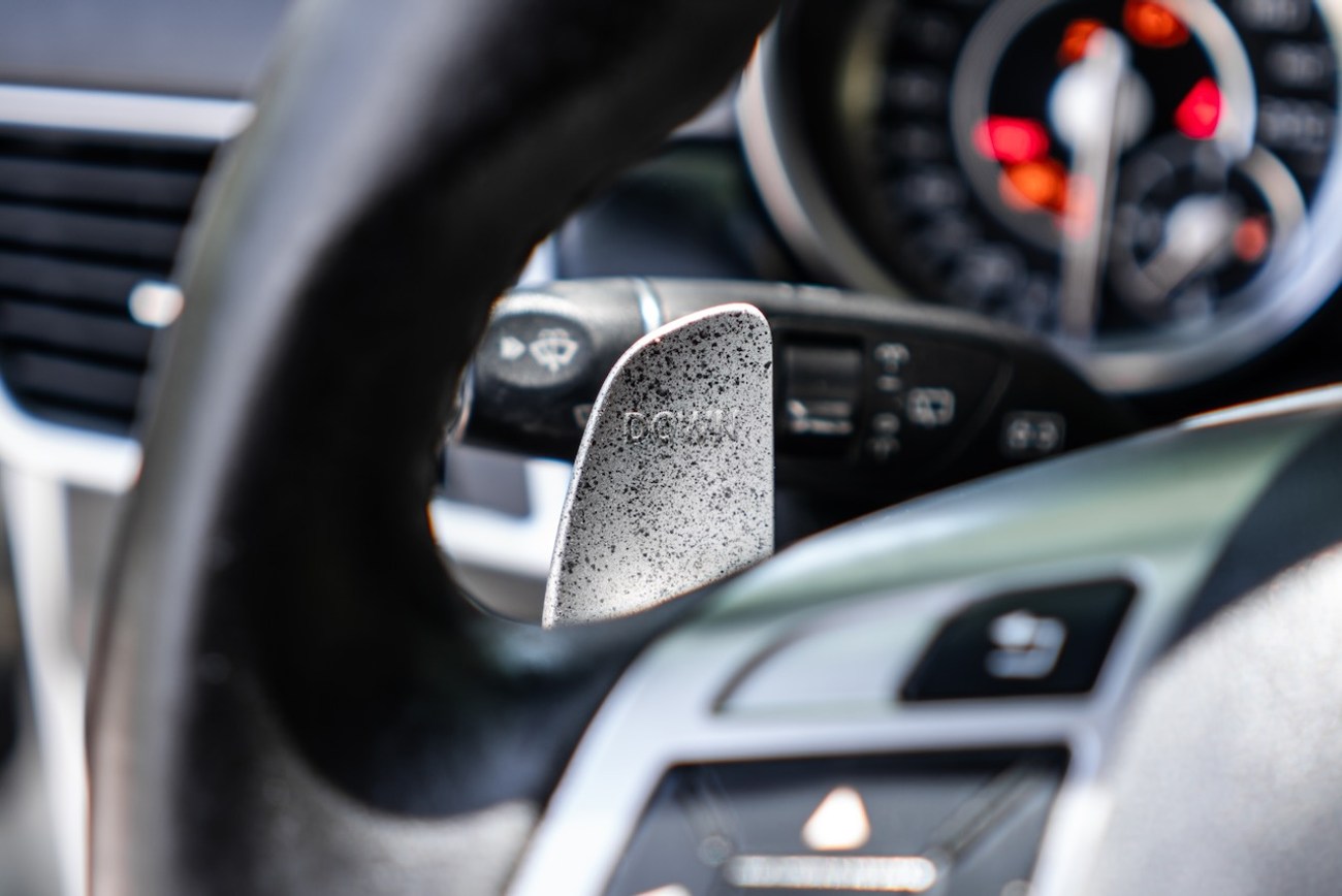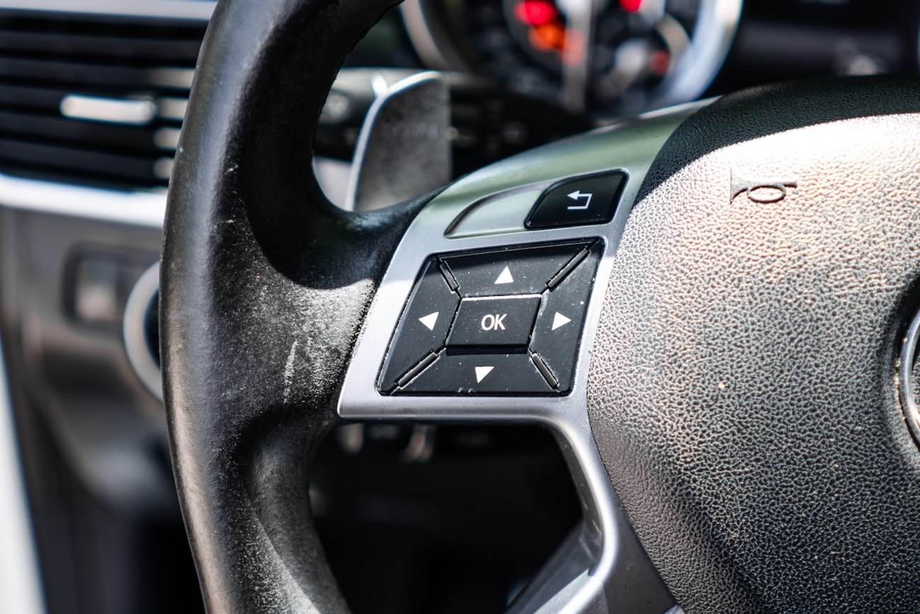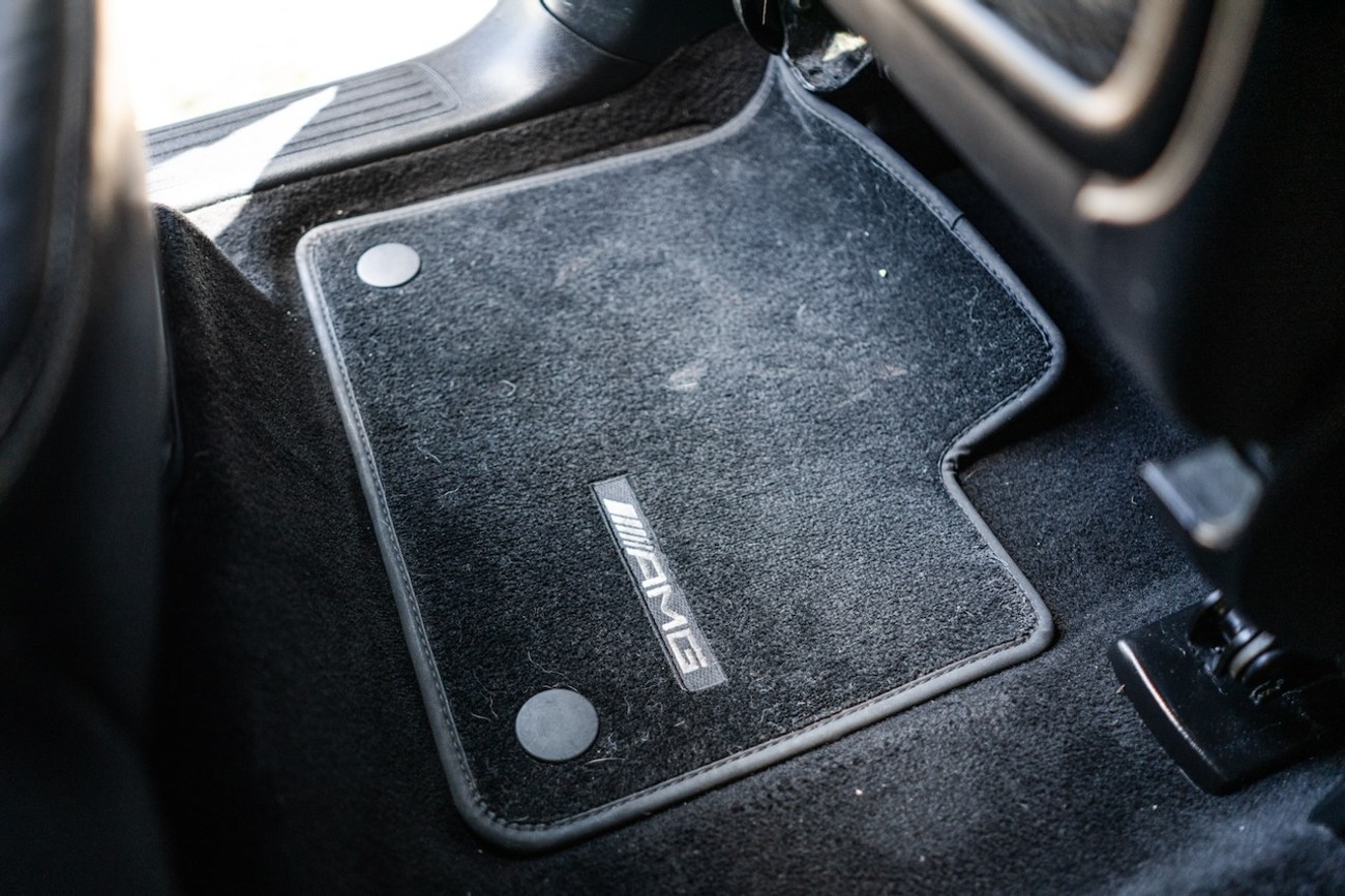 The AMG performance steering wheel is heated and frames an analog 200mph speedometer, an 8k-rpm tachometer and gauges for fuel level and coolant temperature. The centrally-mounted digital display can be configured to show various vehicle information including the digital odometer which currently shows just over 131k from new.