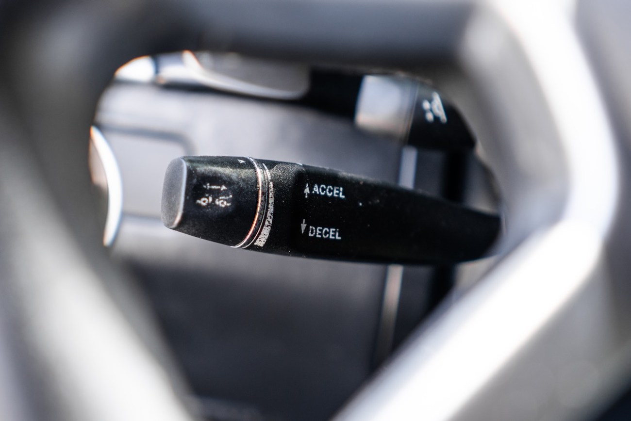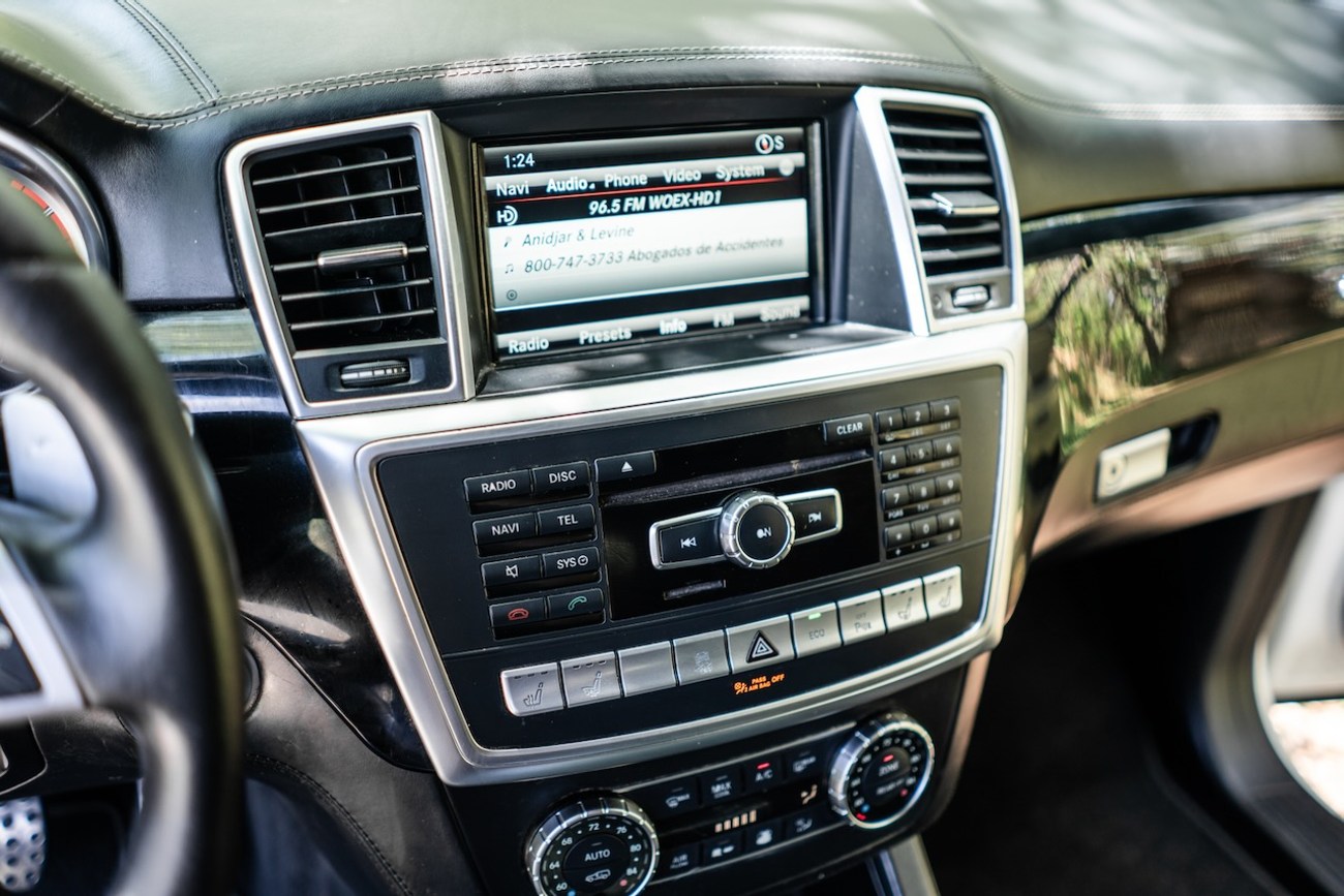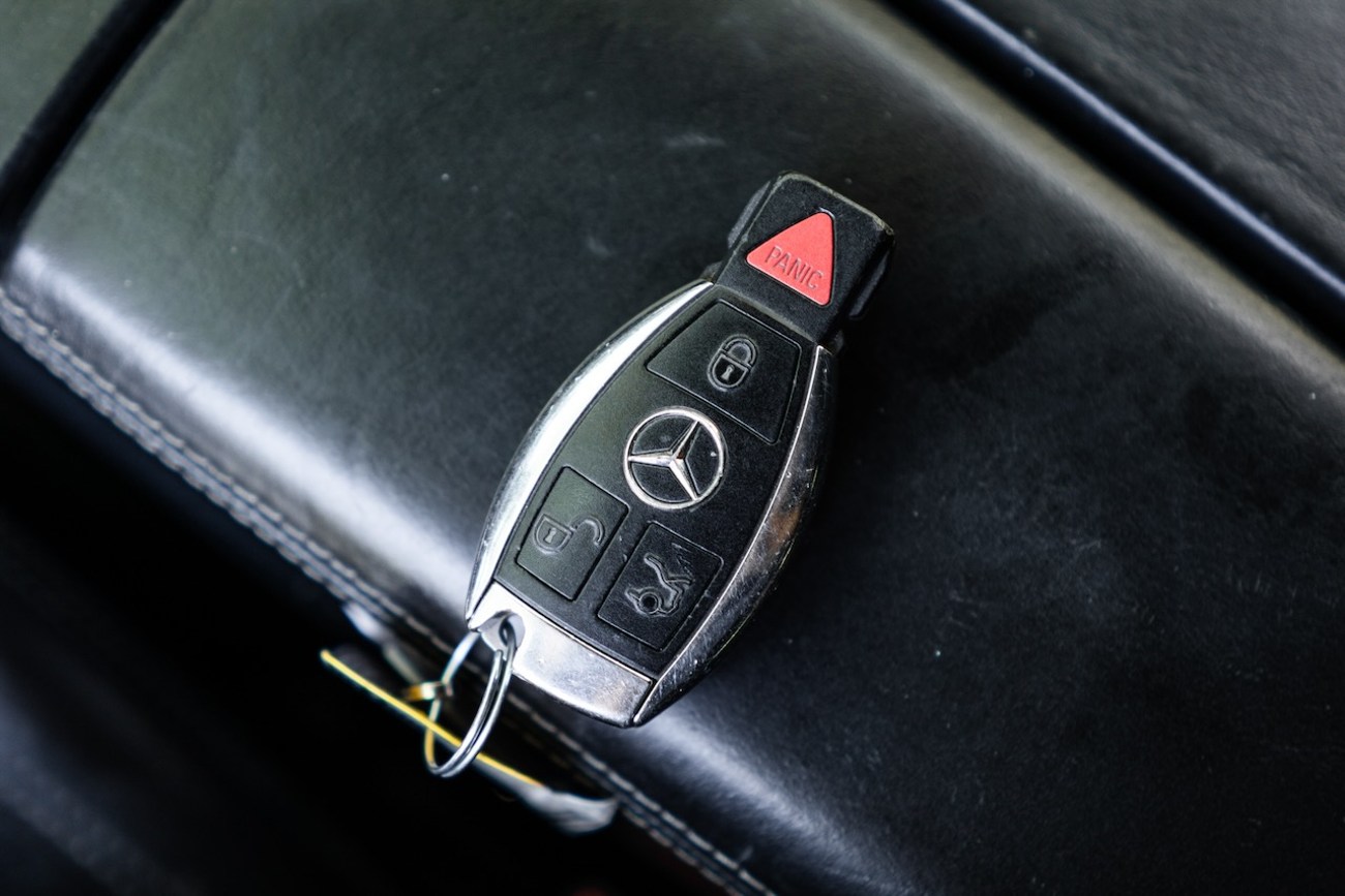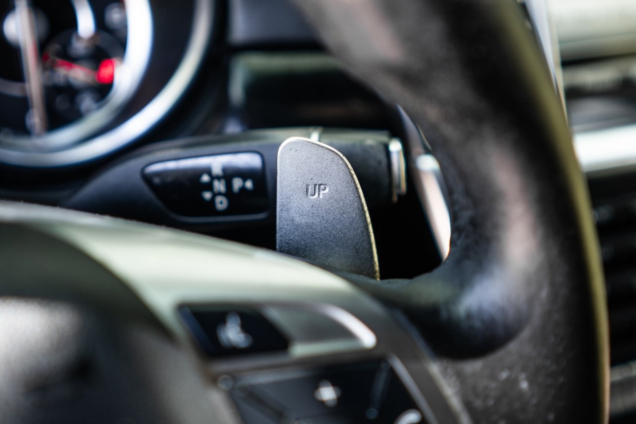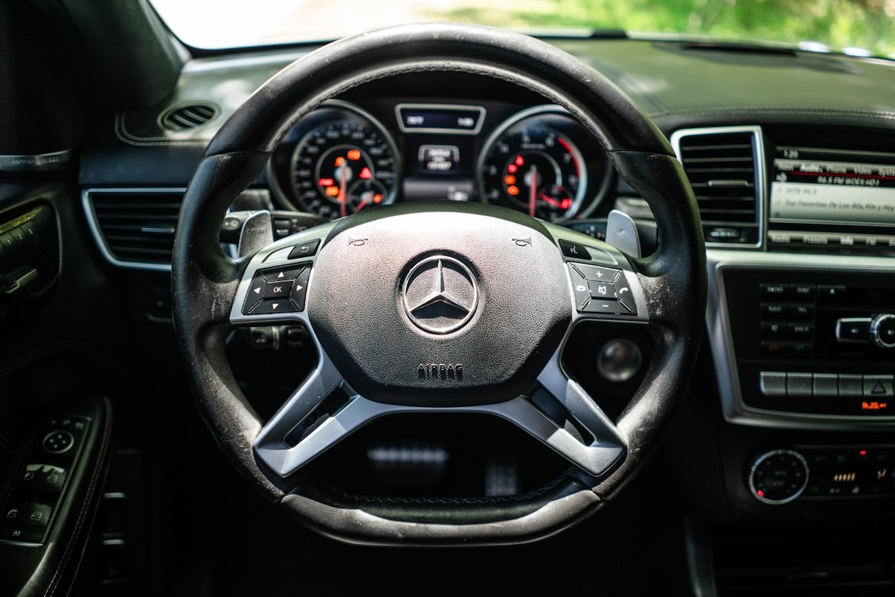 The AMG performance steering wheel is heated and frames an analog 200mph speedometer, an 8k-rpm tachometer and gauges for fuel level and coolant temperature. The centrally-mounted digital display can be configured to show various vehicle information including the digital odometer which currently shows just over 131k from new.