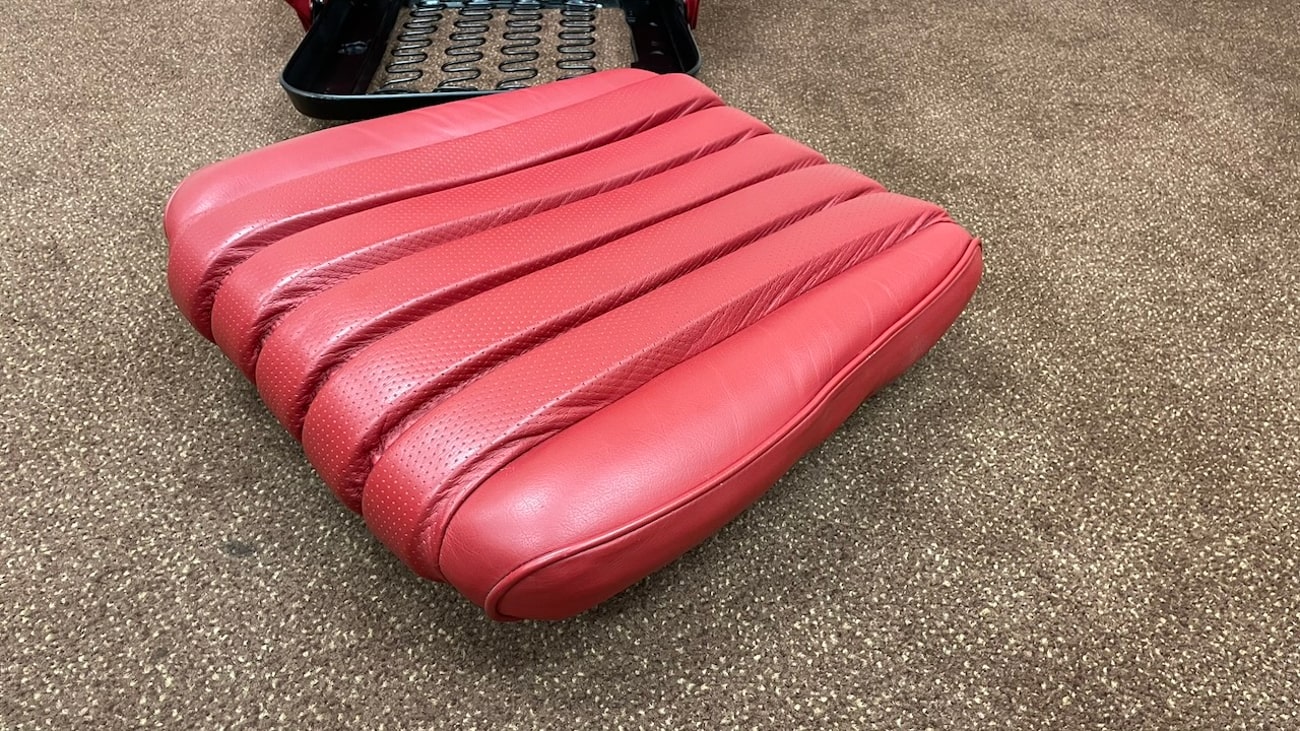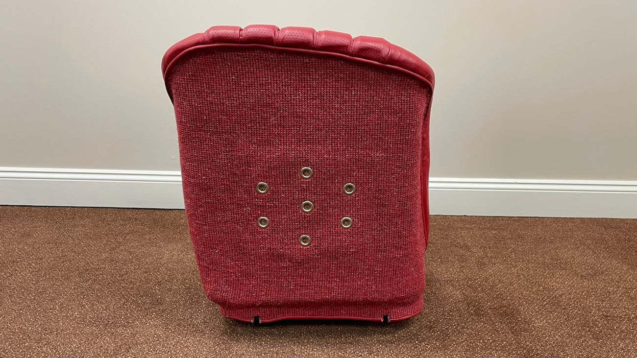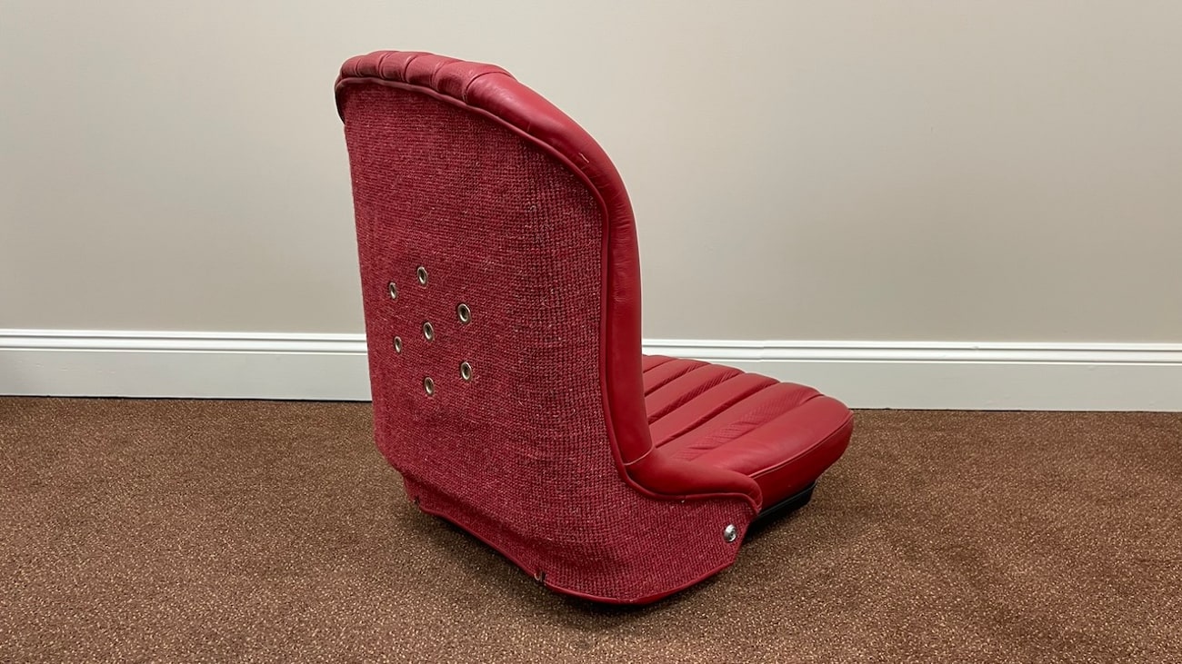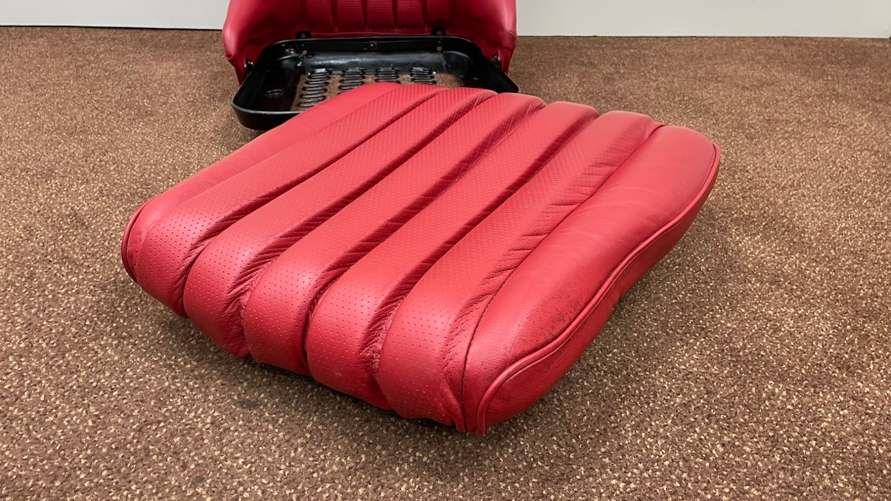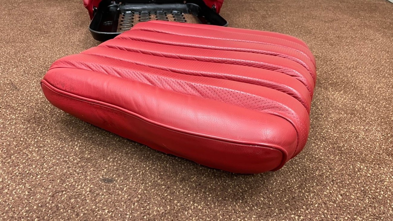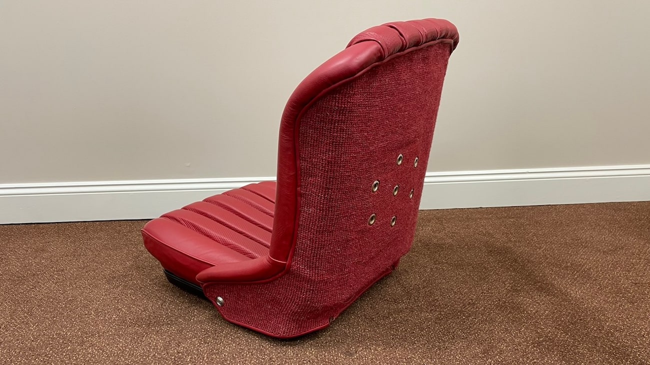 Loop cloth seat backings in Red were also applied to the rear of the seat back with new rovers around the ventilation holes. The natural fibers that acted as cushions for the original seats were replaced with a black synthetic blend that will not crumble and degrade over time. New buttons, rivets, bolts, and washers can be seen throughout. A small scratch in the leather is noted on the side of one of the seat backings.