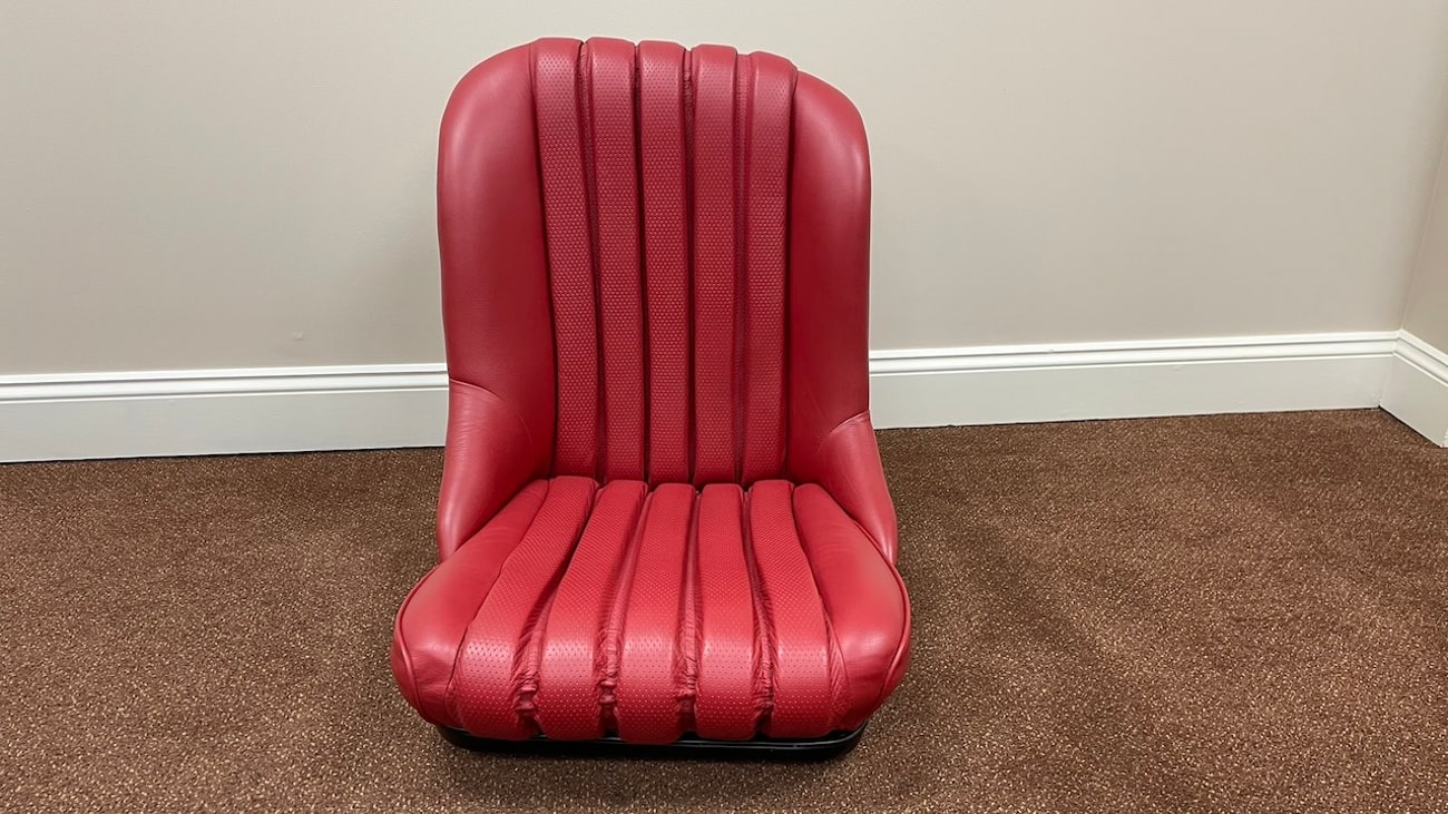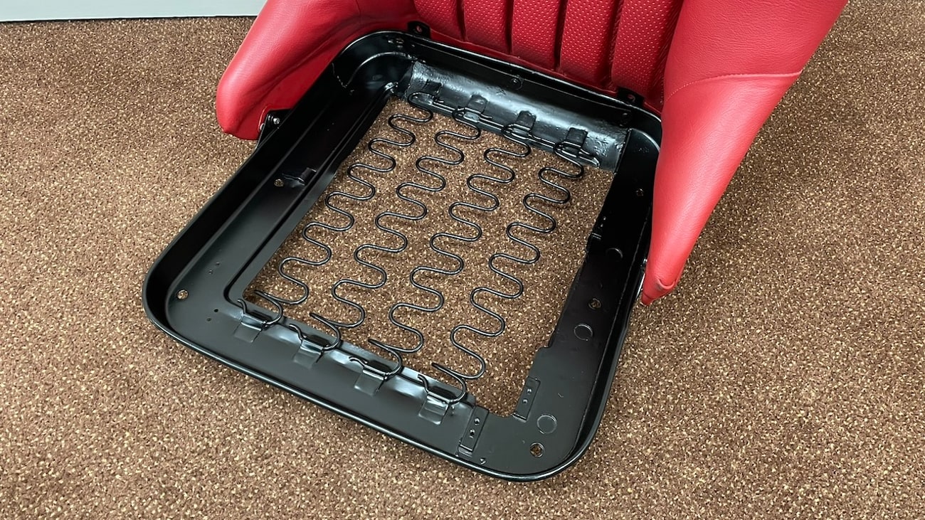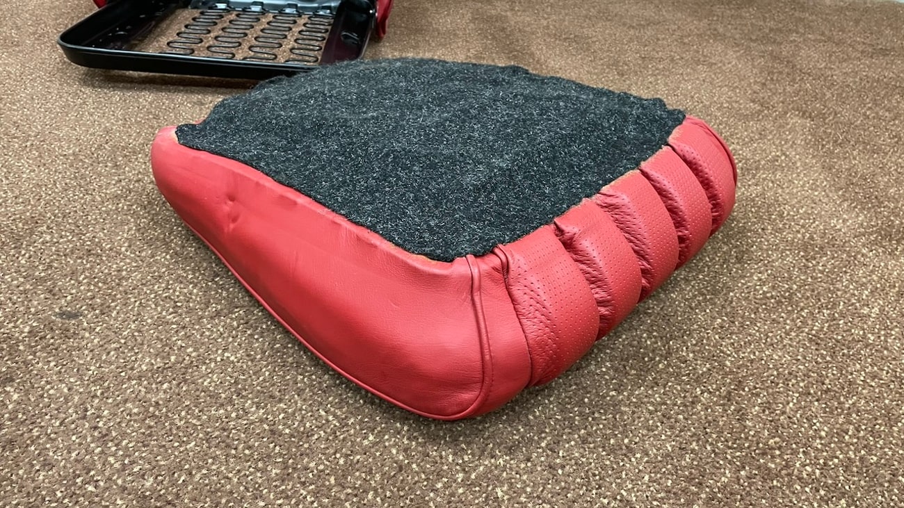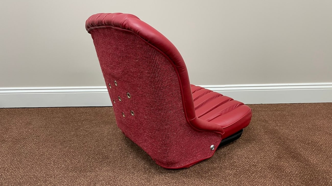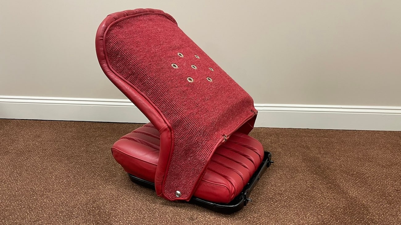 Loop cloth seat backings in Red were also applied to the rear of the seat back with new rovers around the ventilation holes. The natural fibers that acted as cushions for the original seats were replaced with a black synthetic blend that will not crumble and degrade over time. New buttons, rivets, bolts, and washers can be seen throughout. A small scratch in the leather is noted on the side of one of the seat backings.
