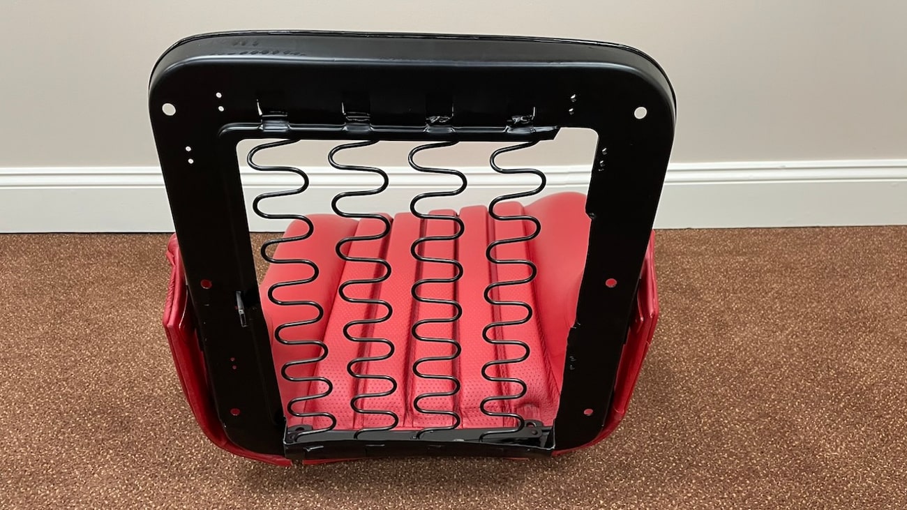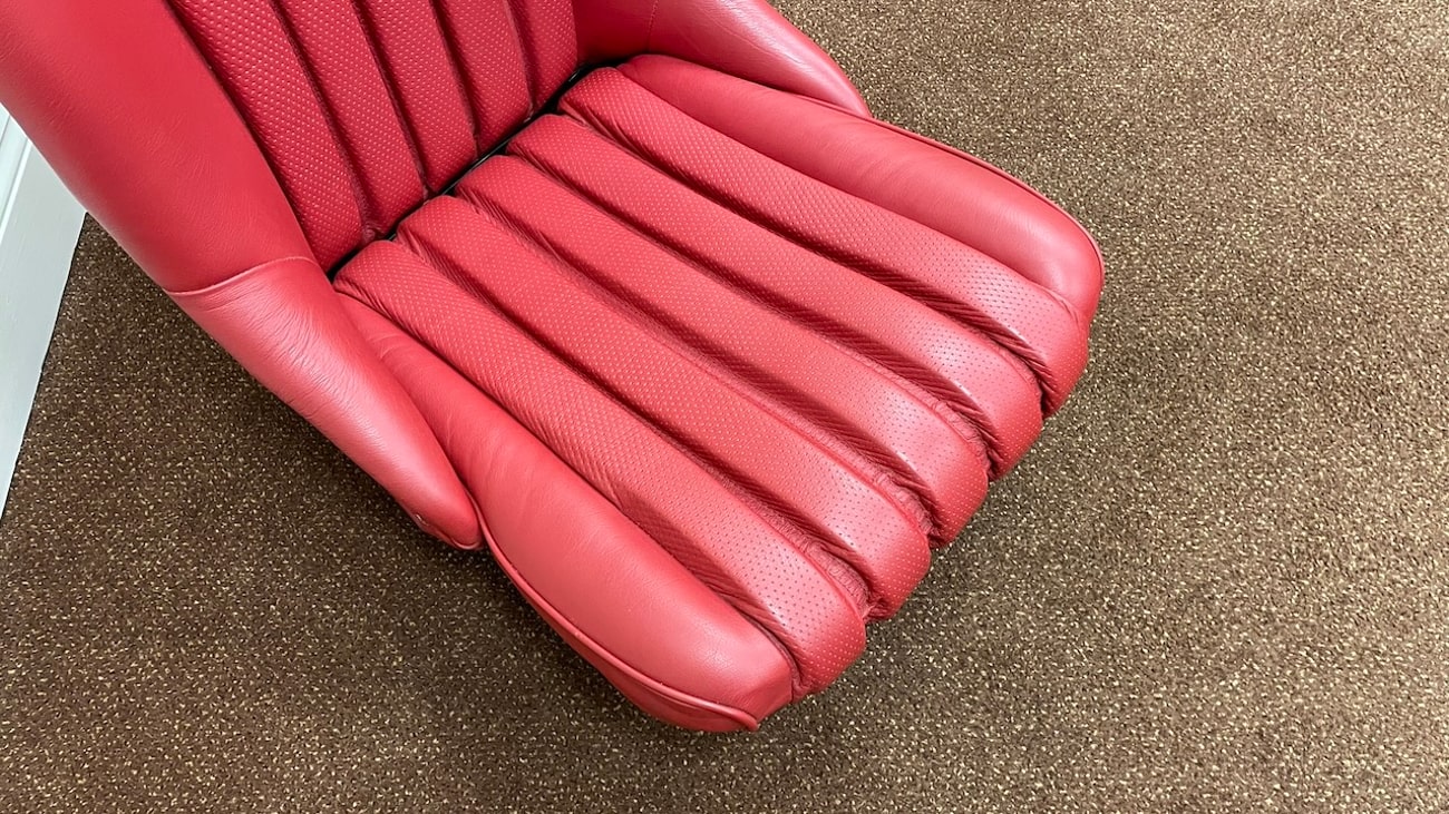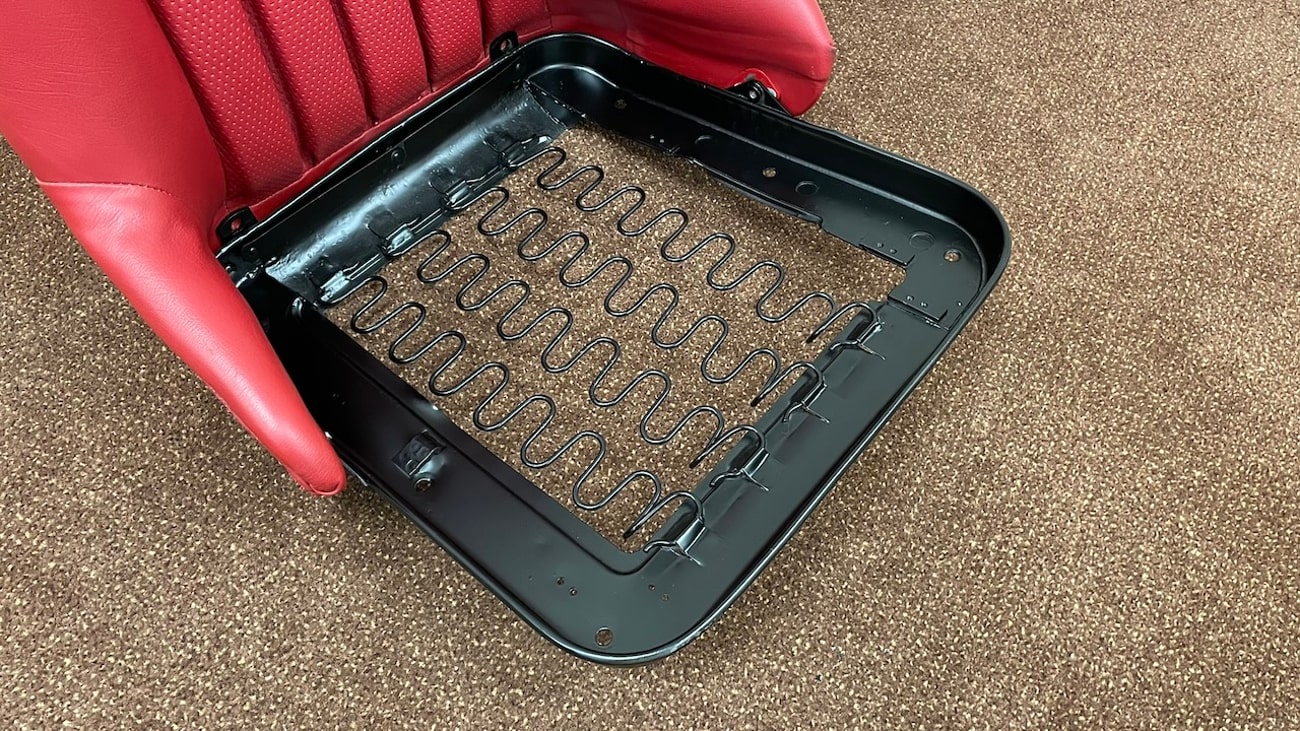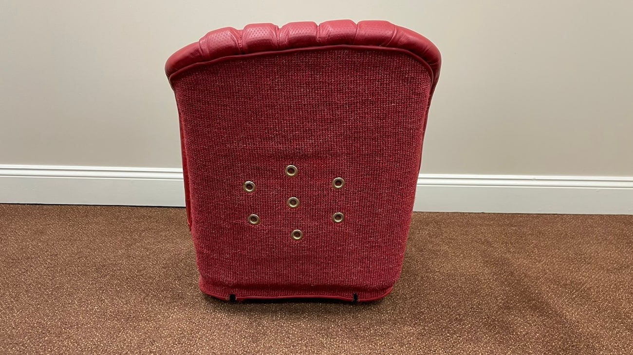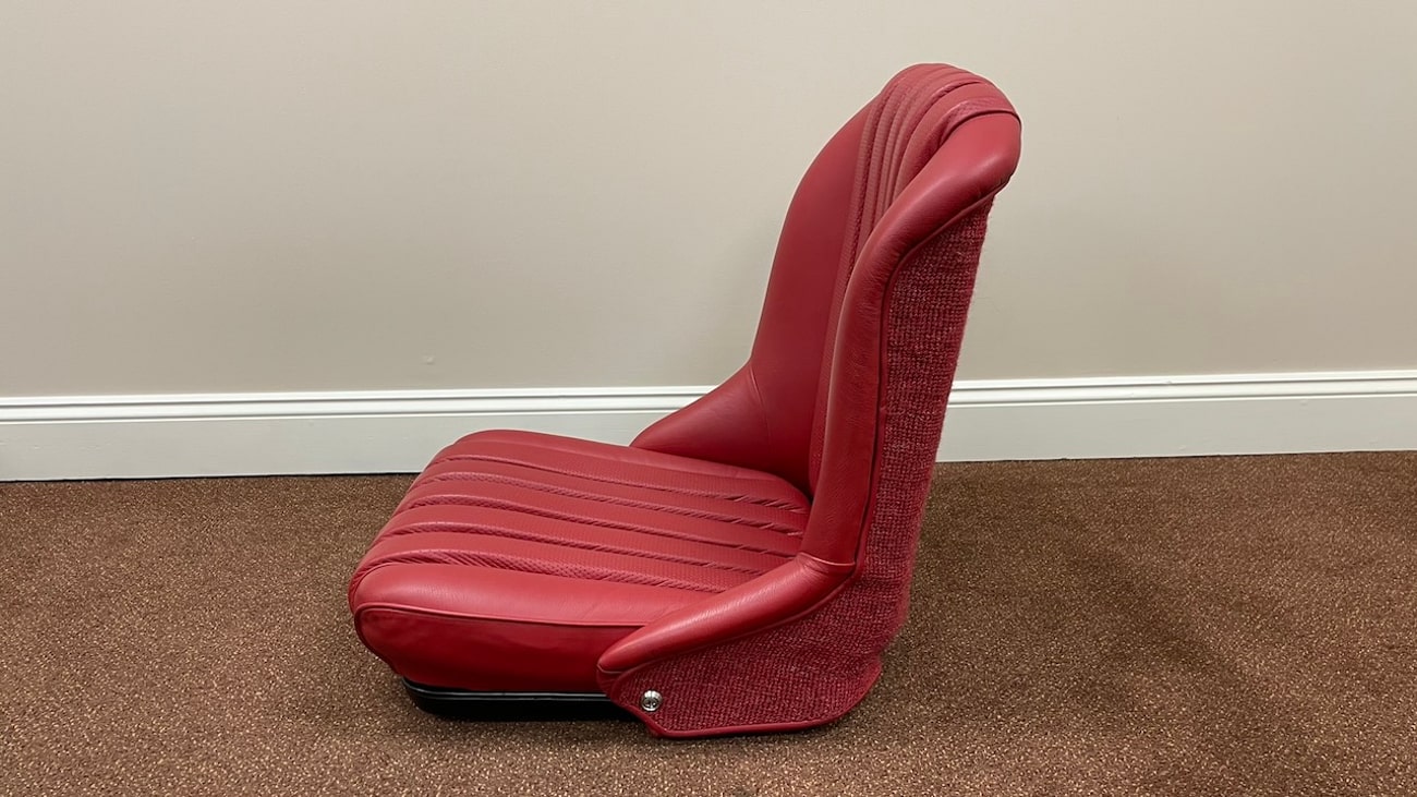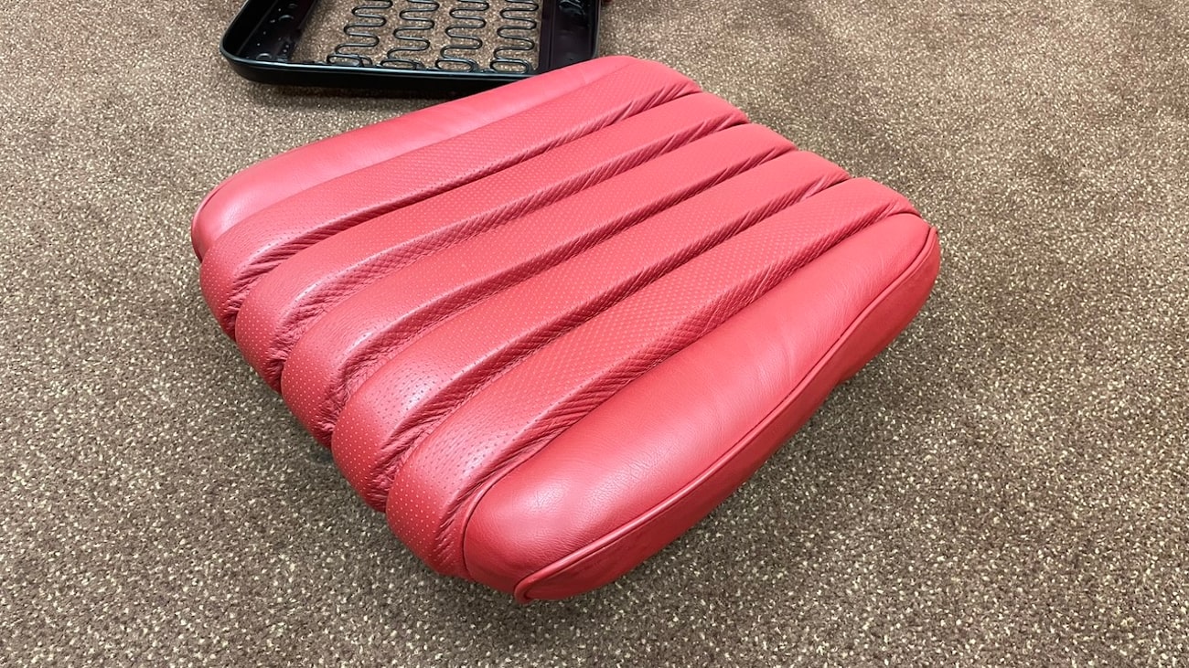 Loop cloth seat backings in Red were also applied to the rear of the seat back with new rovers around the ventilation holes. The natural fibers that acted as cushions for the original seats were replaced with a black synthetic blend that will not crumble and degrade over time. New buttons, rivets, bolts, and washers can be seen throughout. A small scratch in the leather is noted on the side of one of the seat backings.