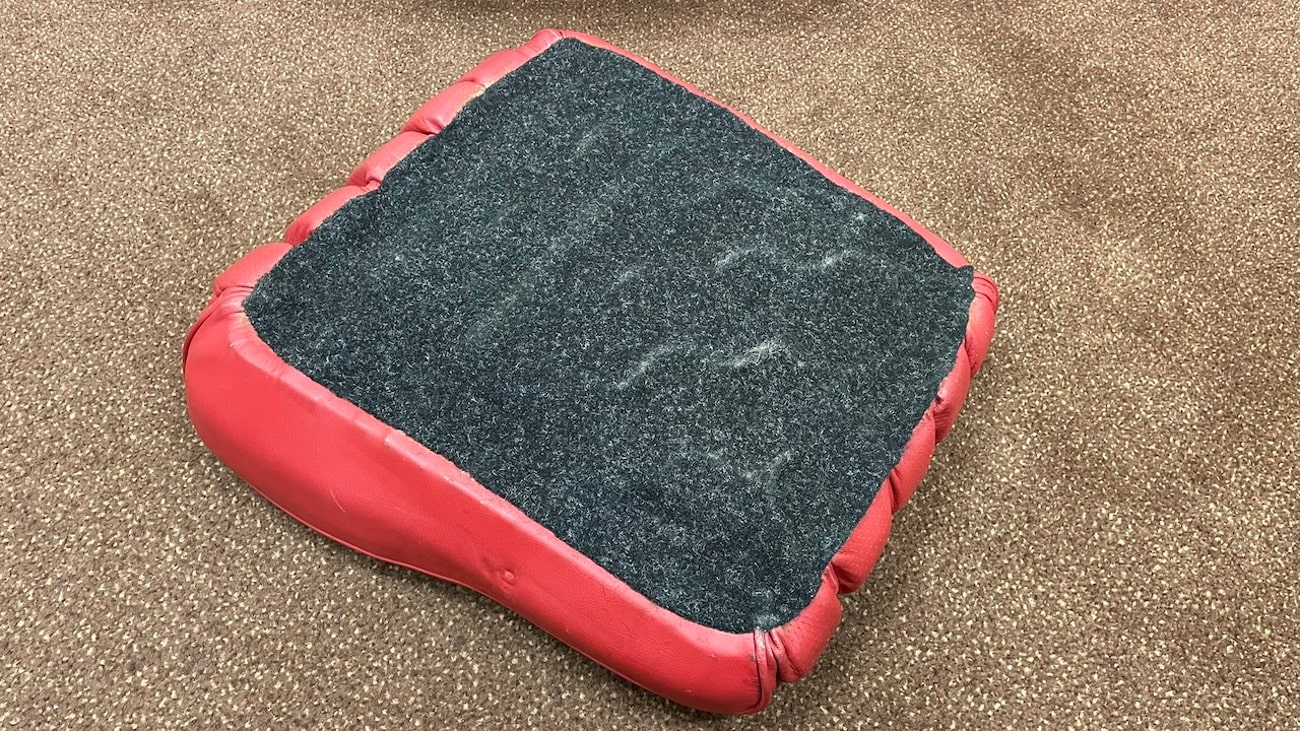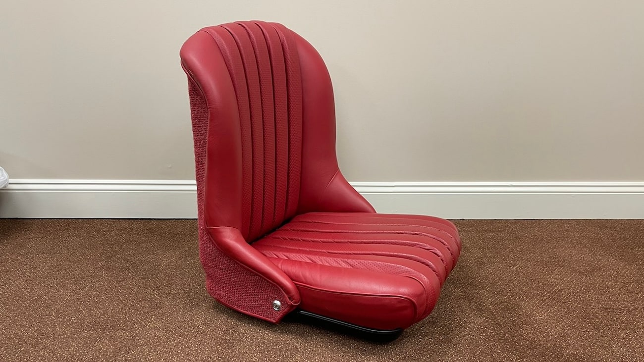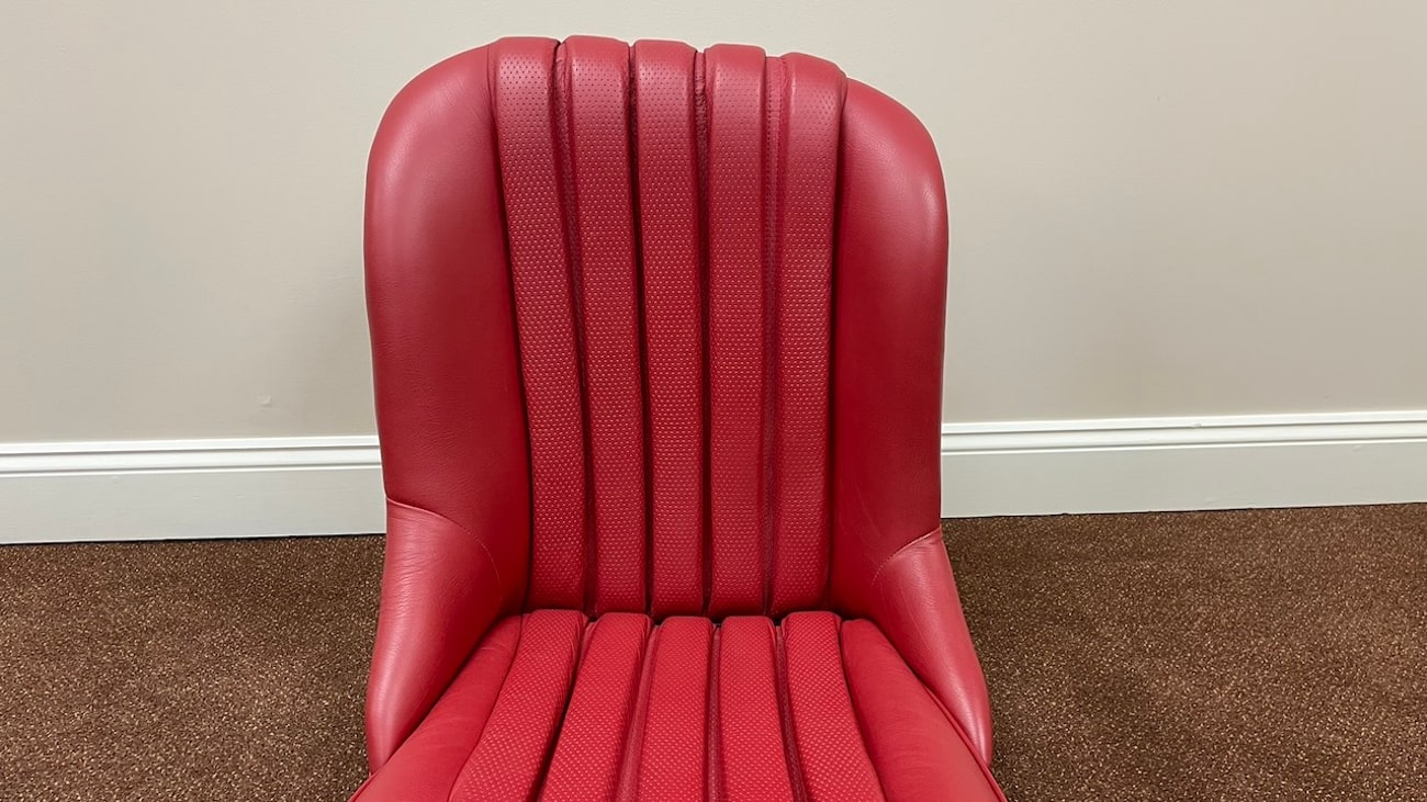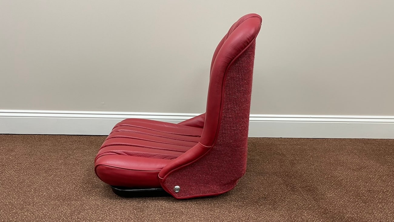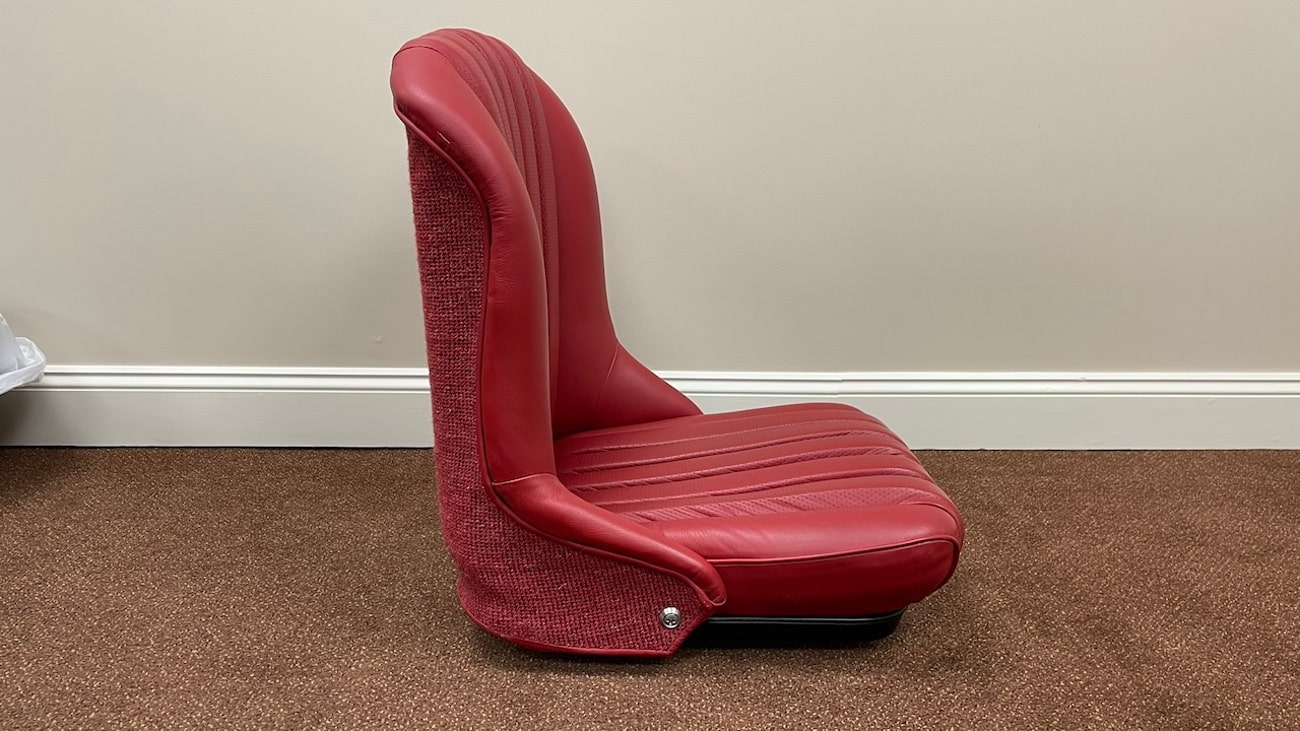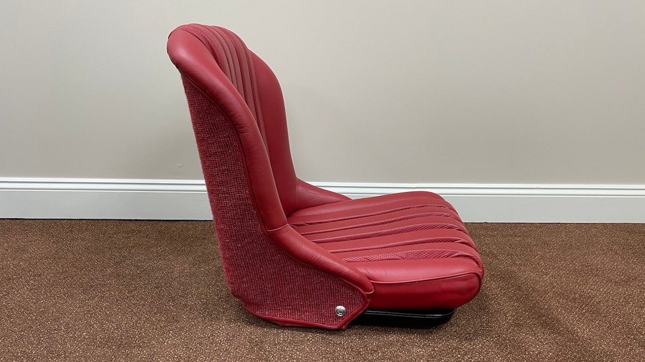 Loop cloth seat backings in Red were also applied to the rear of the seat back with new rovers around the ventilation holes. The natural fibers that acted as cushions for the original seats were replaced with a black synthetic blend that will not crumble and degrade over time. New buttons, rivets, bolts, and washers can be seen throughout. A small scratch in the leather is noted on the side of one of the seat backings.