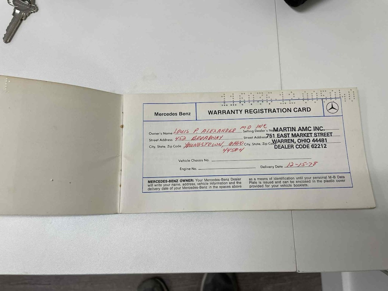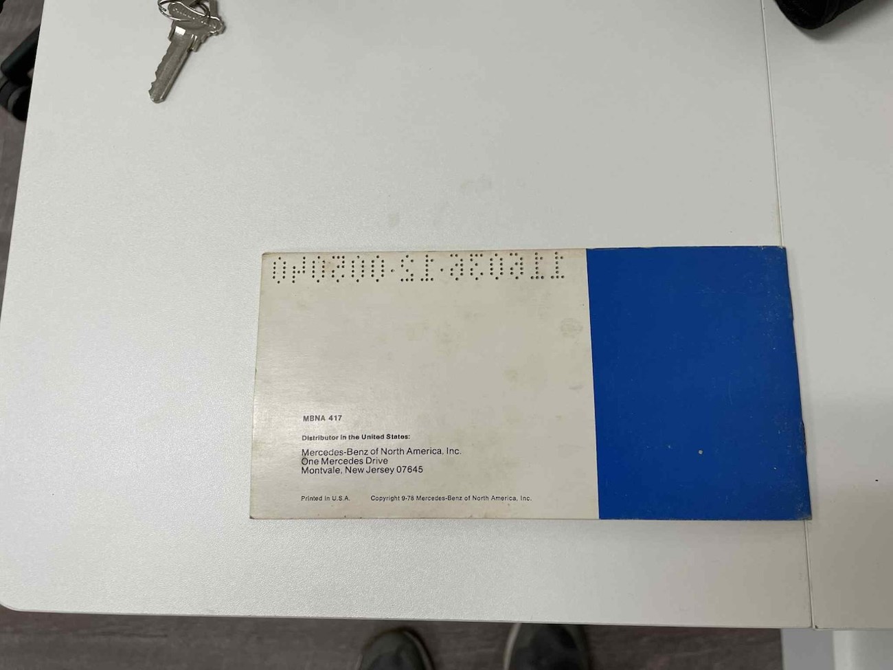 The interior is trimmed in Blue Leather (232) with blue carpets and blue plastics along the interior pillars, dashboard, and center console. The ivory perforated headliner shows in excellent condition without tears or stains typical in W116s. The blue carpets show virtually no UV damage and the dashboard does not exhibit any cracks. Burl Walnut was standard on the 6.9 and is seen on the dashboard and center console along with a shifter knob. Two small hairline cracks are shown around the climate control panel. GAHH reupholstered front seats and arm rest were done by the previous owner while the rear seats remain in good original condition. The long wheelbase W116 provides 4” of additional rear leg room and offers working reading lights integrated into the C-pillar. ACC II climate control blows cold air, a Bluetooth-capable Pyle head unit provides audio, the retractable antenna has been rebuilt by the current owner, and the cruise control amplifier was sent out for service and now functions. Custom made Black & Blue Coco-mats were installed by the current owner. The front passenger window is inoperative.