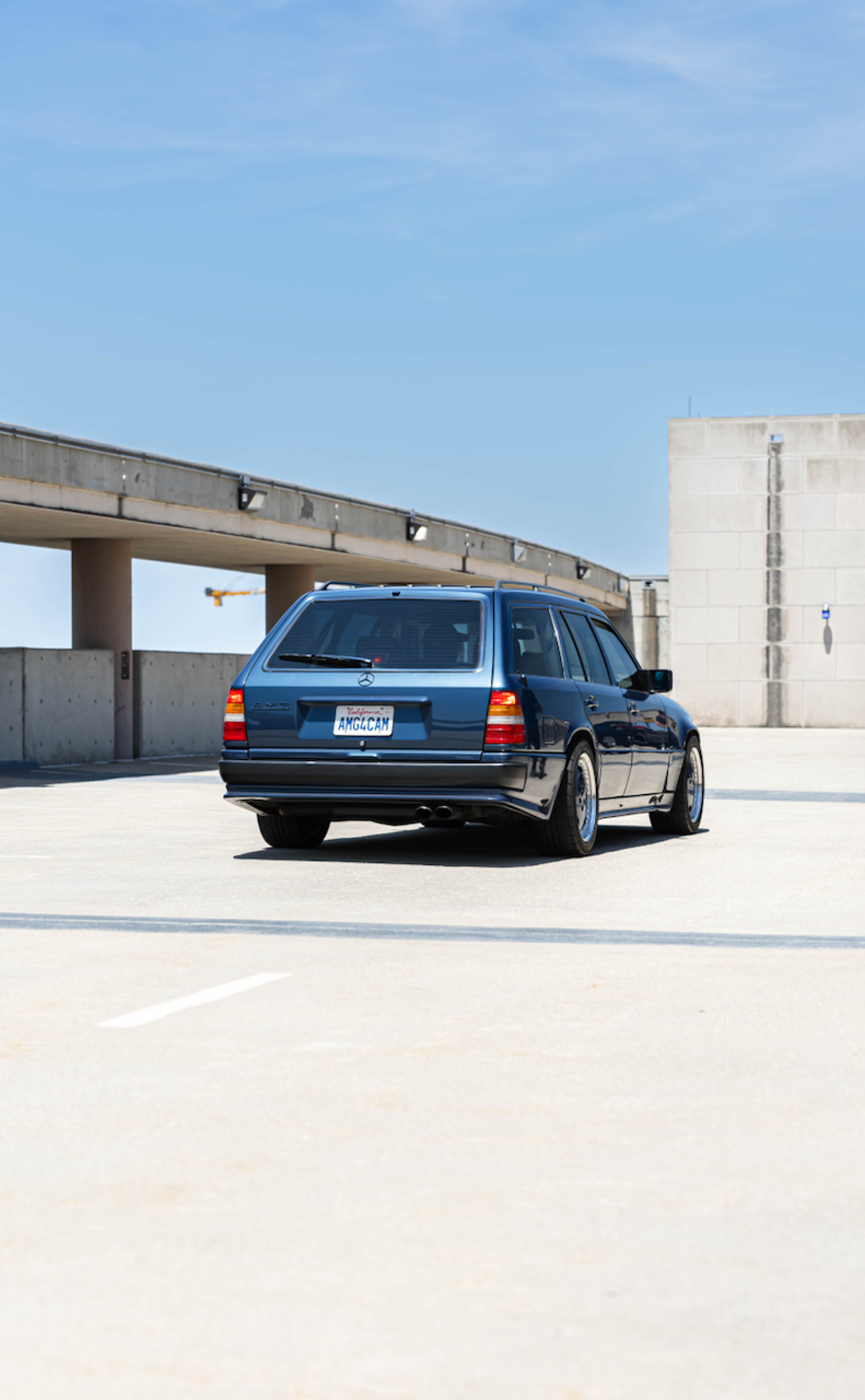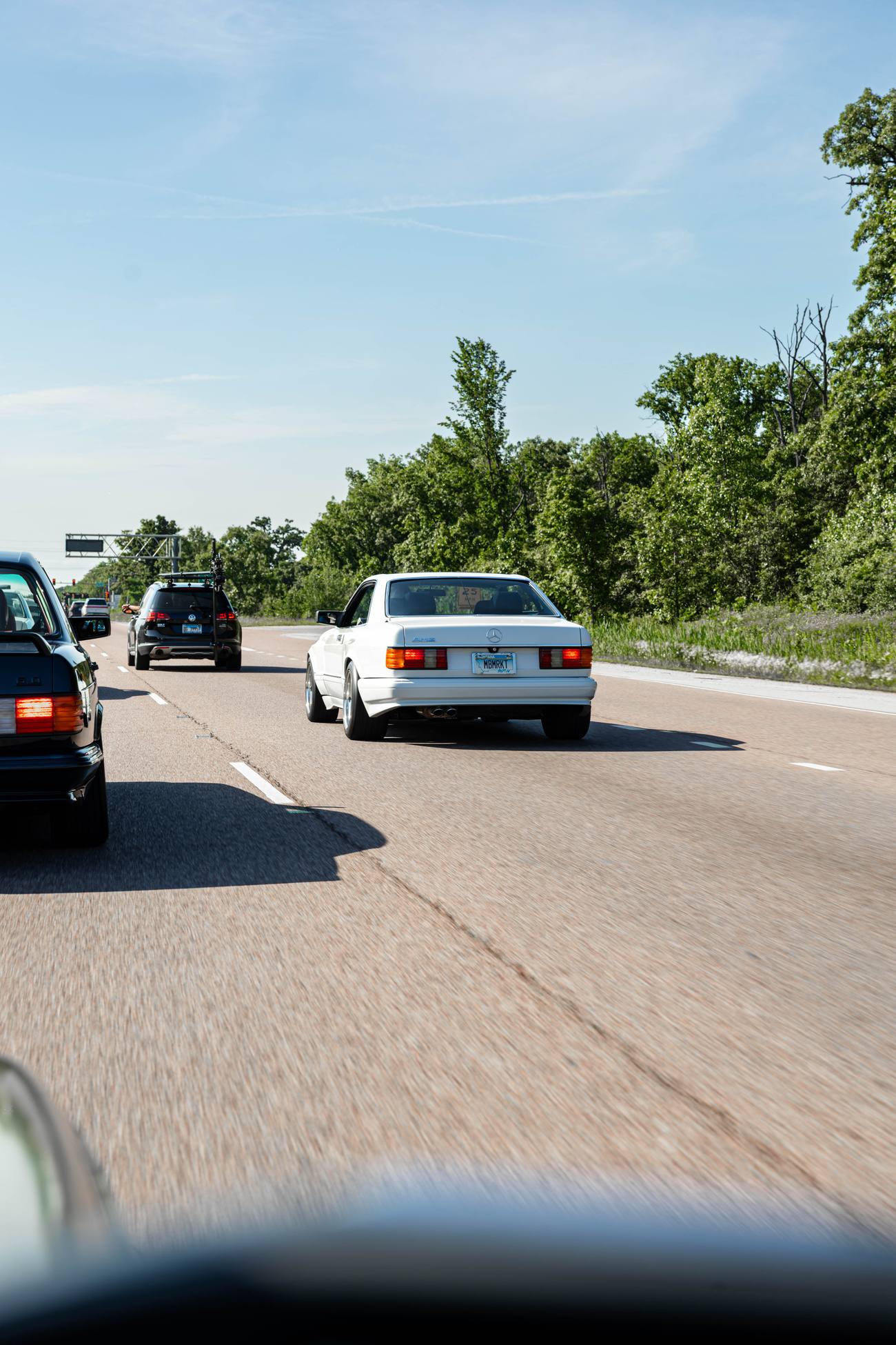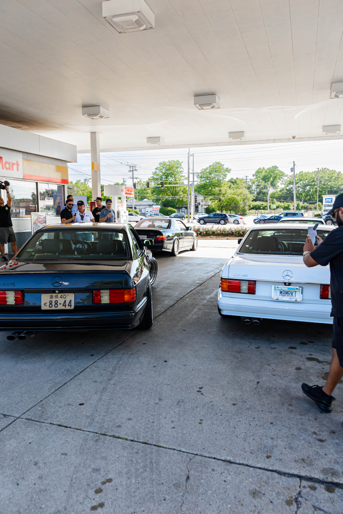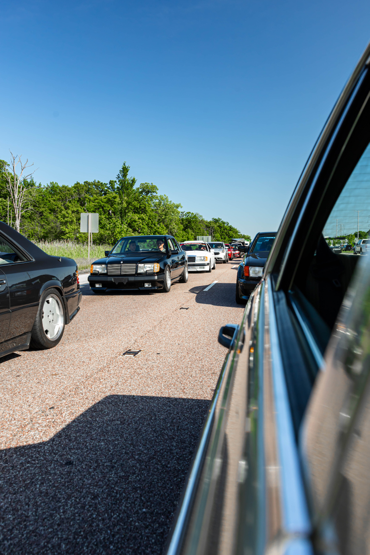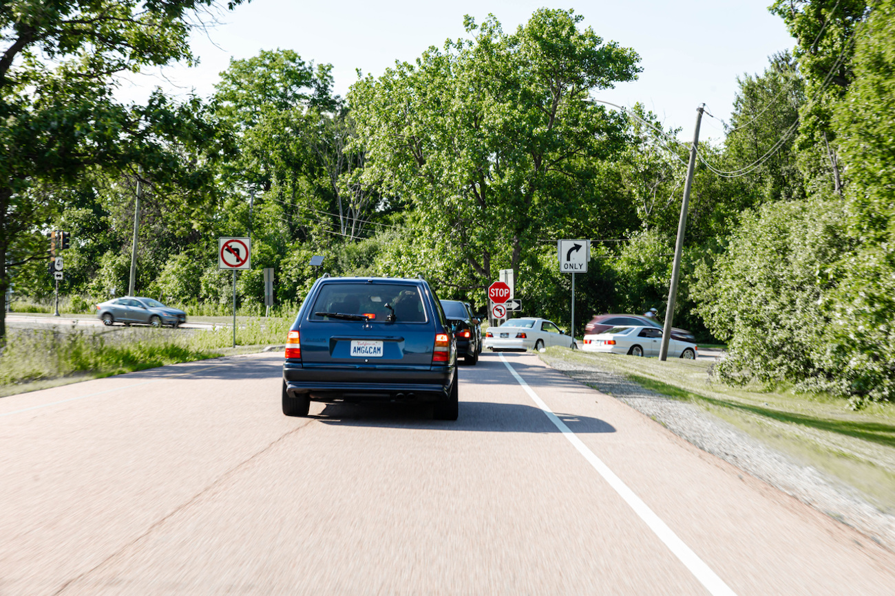 Sometimes circumstance trumps etiquette. All of the cars rolled out of the parking garage in the late afternoon for some rolling shots. About a dozen pre-merger AMGs took to the highway and mobbed through traffic. I sat in Blakley’s 560SEC AMG Widebody and attempted to capture the frenetic moment. Hodgman’s Hammer wagon was about 50 meters behind us when I saw the front end lift like a power boat. The intake noise is unlike anything I’ve ever heard. At WOT, it hurtled towards us like a blue NASA Space Shuttle with a noise that sounded like a swarm of hornets traveling through a wrapping paper tube until it passed us carrying a baritone womp as white exhaust gasses angrily exited his exhaust and spat kicked up tarmac in its wake.