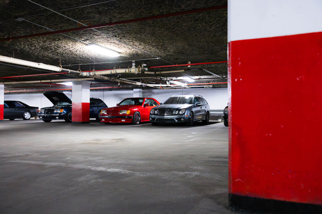 I was standing at the bow of Richard Buxbaum’s personally owned 6.0-liter W126 “Red Baron” – the car poised like a monochrome cardinal warship. Its jutting North American bumpers gave it a houndish underbite and added to its stretching length compared to the brutish W124 Hammers flanking it.