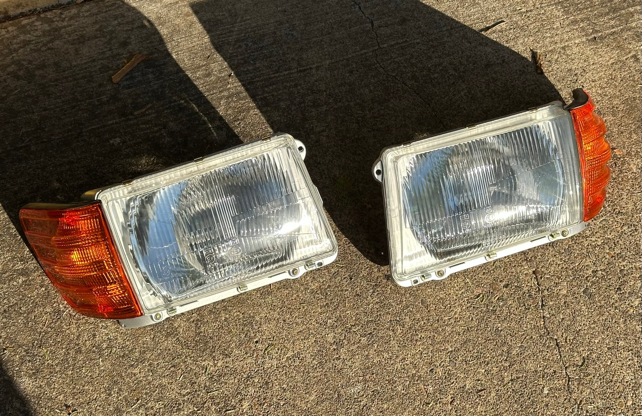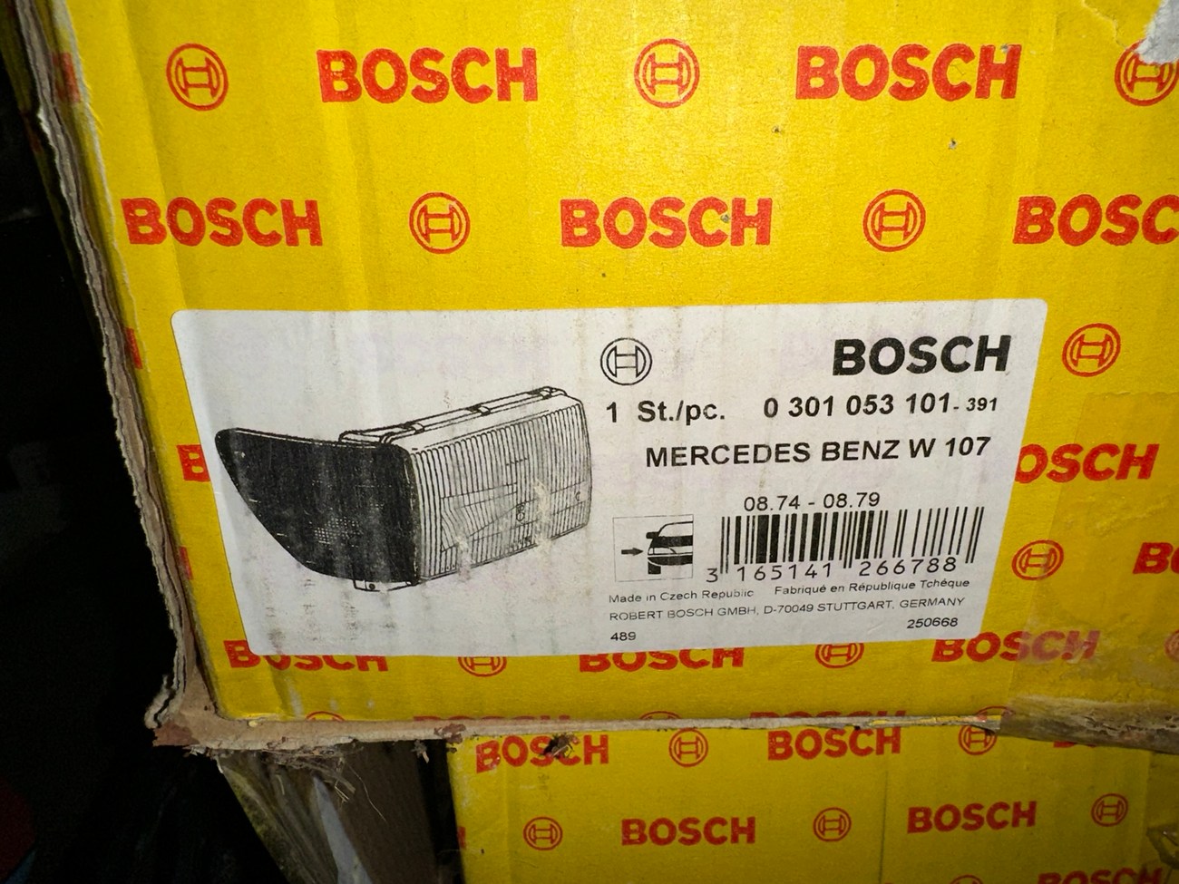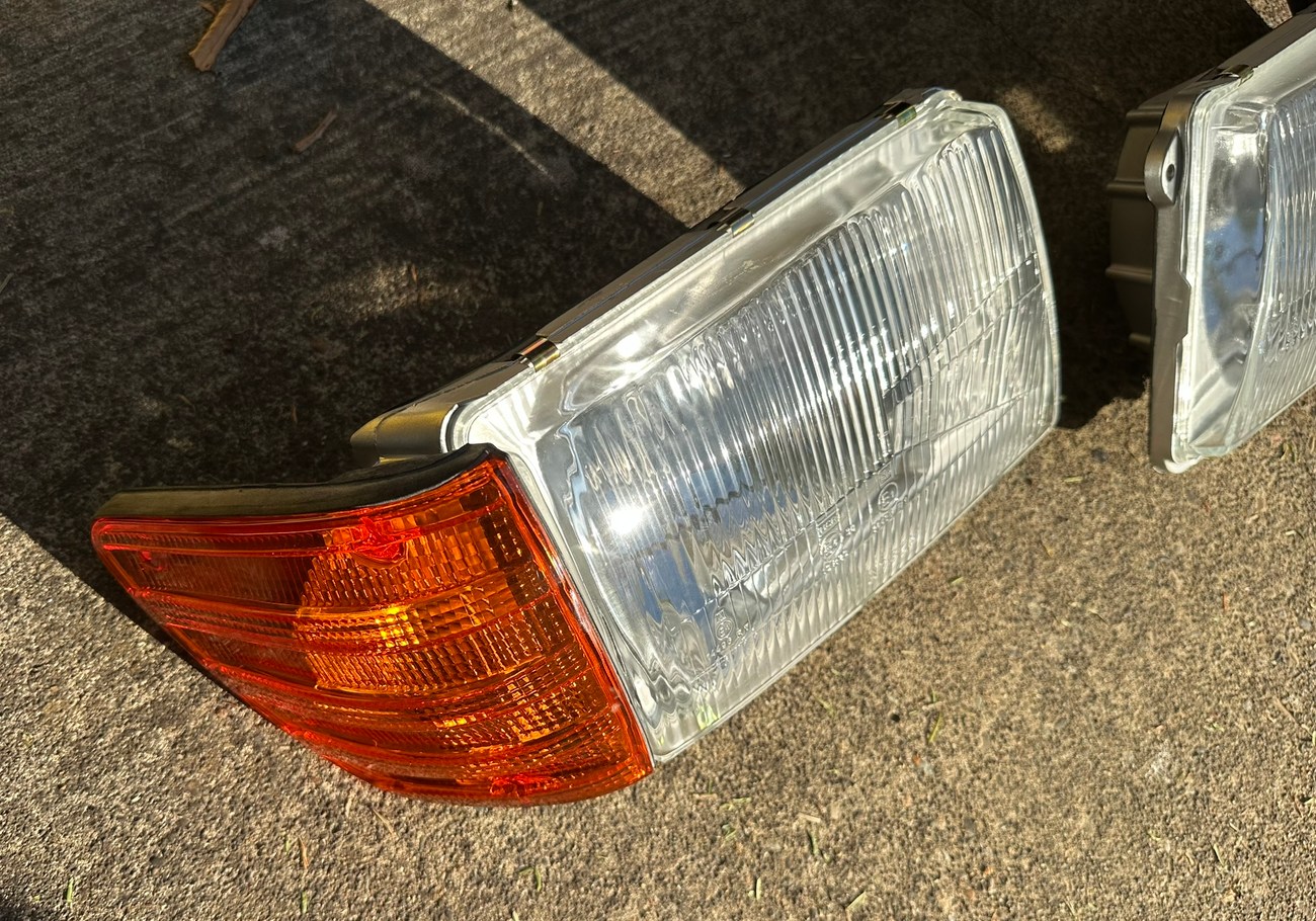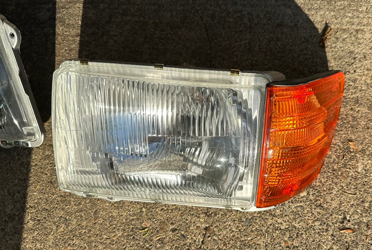 The original Bosch boxes are included in the sale. The smooth glass lenses feature Bosch logos and the plastic housing is free from any cracks. Factory part numbers for the headlights are present reading 1305620-113 and 1305620-114. The OEM yellow sticker on the back of each headlight housing is present. The European corner lights feature a dark amber color and show Germany stamped on each lens.