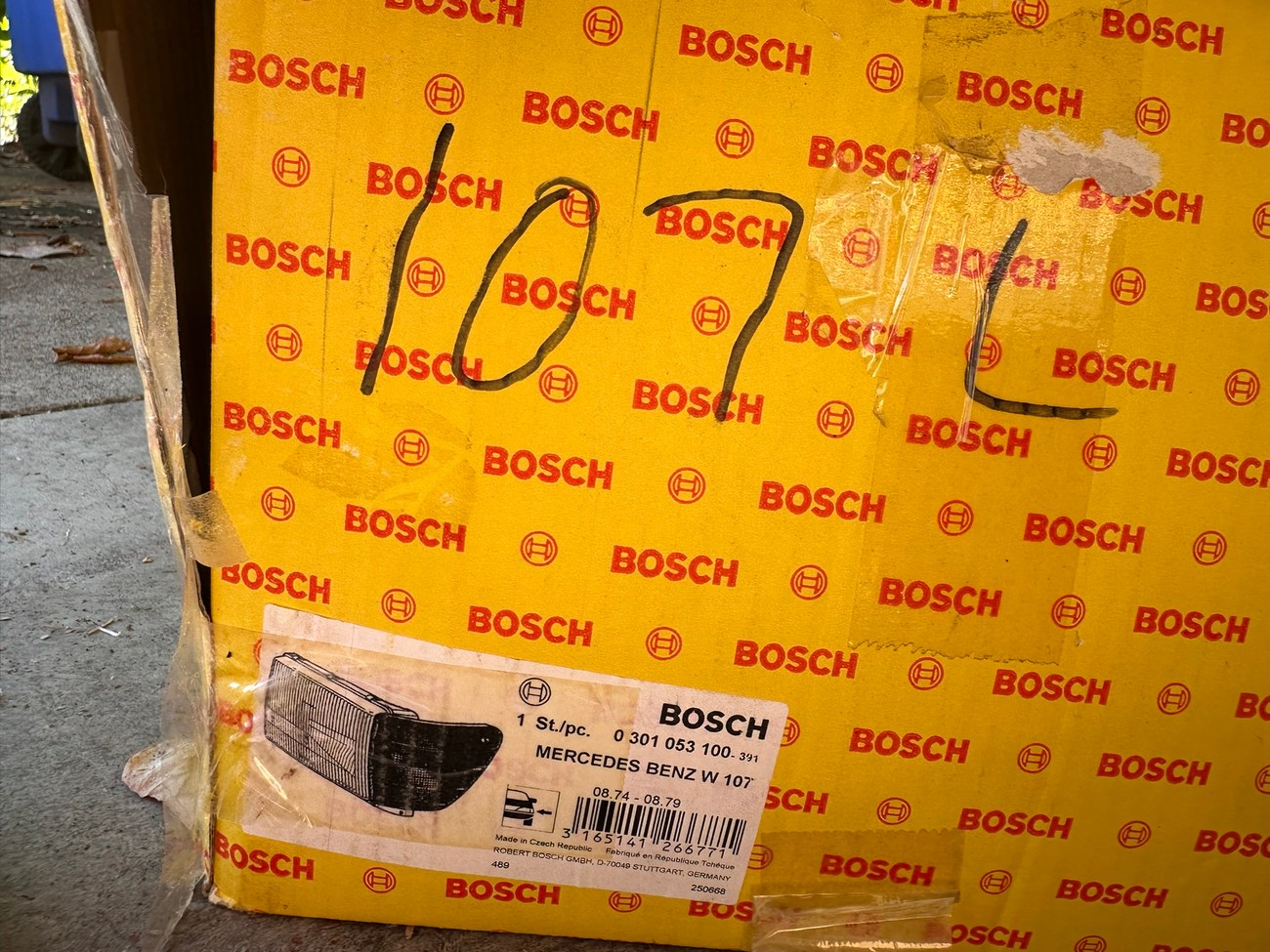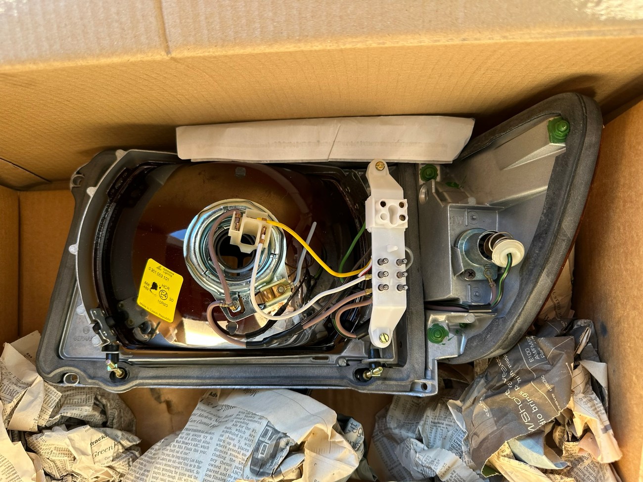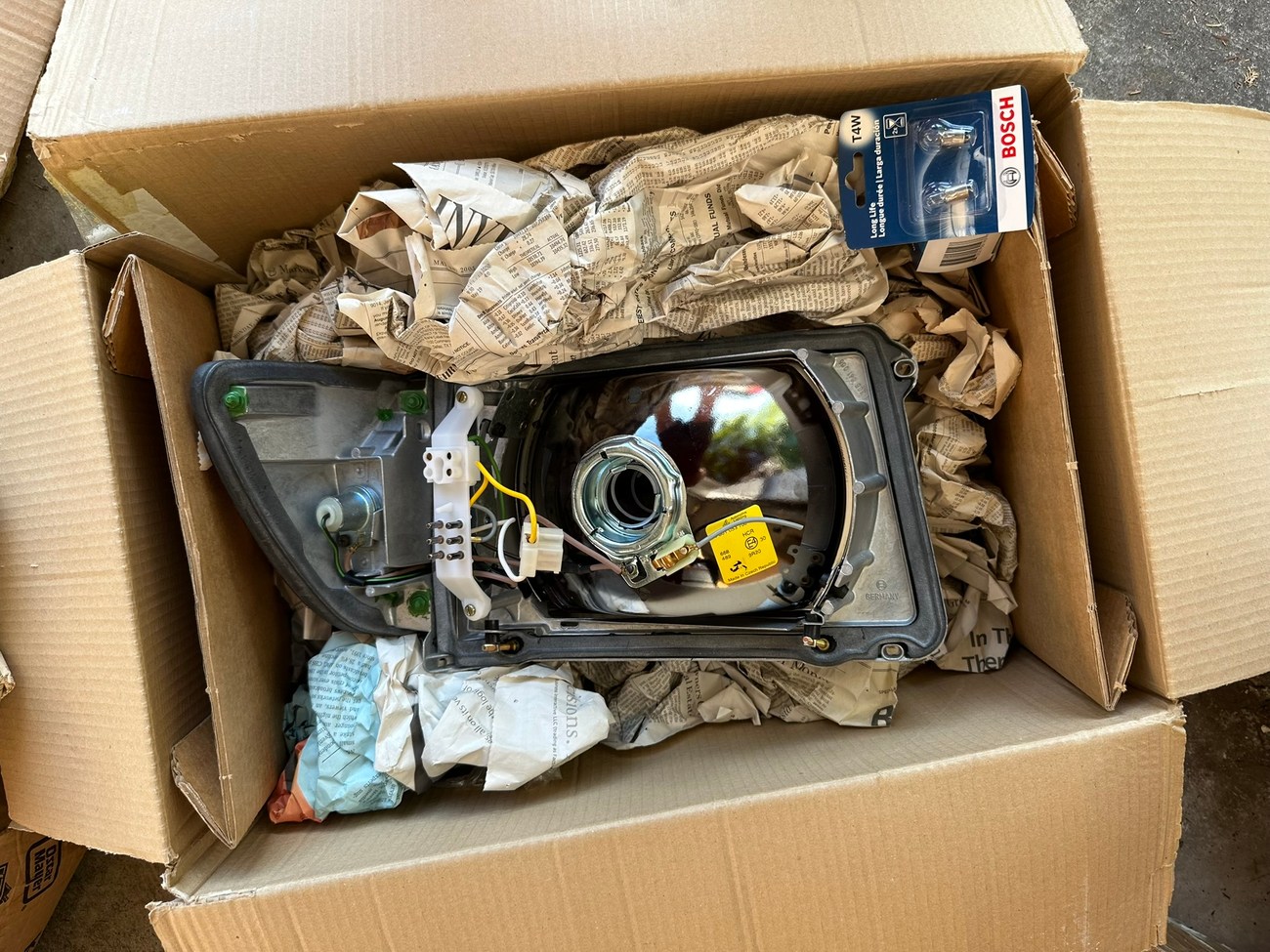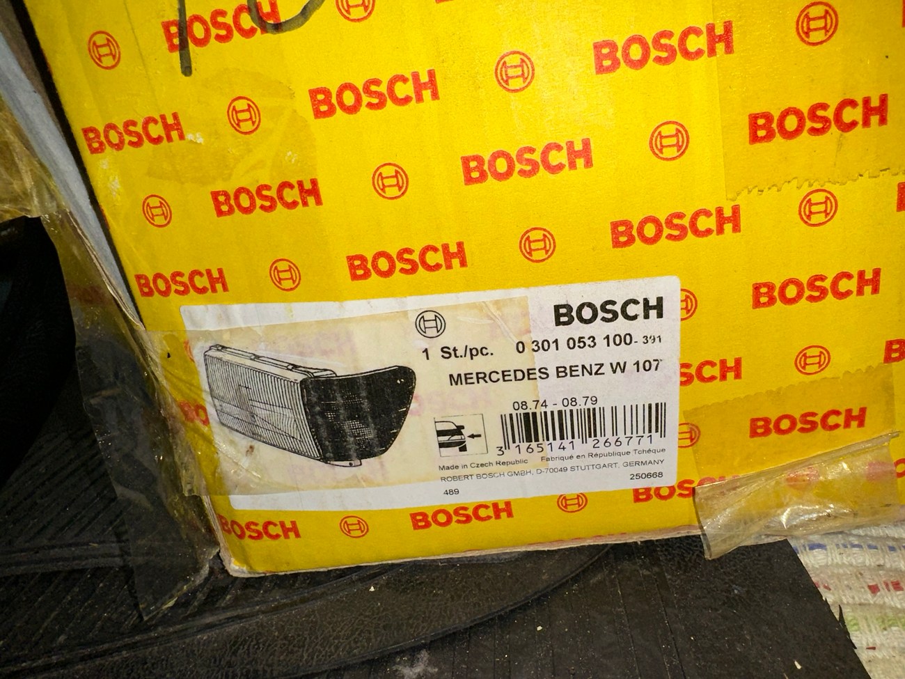 The original Bosch boxes are included in the sale. The smooth glass lenses feature Bosch logos and the plastic housing is free from any cracks. Factory part numbers for the headlights are present reading 1305620-113 and 1305620-114. The OEM yellow sticker on the back of each headlight housing is present. The European corner lights feature a dark amber color and show Germany stamped on each lens.