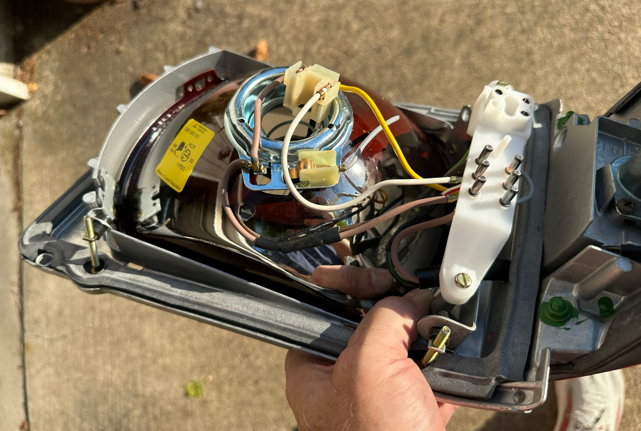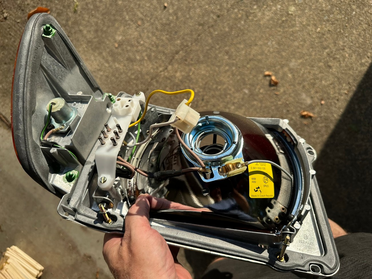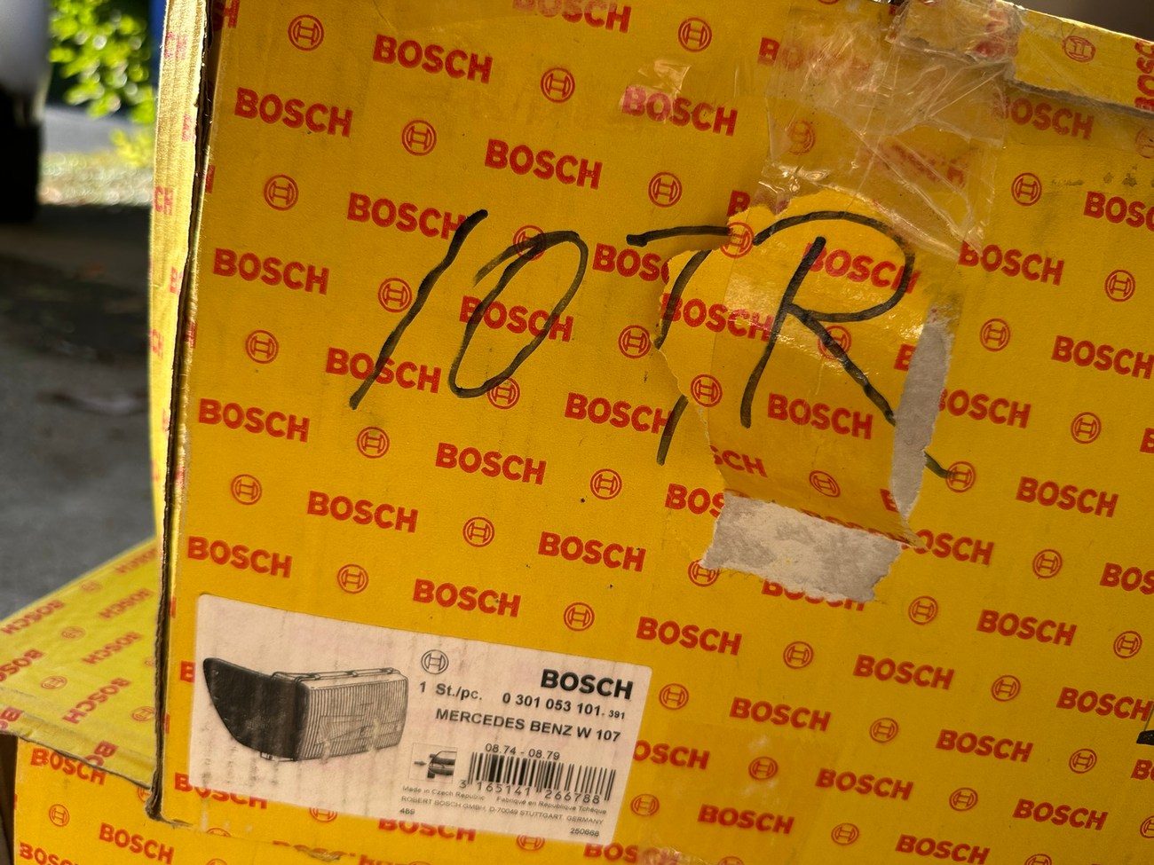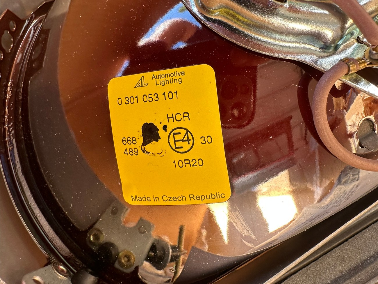 The original Bosch boxes are included in the sale. The smooth glass lenses feature Bosch logos and the plastic housing is free from any cracks. Factory part numbers for the headlights are present reading 1305620-113 and 1305620-114. The OEM yellow sticker on the back of each headlight housing is present. The European corner lights feature a dark amber color and show Germany stamped on each lens.