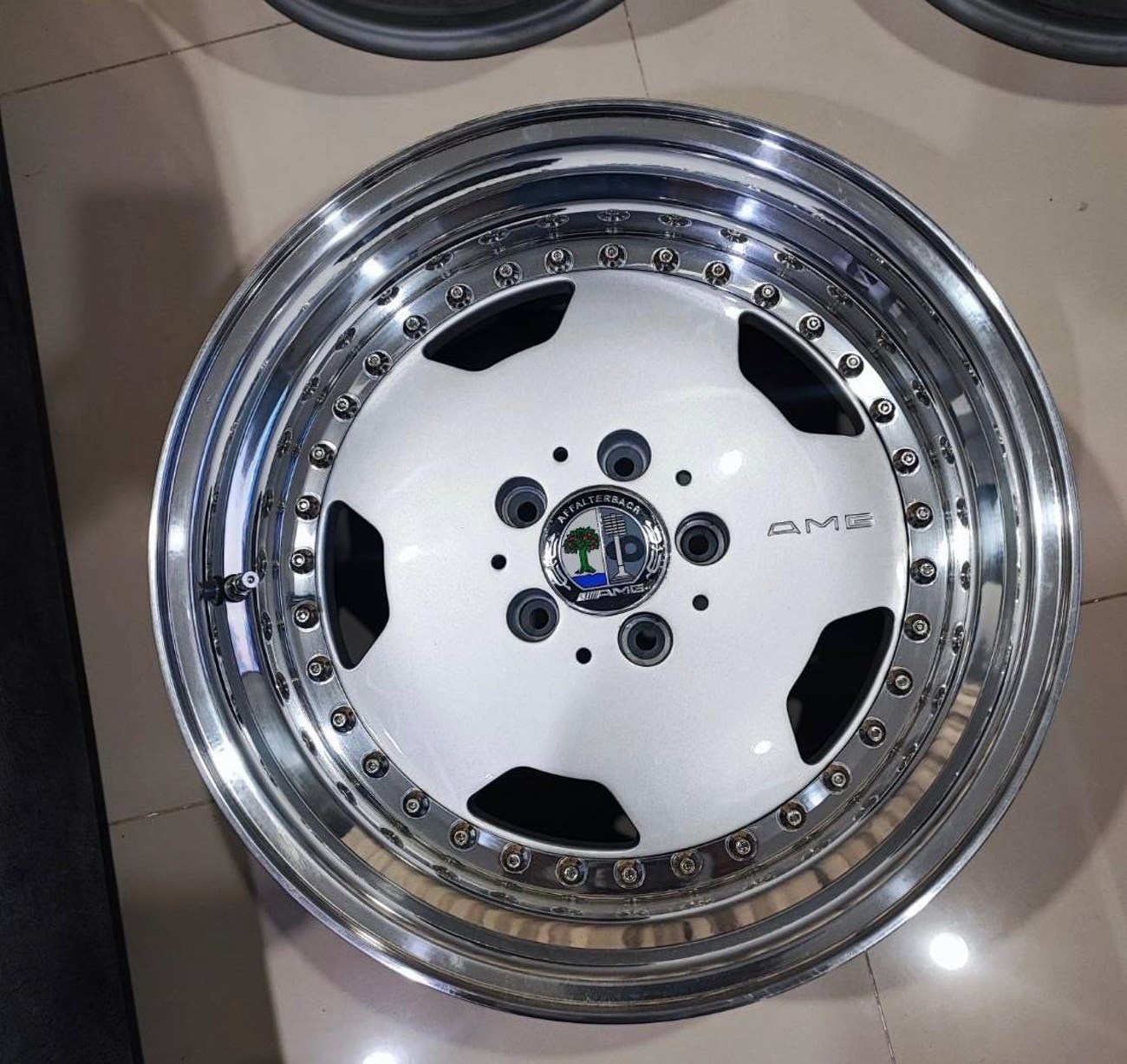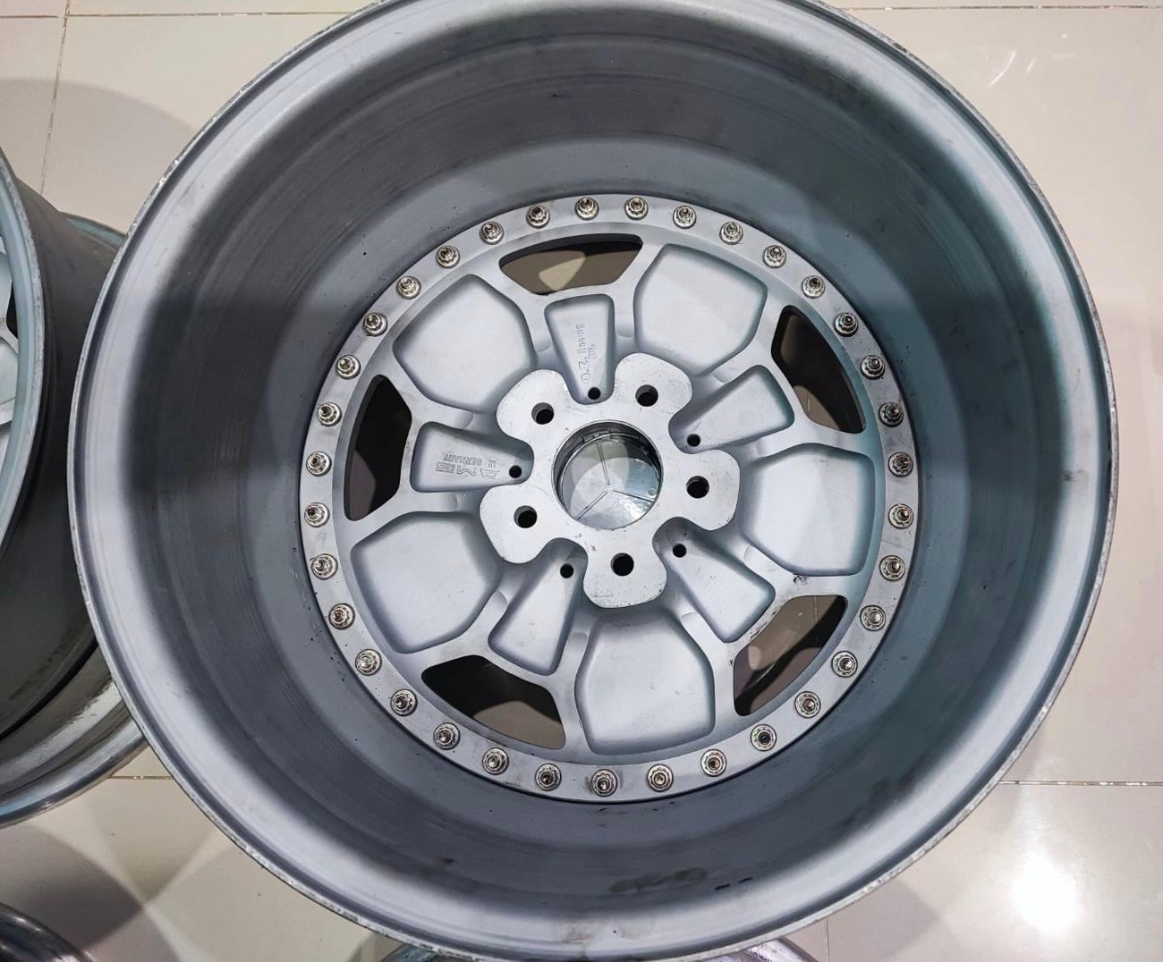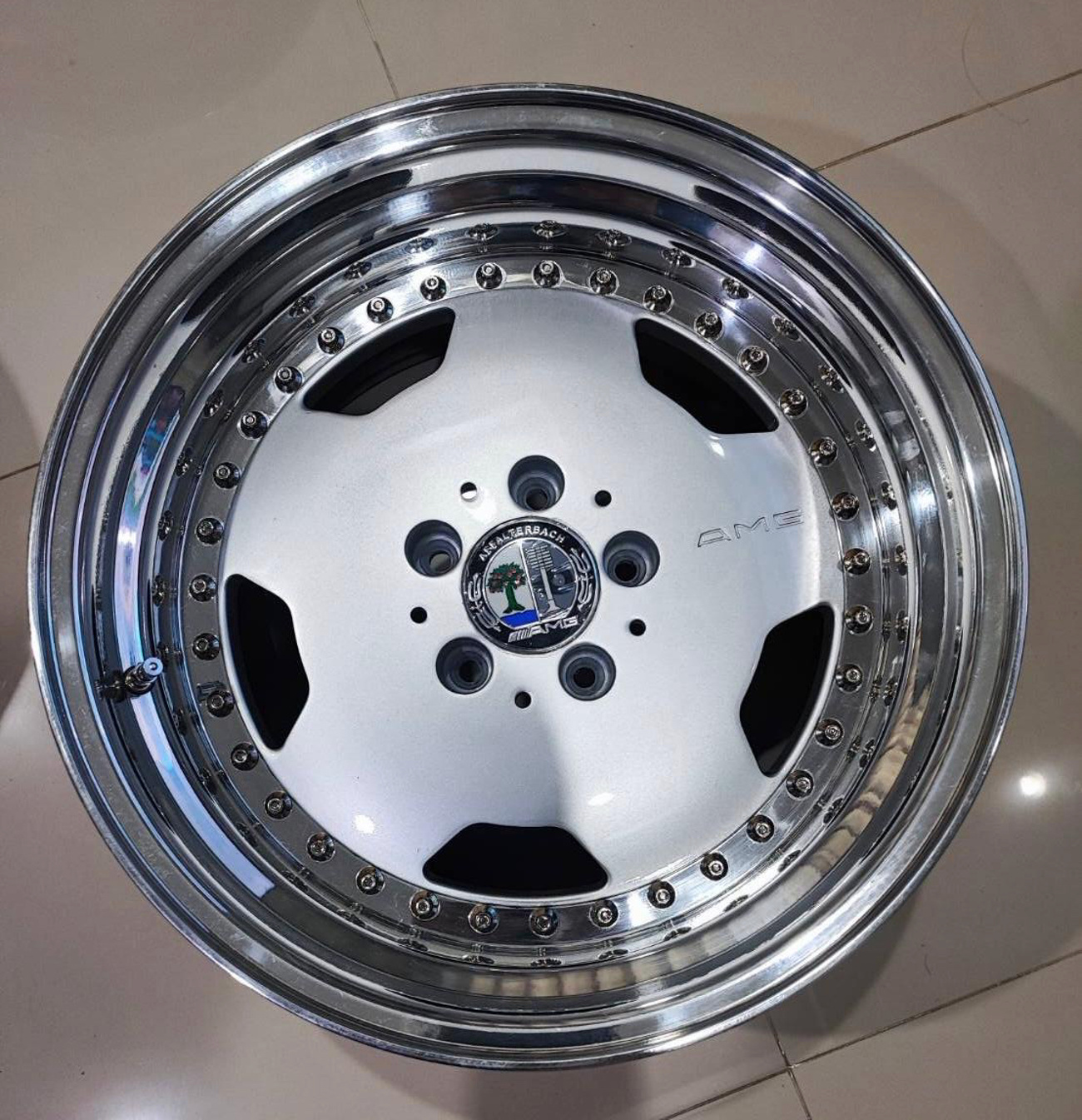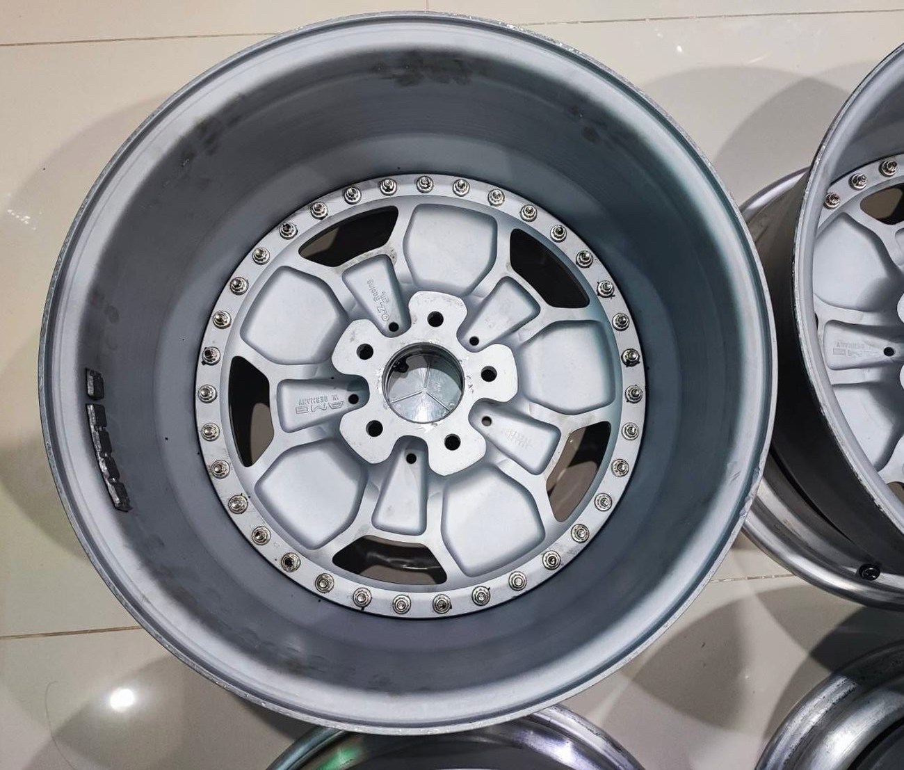 These 3-piece 17" AMG Aero III wheels have been custom fitted with new lips and measure 8.5″ wide on the front and 9.5" wide in the rear. The wheels were originally manufactured by OZ Racing in Germany for use on Mercedes-Benz AMG vehicles. The faces are finished in silver with polished lips and have been professionally refinished when resized. The seller states the updated widths and offsets allow the wheels to fit a wide range of models including the W126, W124, W201, R107, R129, and more. Manufacturer casting marks are present on each wheel and four Mercedes-Benz center caps are included. These custom-sized authentic AMG Aero III wheels are now offered by the seller in Thailand and worldwide shipping is available.