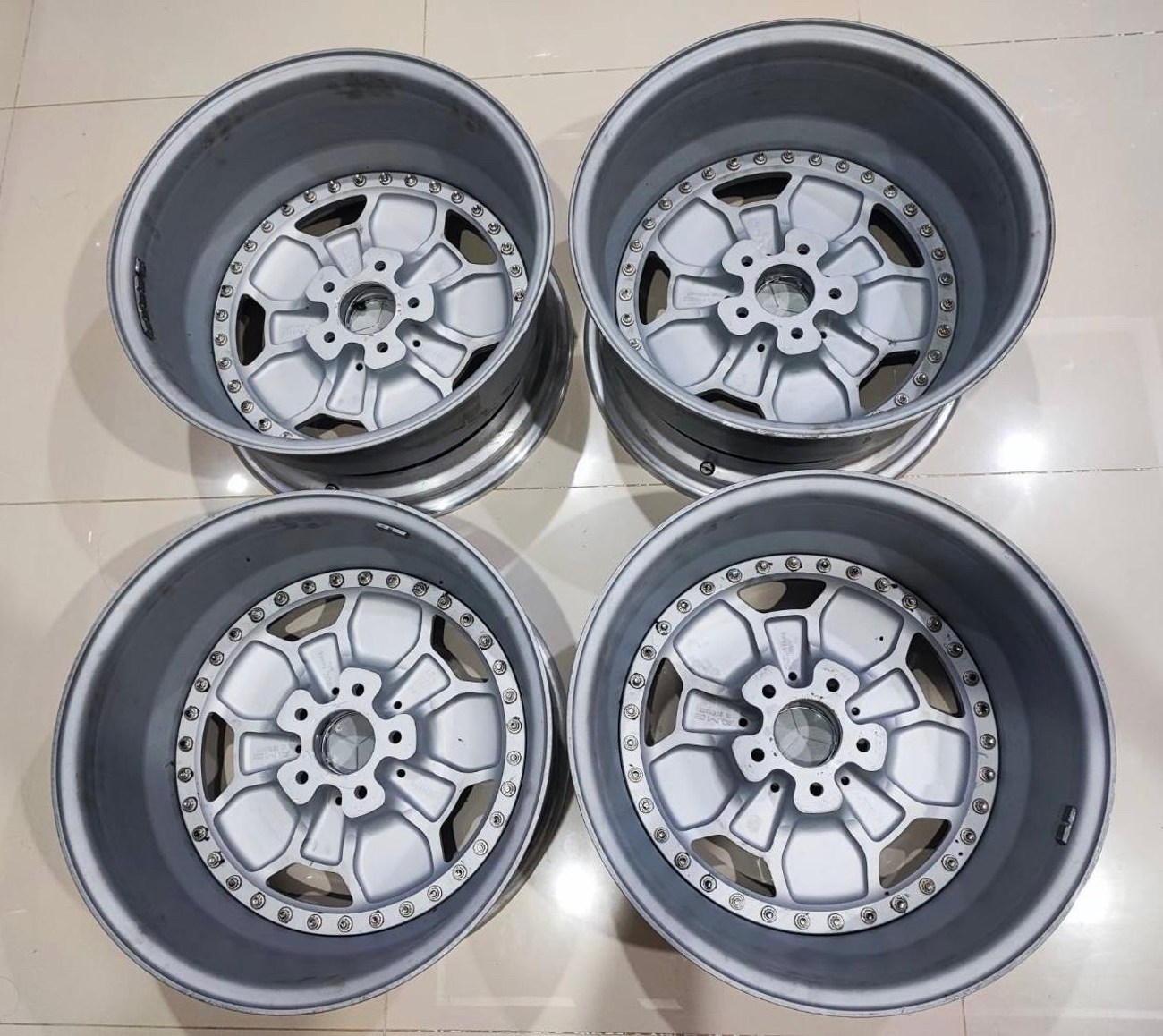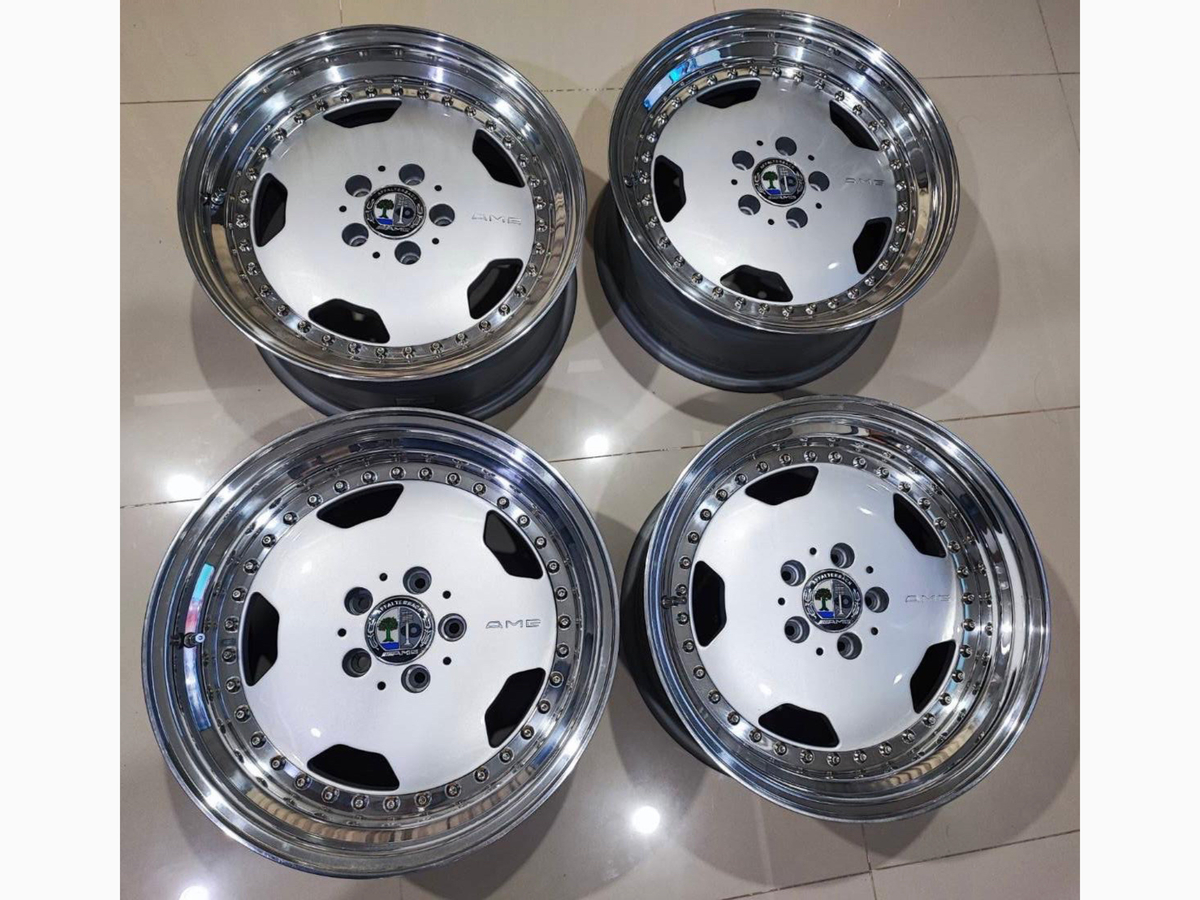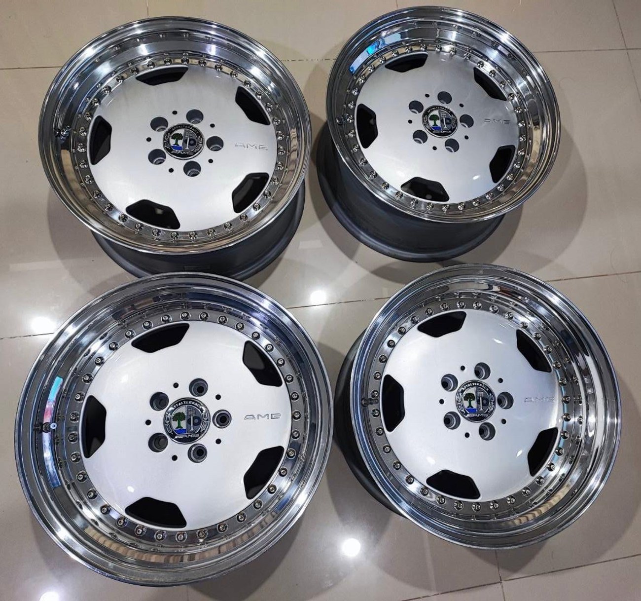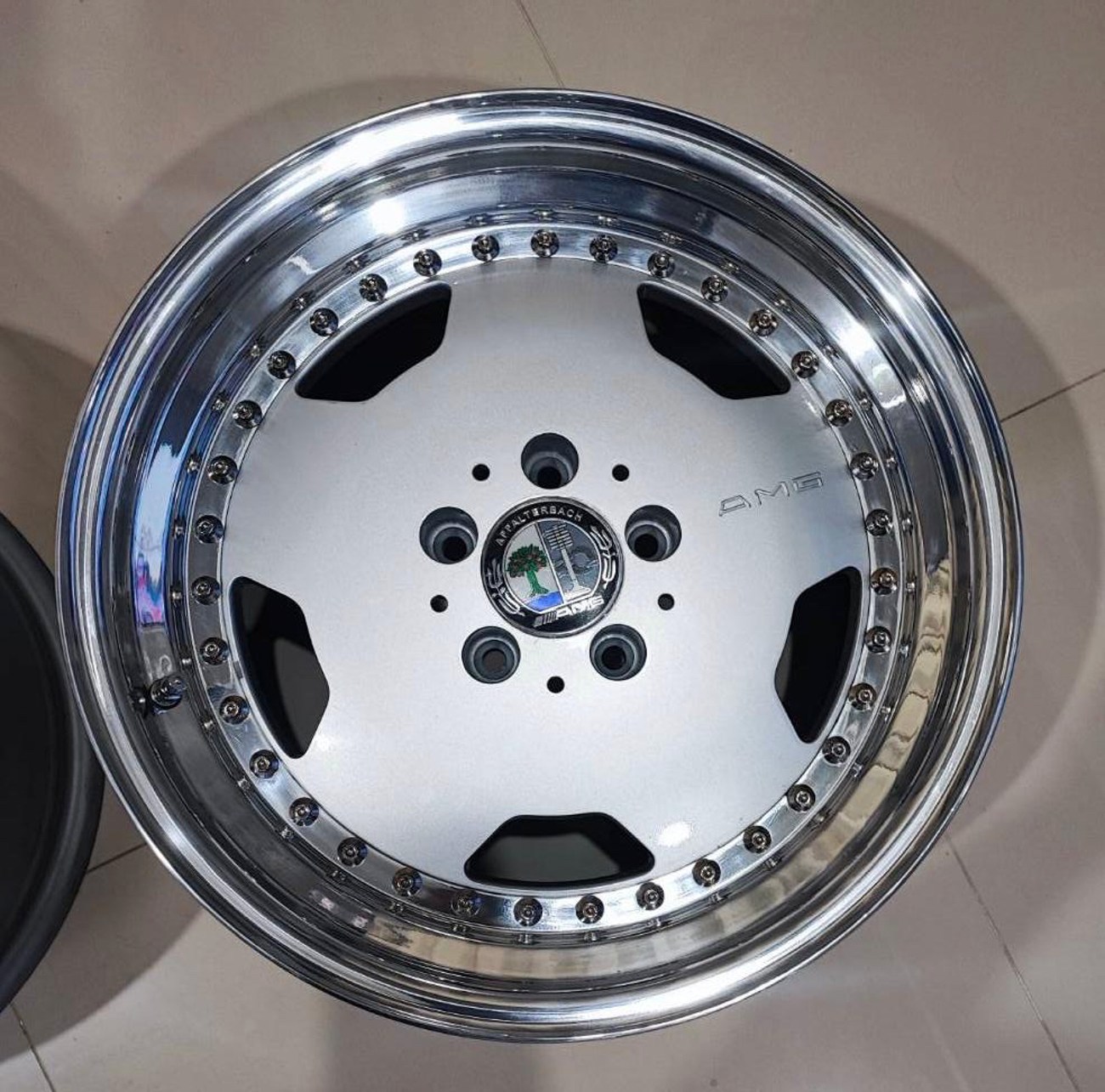 These 3-piece 17" AMG Aero III wheels have been custom fitted with new lips and measure 8.5″ wide on the front and 9.5" wide in the rear. The wheels were originally manufactured by OZ Racing in Germany for use on Mercedes-Benz AMG vehicles. The faces are finished in silver with polished lips and have been professionally refinished when resized. The seller states the updated widths and offsets allow the wheels to fit a wide range of models including the W126, W124, W201, R107, R129, and more. Manufacturer casting marks are present on each wheel and four Mercedes-Benz center caps are included. These custom-sized authentic AMG Aero III wheels are now offered by the seller in Thailand and worldwide shipping is available.
