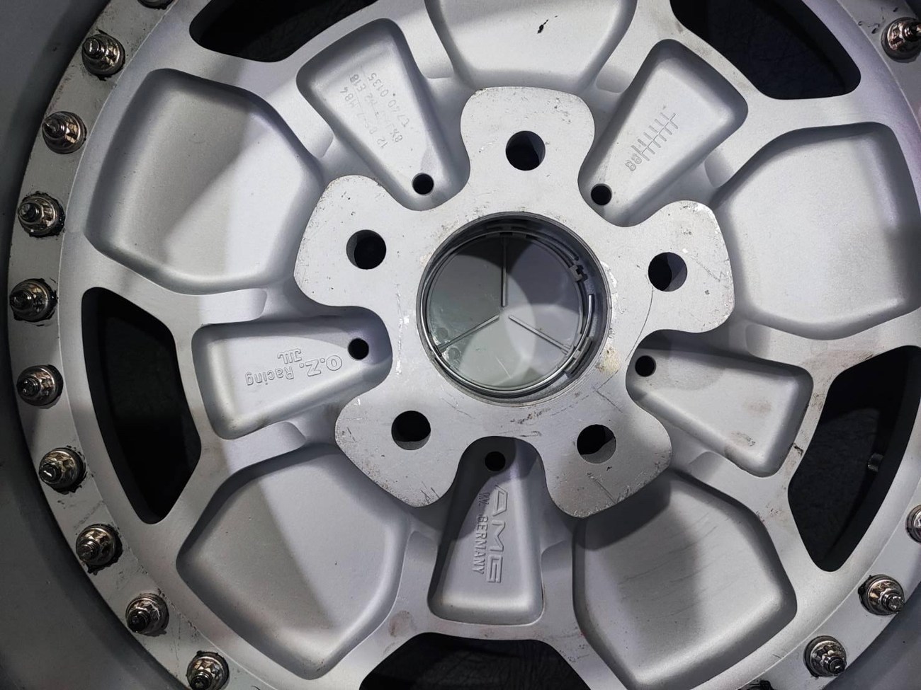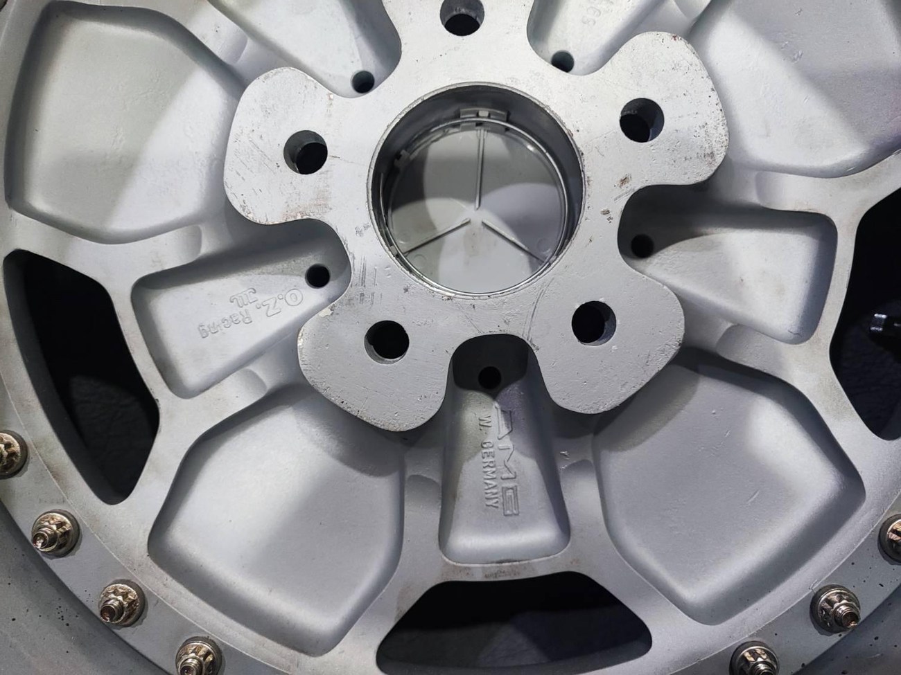 These 5-hole AMG wheels feature a 3-piece design with exposed bolts around the lip. The faces are finished in silver with polished lips. The seller reports there have been no lug hole cracks on any wheel. The wheels feature a 5x112 bolt pattern and 66.67 center bore which is specific to Mercedes-Benz vehicles. Each wheel has been professionally refinished in preparation for the sale.