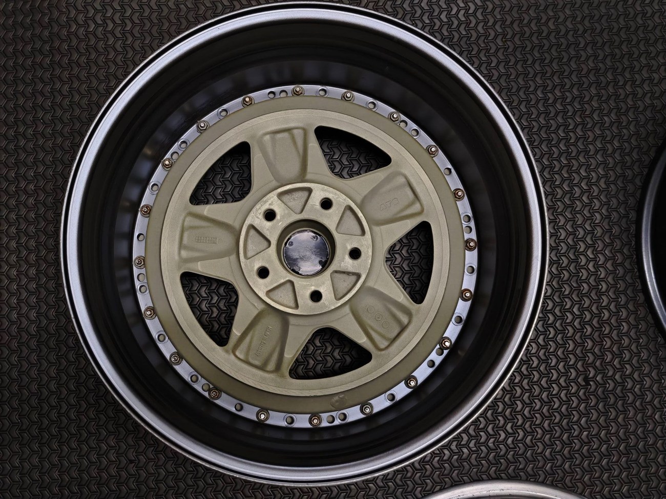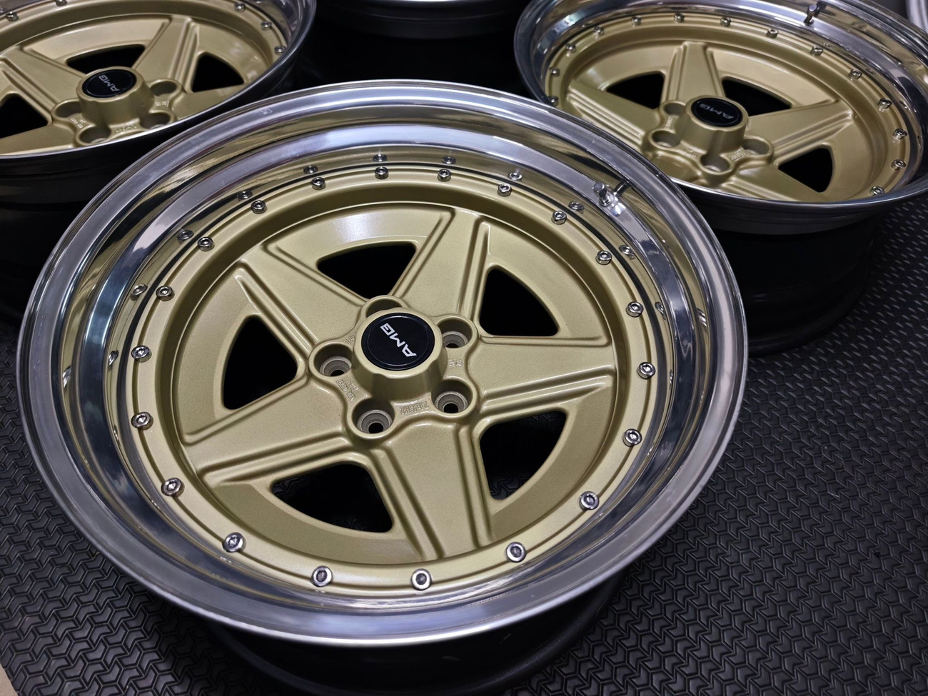 These staggered 18″ Penta wheels measure 8″ and 9″ in width and were custom-built for use on various Mercedes-Benz models. The wheels began as original AMG Penta wheels by ATS and were converted to a 3-piece design allowing for custom sizing. Finished in gold with a polished lip, these wheels feature a 5x112 bolt pattern and an offset of +24. The centers still show original AMG stamps and KBA part numbers. The barrels and lips are made by OZ Racing and four premerger AMG center caps are included. These custom 18" wheels are now offered by the seller in Thailand and worldwide shipping quotes are available upon request.