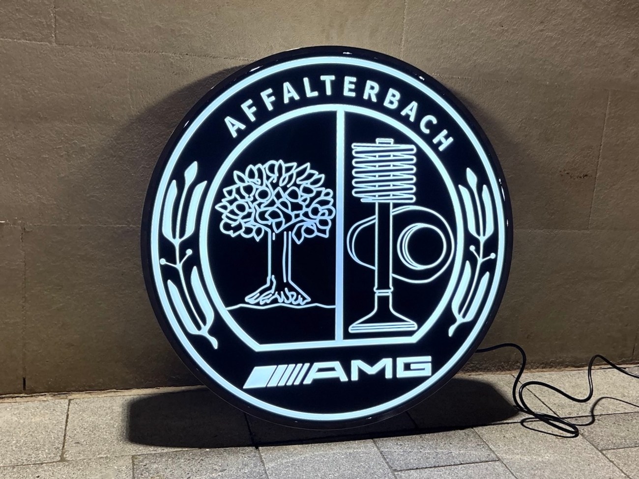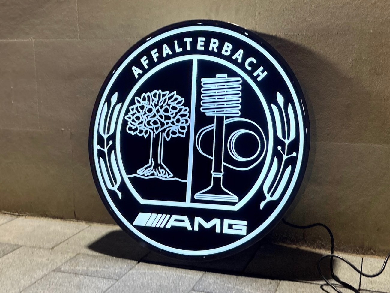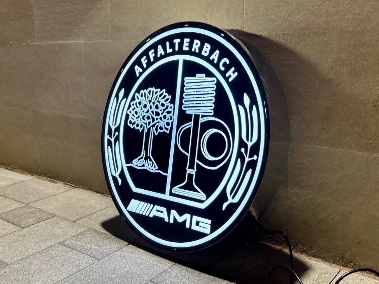 As AMG was founded in Affalterbach, Germany, the company logo features imagery from the city’s coat of arms as well as a cam, valve, and valve spring. This single-sided sign features a black translucent plastic face displaying the Mercedes-Benz AMG logo set within a black-finished metal enclosure. The sign measures approximately 26″ in diameter by 5″ deep. Five mounting holes are located on the back of the sign.