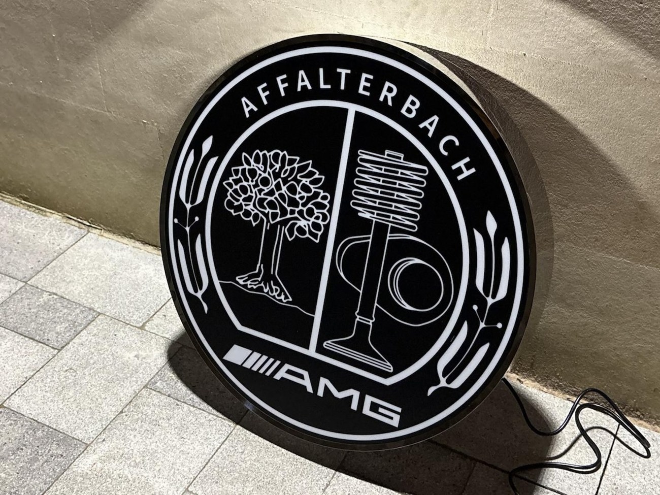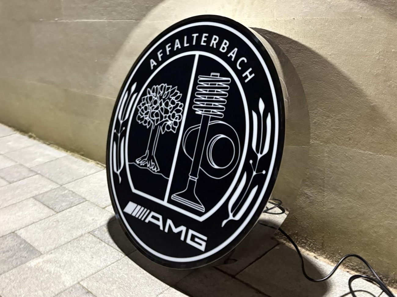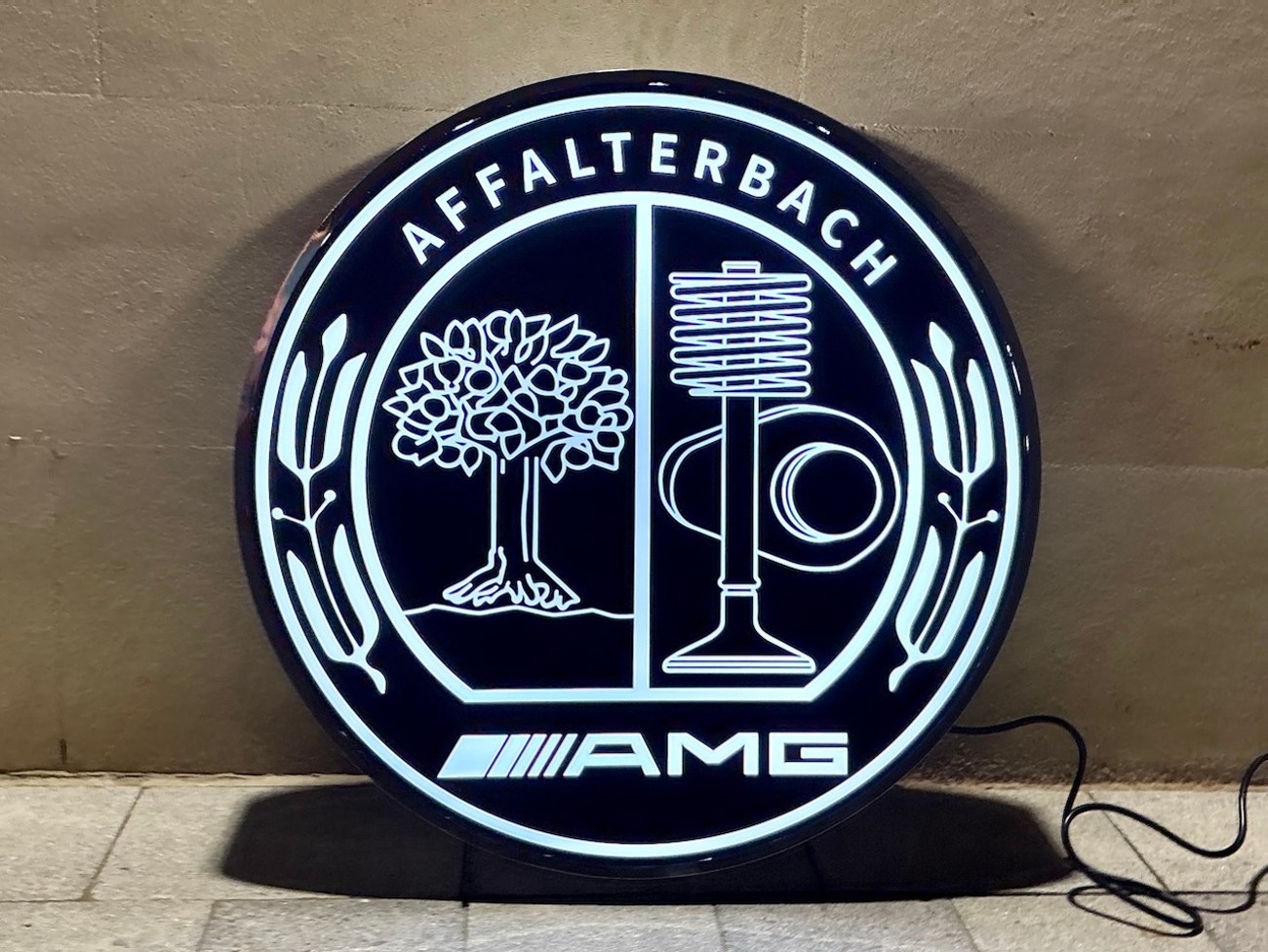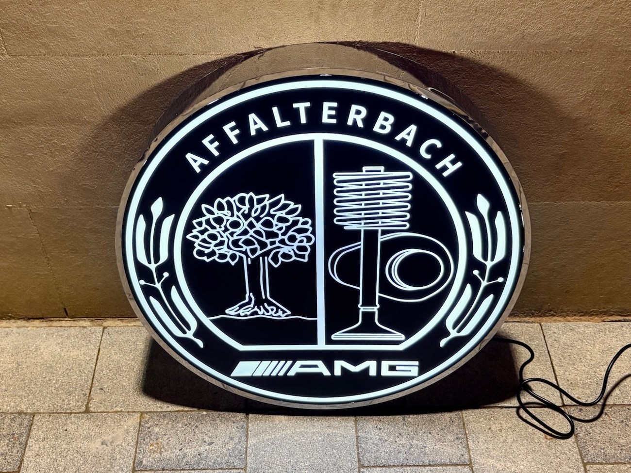 As AMG was founded in Affalterbach, Germany, the company logo features imagery from the city’s coat of arms as well as a cam, valve, and valve spring. This single-sided sign features a black translucent plastic face displaying the Mercedes-Benz AMG logo set within a black-finished metal enclosure. The sign measures approximately 26″ in diameter by 5″ deep. Five mounting holes are located on the back of the sign.