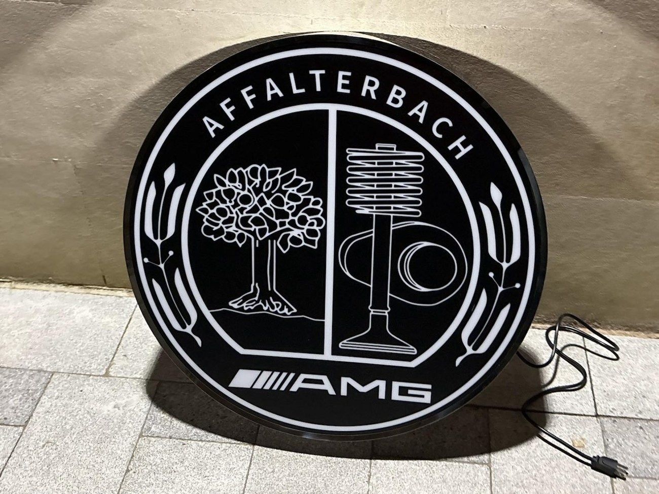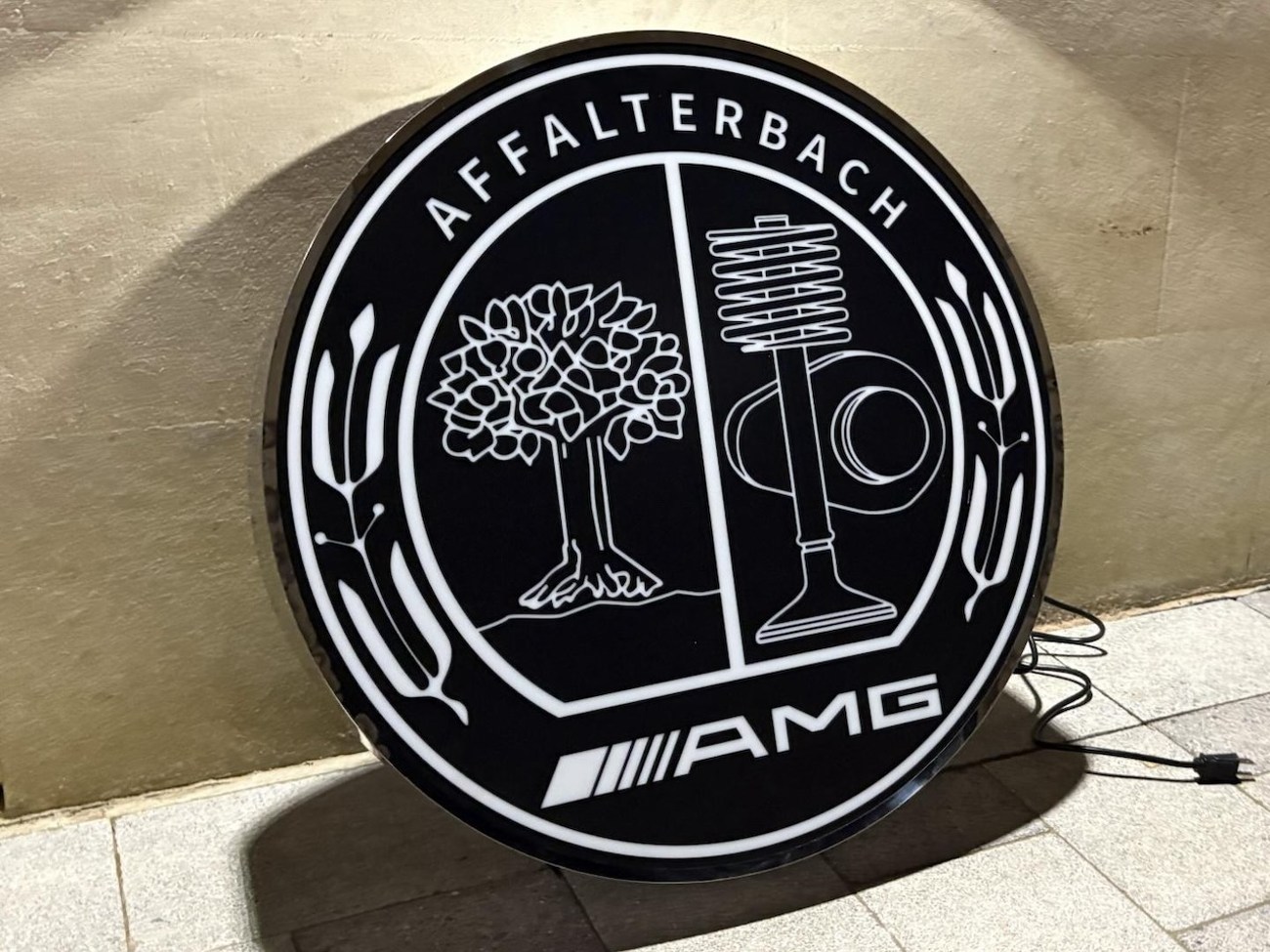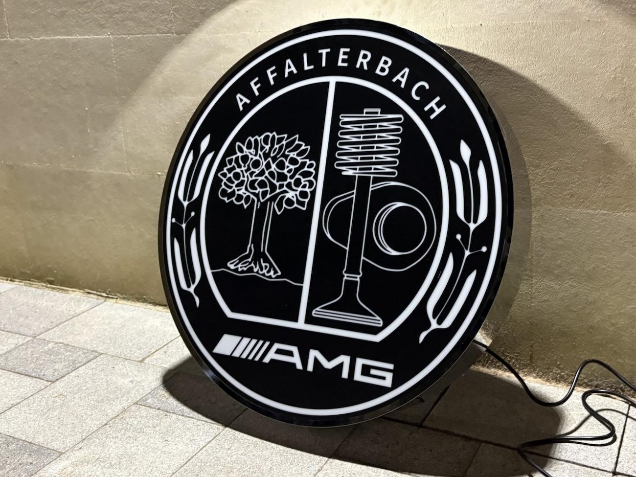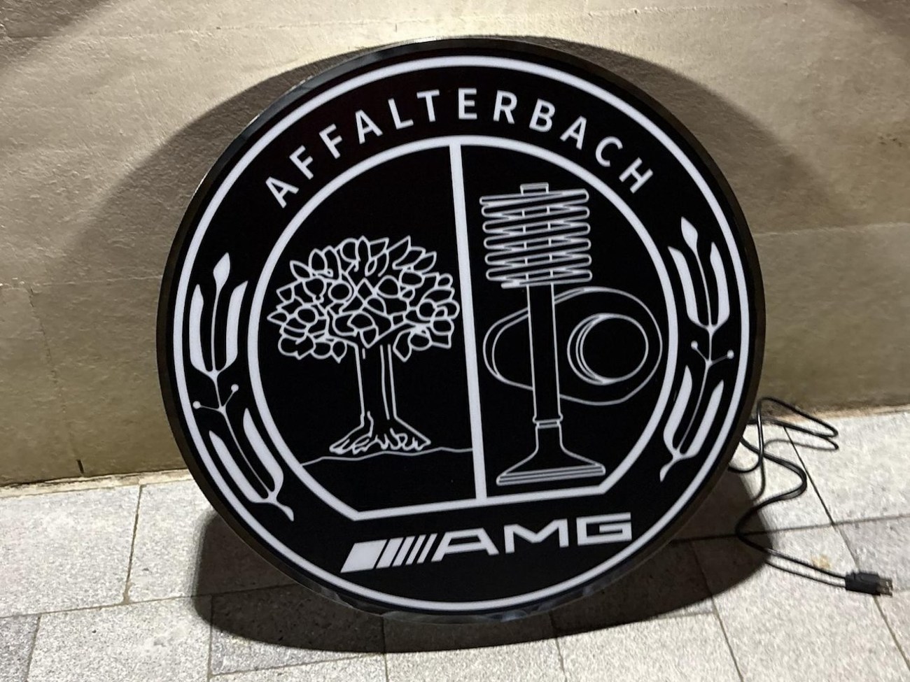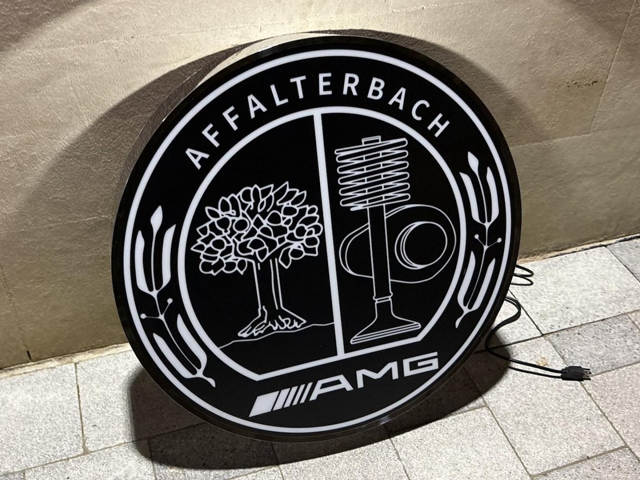 This illuminated Mercedes-Benz-AMG sign measures 26” in diameter and 5" in thickness. It shows the AMG crest on one side of the sign while the back is painted white. The face is made from translucent black plastic that allows the sign details to be back lit by LED lights. The buyer is responsible for shipping, handling, and fees, and the seller is willing to accommodate shipping needs by crate or pickup in person. This authentic Mercedes-Benz sign is now offered by the seller in Minneapolis, MN.